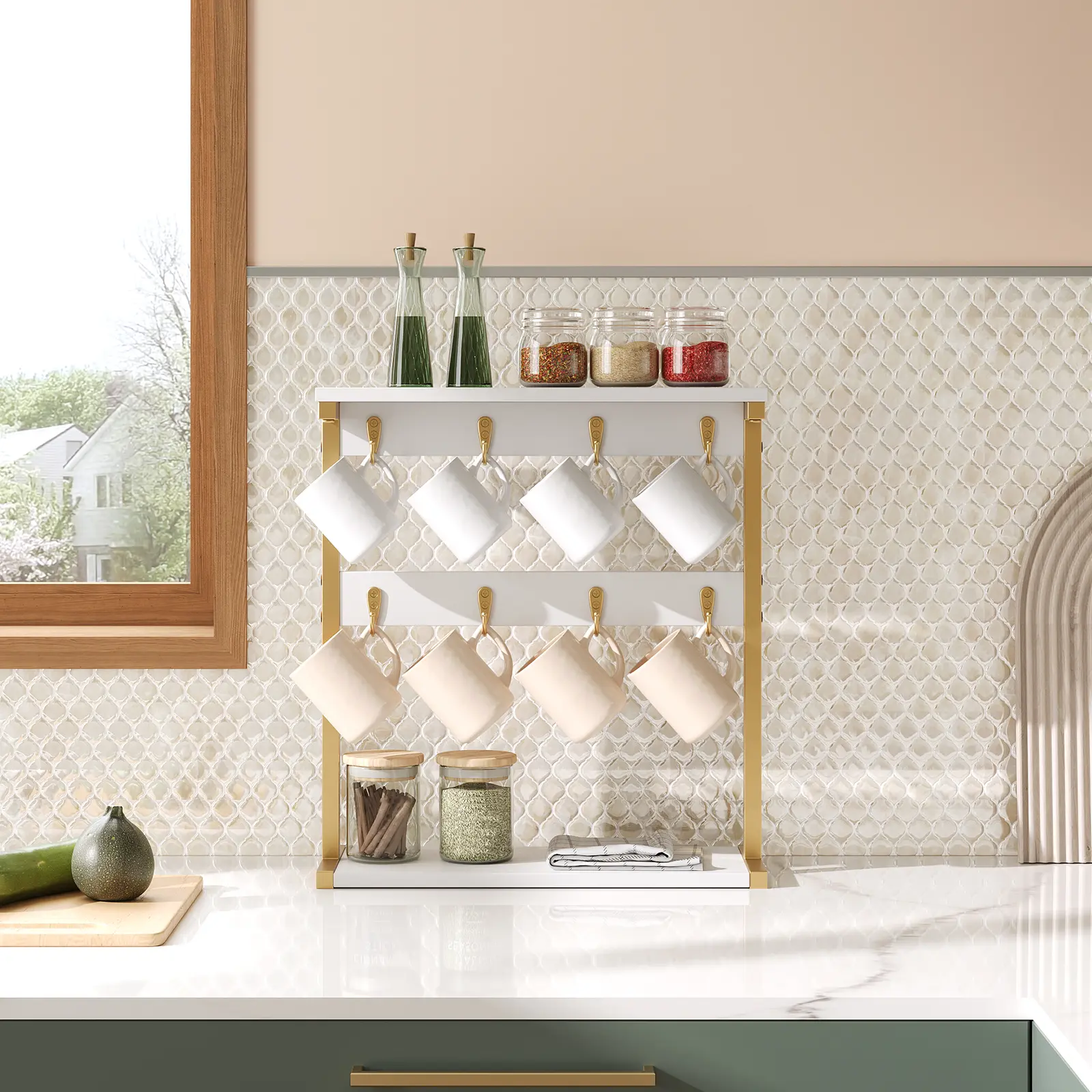 ·Two Storage Options: This mug holder stand has 8 hooks that can hang mugs, coffee cups or tea cups etc. and 2 open shelves as the reasonable place for goblets or wine cups, so that you can prepare your favorite drink at any time