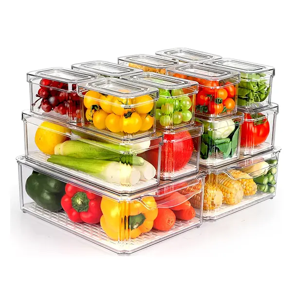 ·14 PACK FRIDGE ORGANIZER:2 pcs large size 12×12×3.75 inch, 4 pcs medium size 10.5×3.8×3.5 inch, and 8 pcs small size 5×3×3 inch. The large container suitable for storing more and mixed vegetables; 4 medium containers are perfect for cucumber, carrot, and spaghetti; 8 small containers are perfect for storing fruit for one person