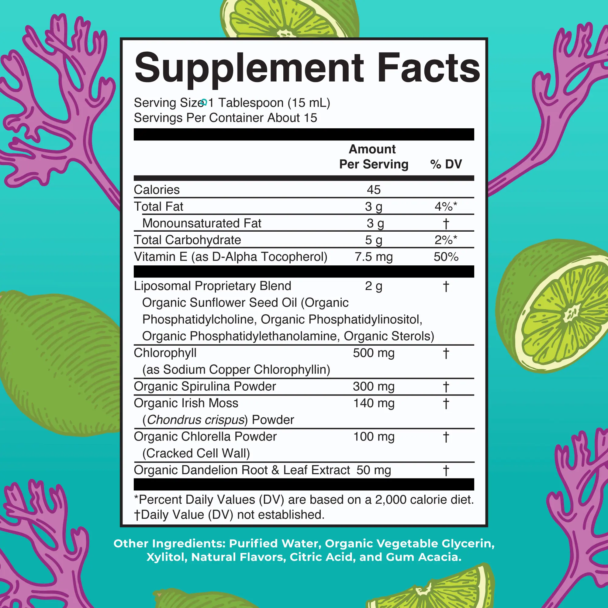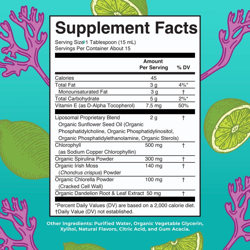 Sea Moss Supplement: We've taken some of the best parts of the ocean and wrapped them in an ultra-absorption delivery system! Enjoy this combo of superfoods spirulina and chlorophyll — plus chlorella and dandelion — in a delicious limeade-flavored liquid that is sure to be a great and tasty addition to your daily routine!