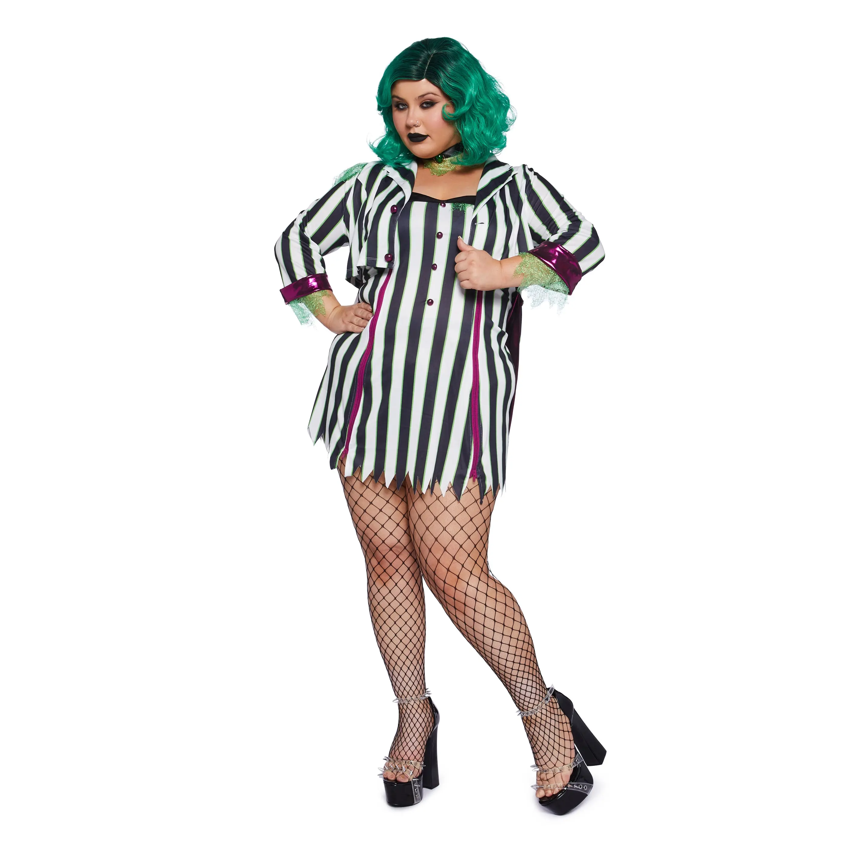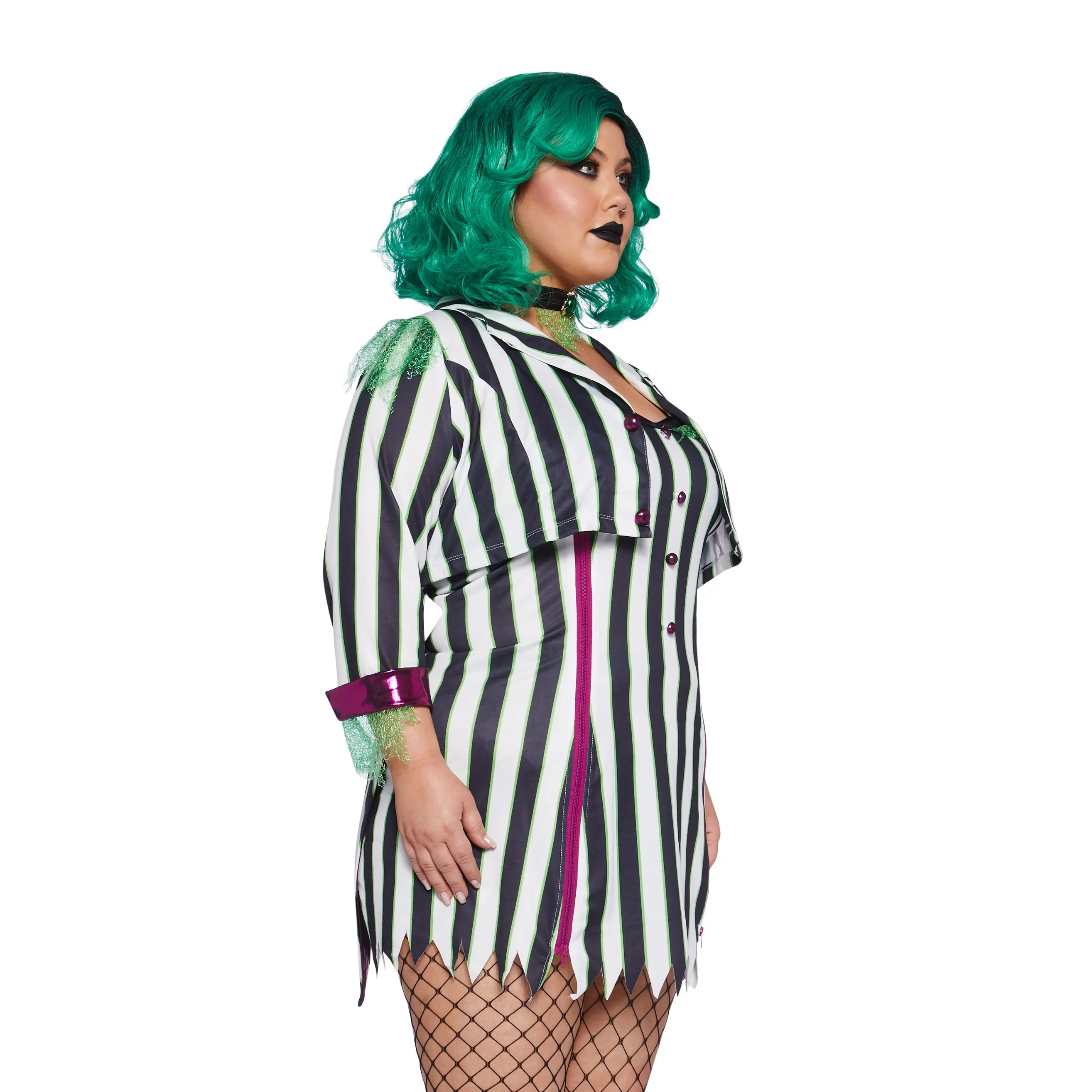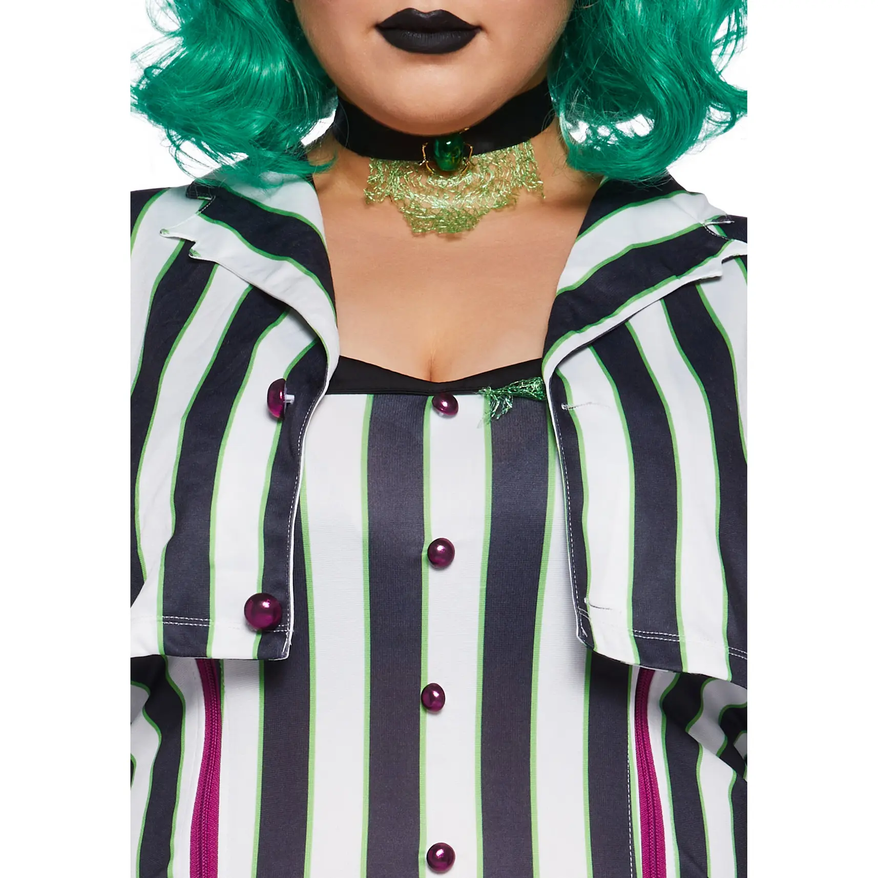 never trust the living! This undead exterminator costume set has a striped print all over, stretchy metallic accents, and lace trim. Includes a mini dress with front zip closures and adjustable shoulder straps, a ¾-sleeve jacket with front button closures and a tuxedo hem, and a matching satin choker with a rhinestone spider detail and a hook-and-loop closure.