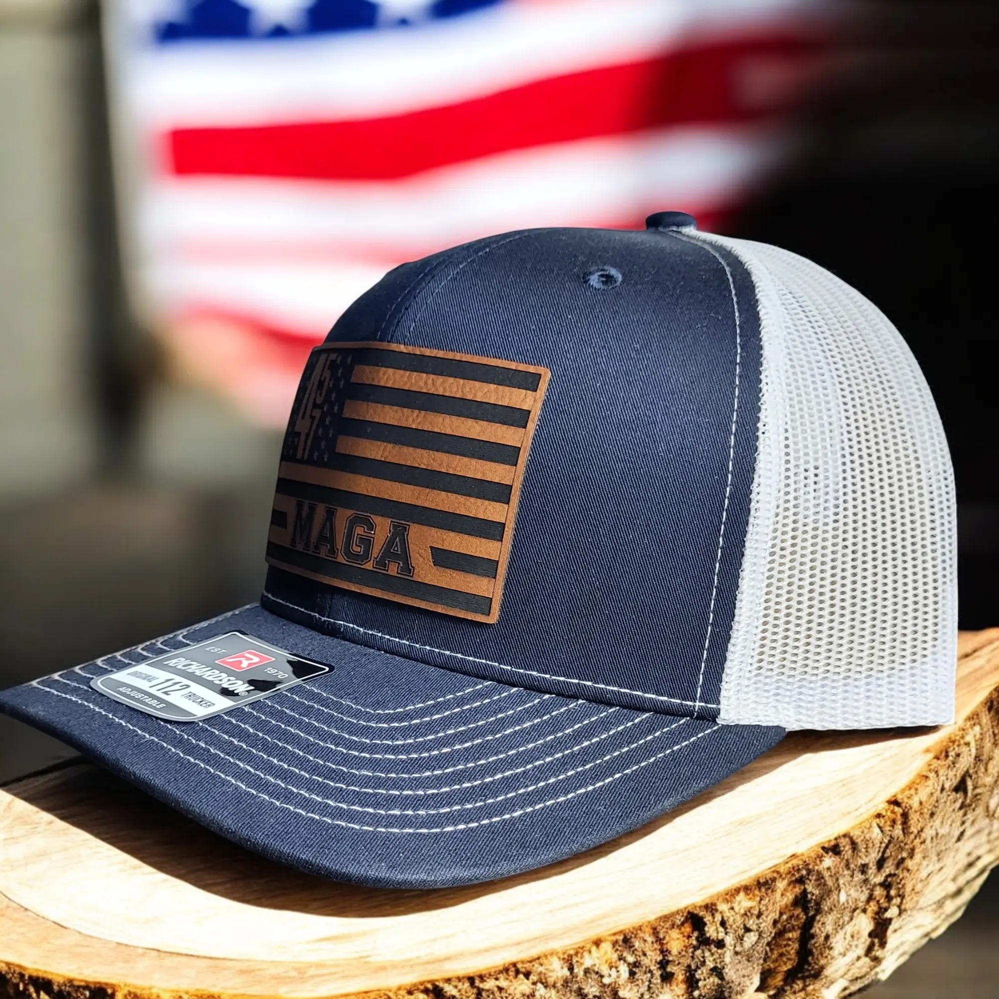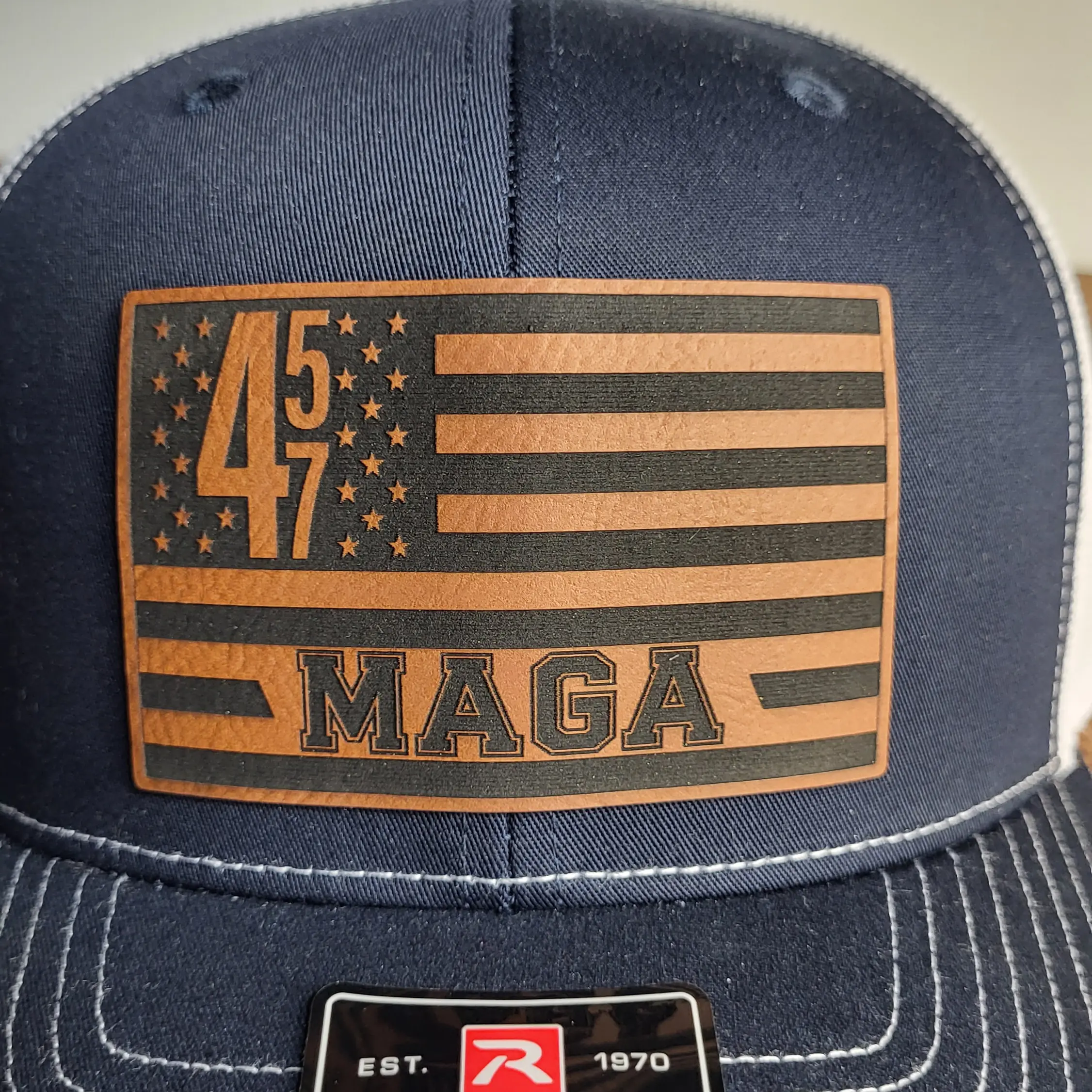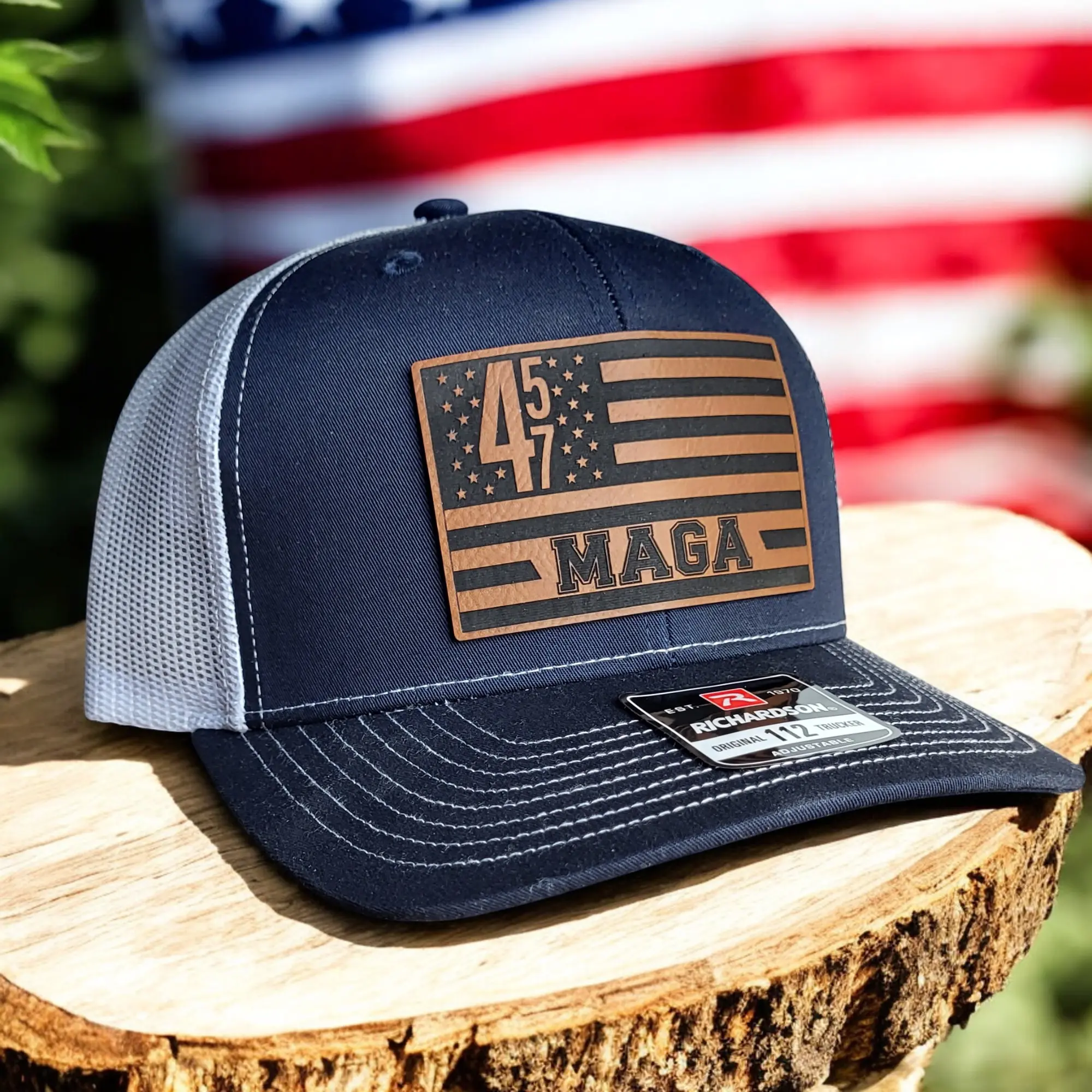 Celebrate the MAGA victory with one of these awesome Trump 45 / 47 American Flag snapback trucker hats.