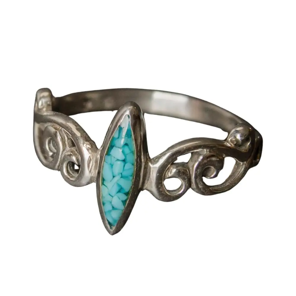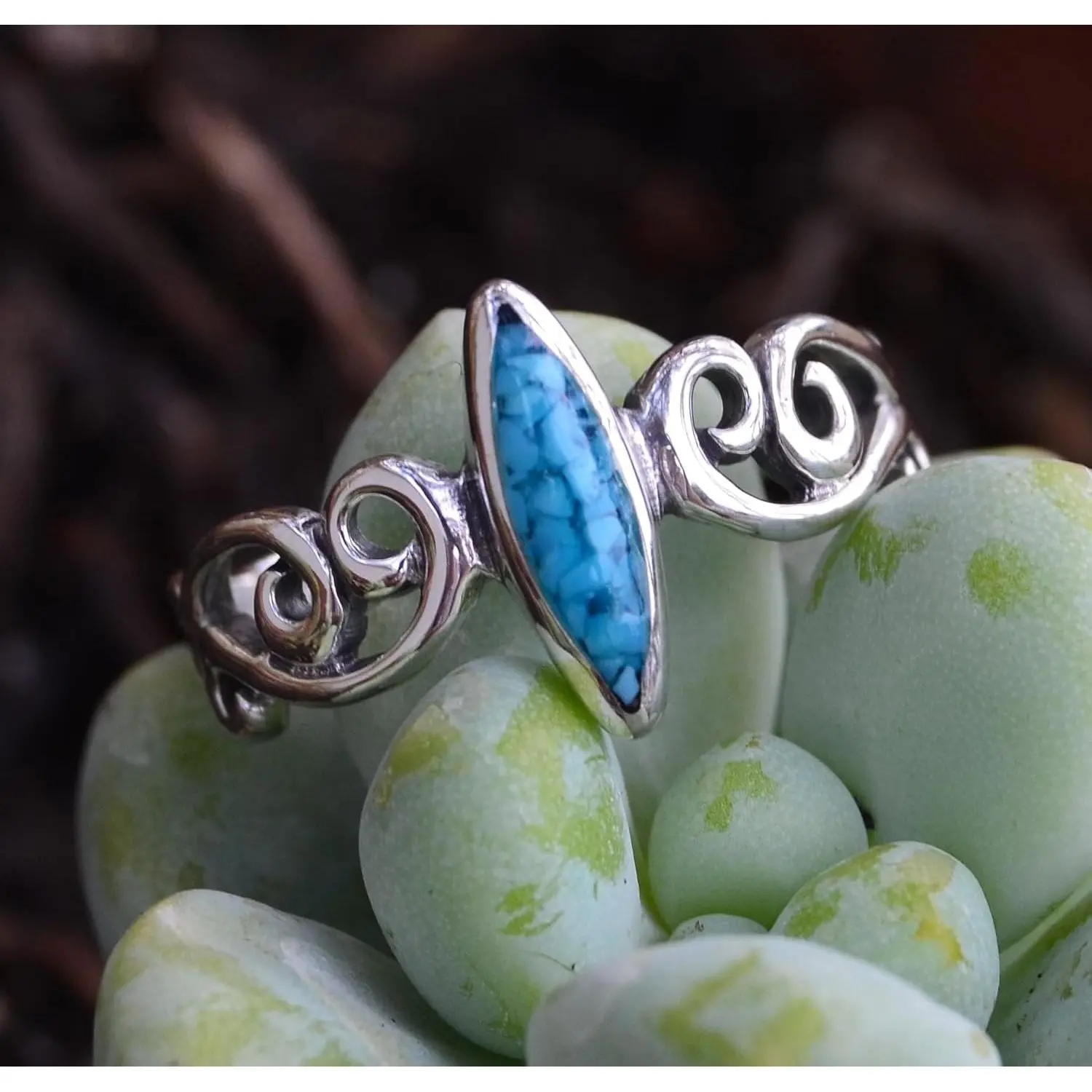 925 sterling silver ring inlaid with turquoise with an elongated marquise shape surrounded by silver scrollwork. The marquise area measures approximately 3/8 inch tall by 1/8 inch wide and the ring is available in a size 6.5.