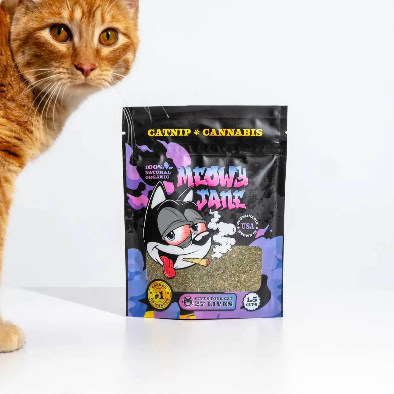 Chock-full of only the best parts of the catnip plant, our Meowy Jane high-test organic catnip contains only the leaf and the flower...making it some pretty kitty-luring green stuff! It's just the stuff to get any party started! Zoom on, little floor muffins!! Can be used on a cat's favorite toy or just give 'em the nip. Comes in a zip-sealed plastic bag for ultimate freshness! Made in the USA.