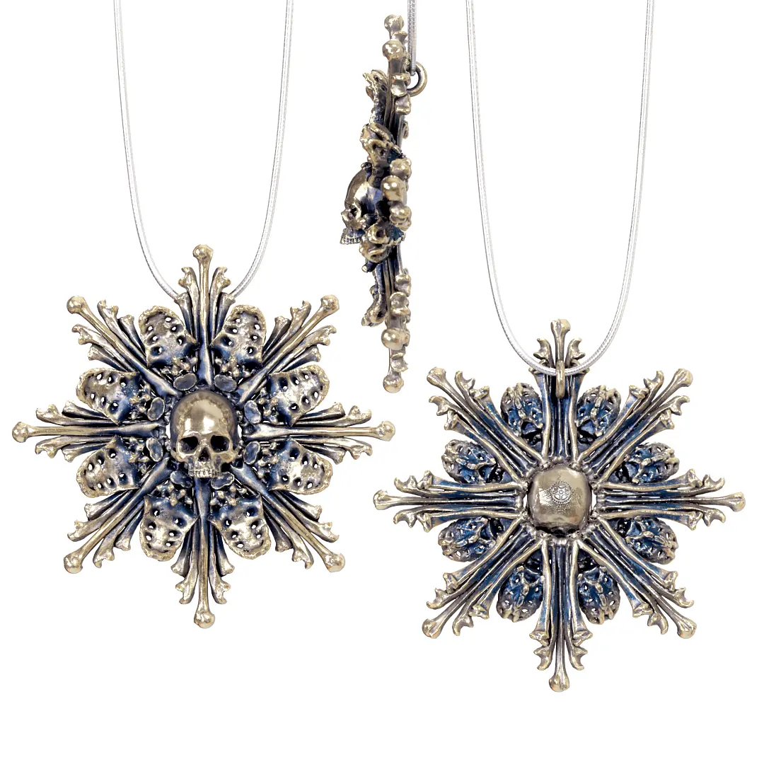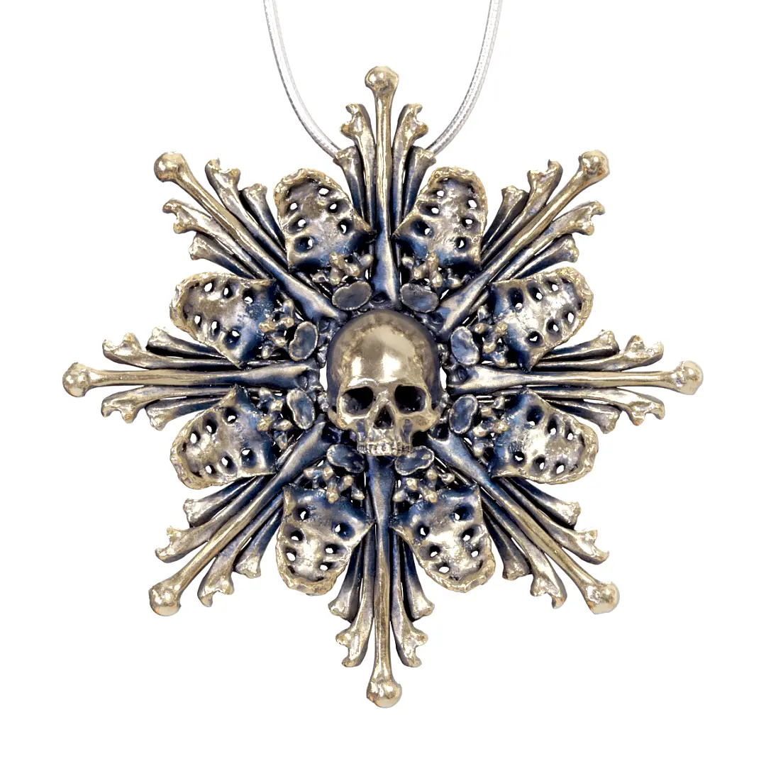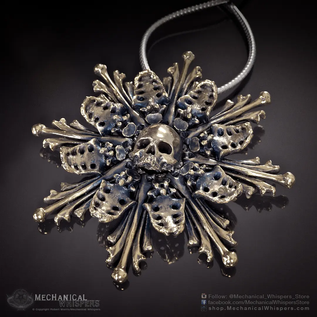 Unique jewelry from the Mechanical Whispers Catacomb Collection, inspired by European catacombs and ossuaries. This is a monstrance design after the impressive bone decorations at the Sedlec Ossuary in Kutná Hora, Czech Republic. Designed from actual human bones and skull scans and prepared for 3D printing and casting with the highest detail possible.
