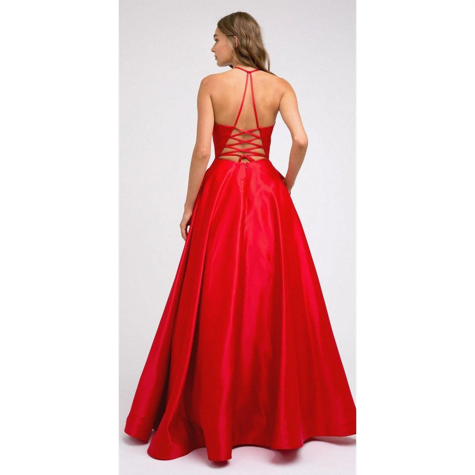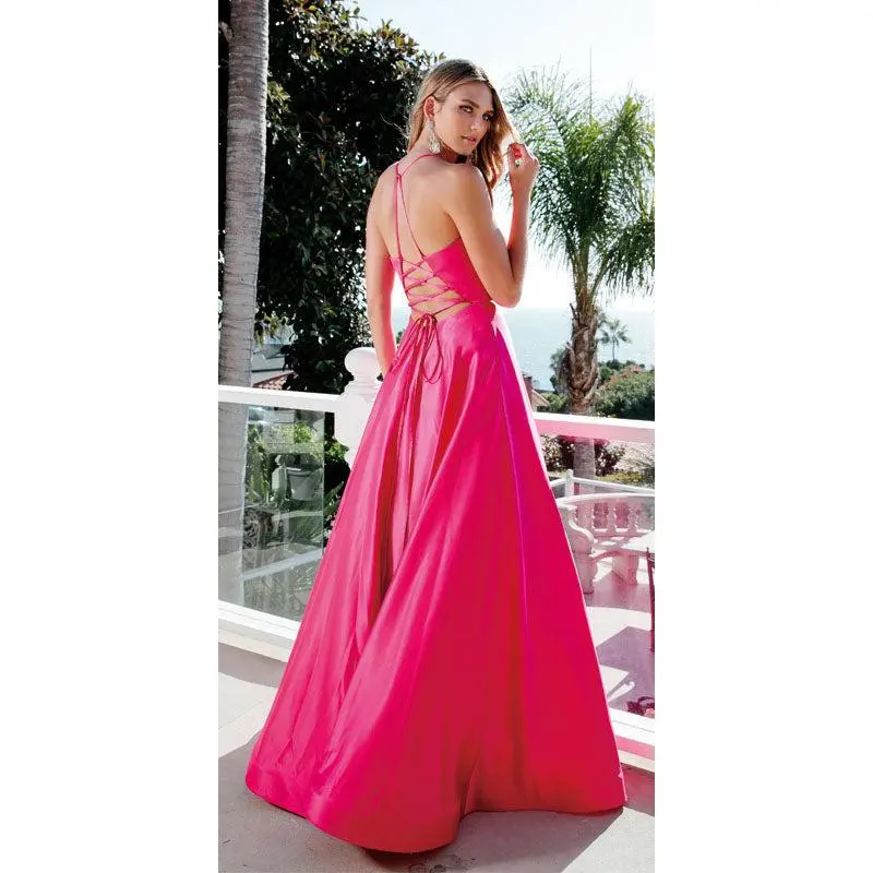 Enjoy the evening with this stunning silky satin floor-length dress by Juliet 230. An A-line ball gown with stylish lace-up back and plunging v-neckline added with side pockets for convenience. An enchanting outfit for prom, red carpet events, gala or awards night or in any other formal occasions!