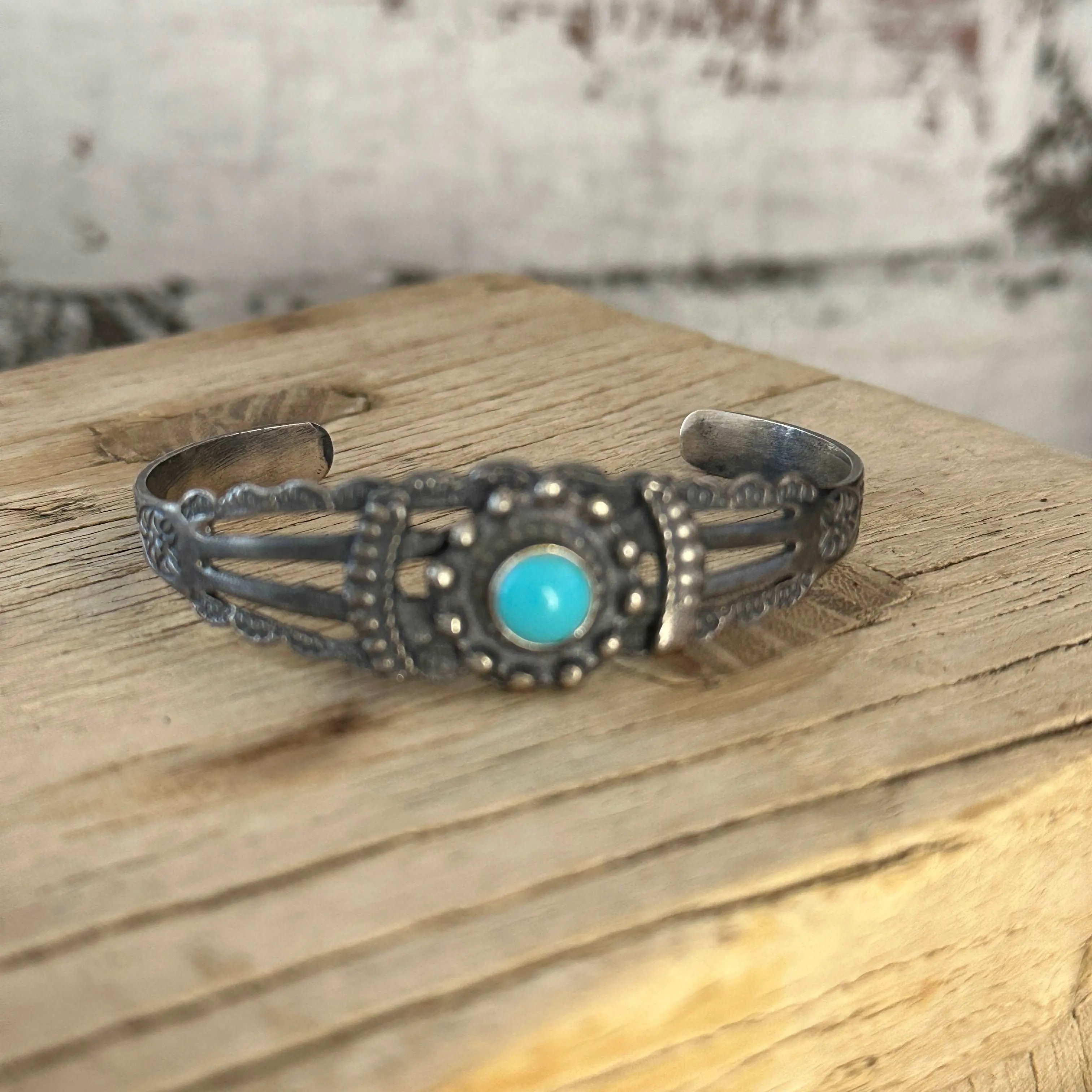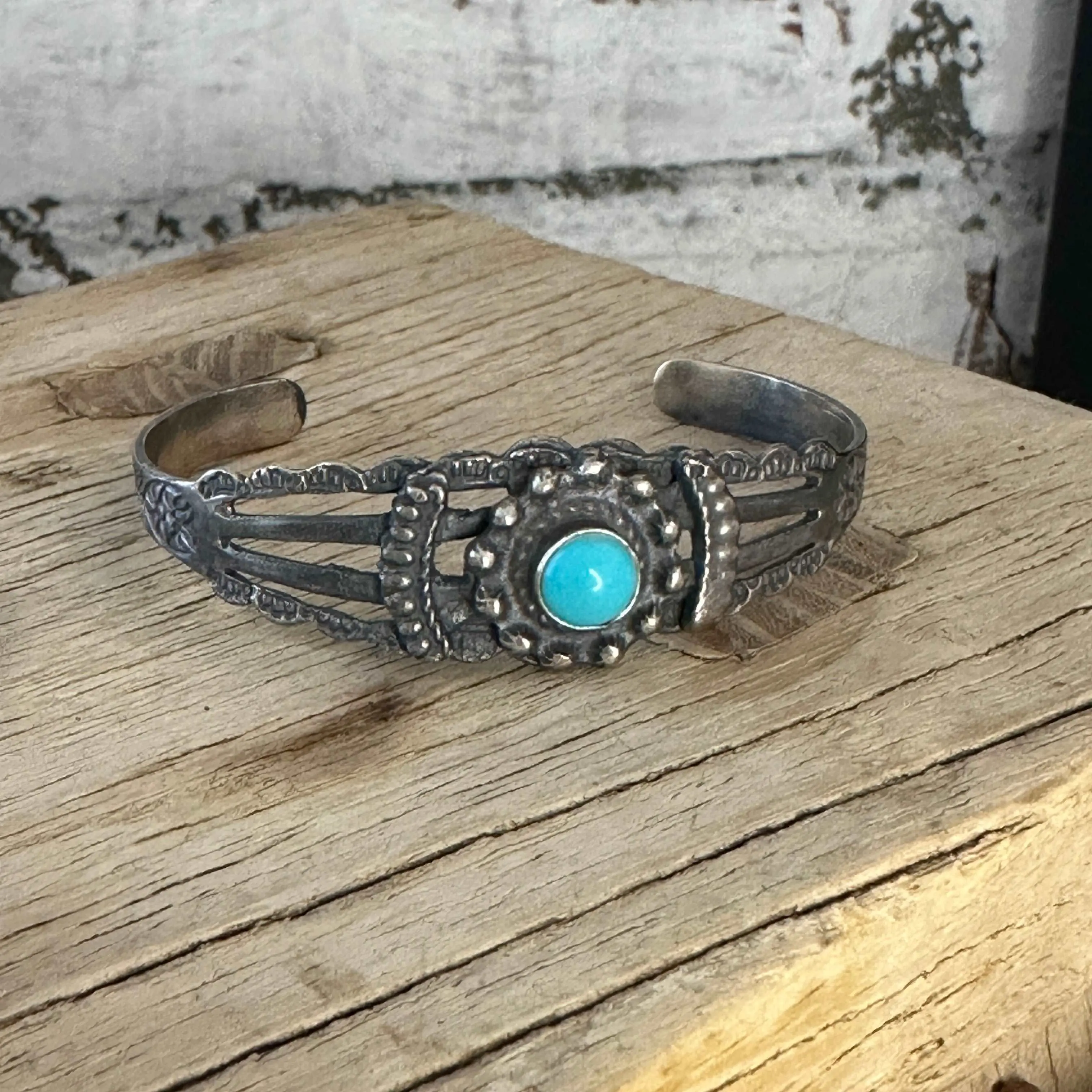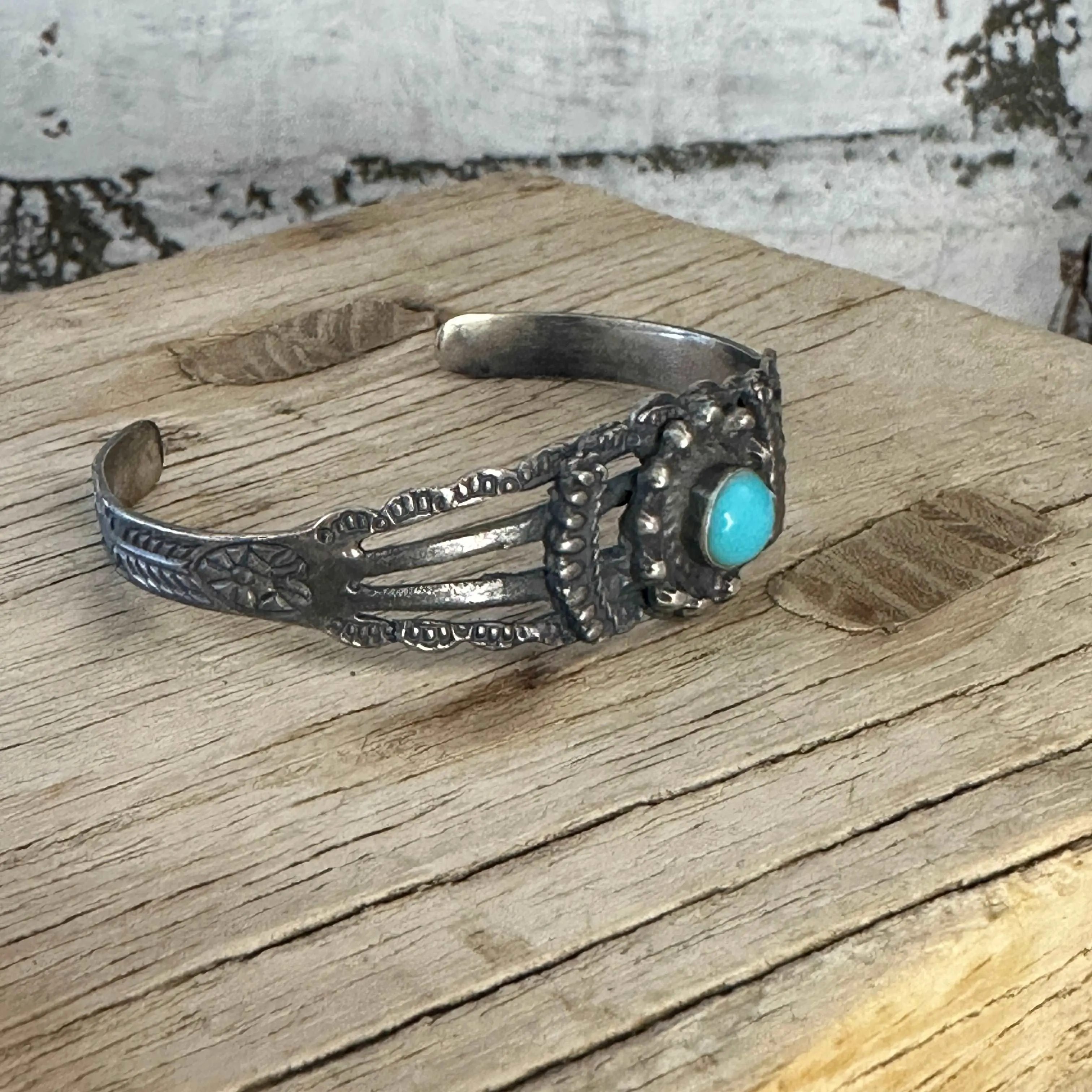 This Harvey Era (~1910’s-1940’s) Navajo sterling silver and turquoise cuff bracelet features beautiful stamp work detail and a petite turquoise stone. This bracelet will be shipped as pictured with its time-worn patina.
