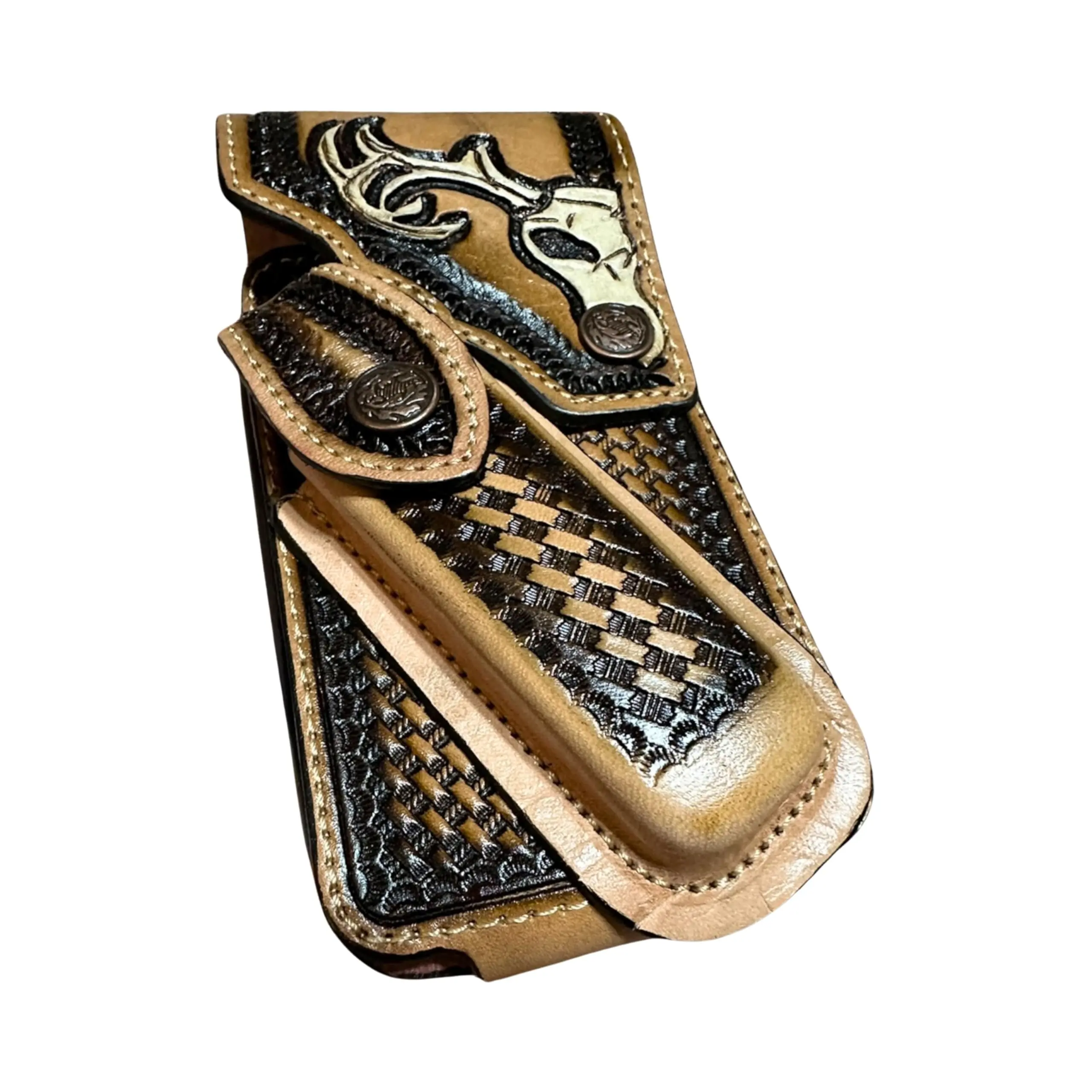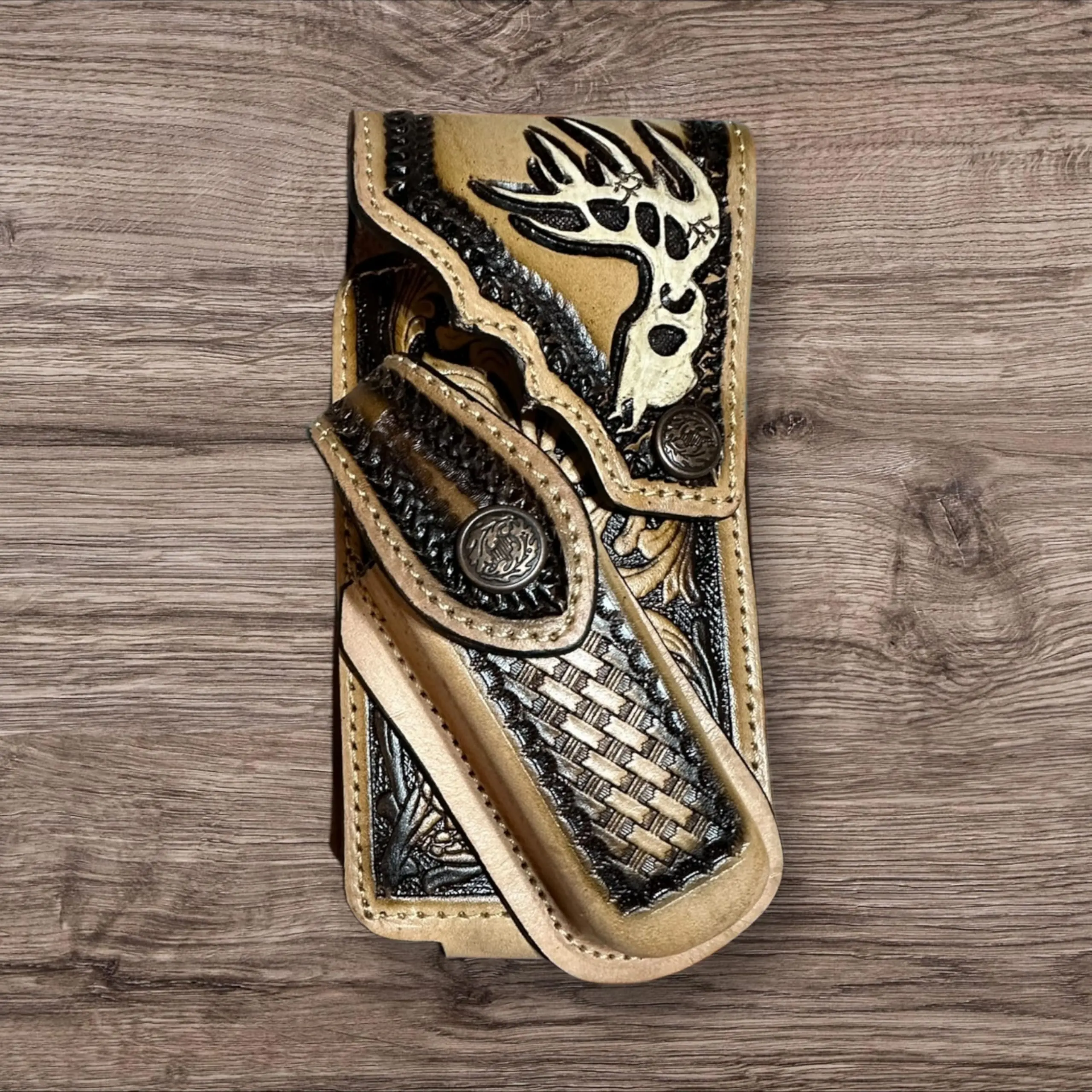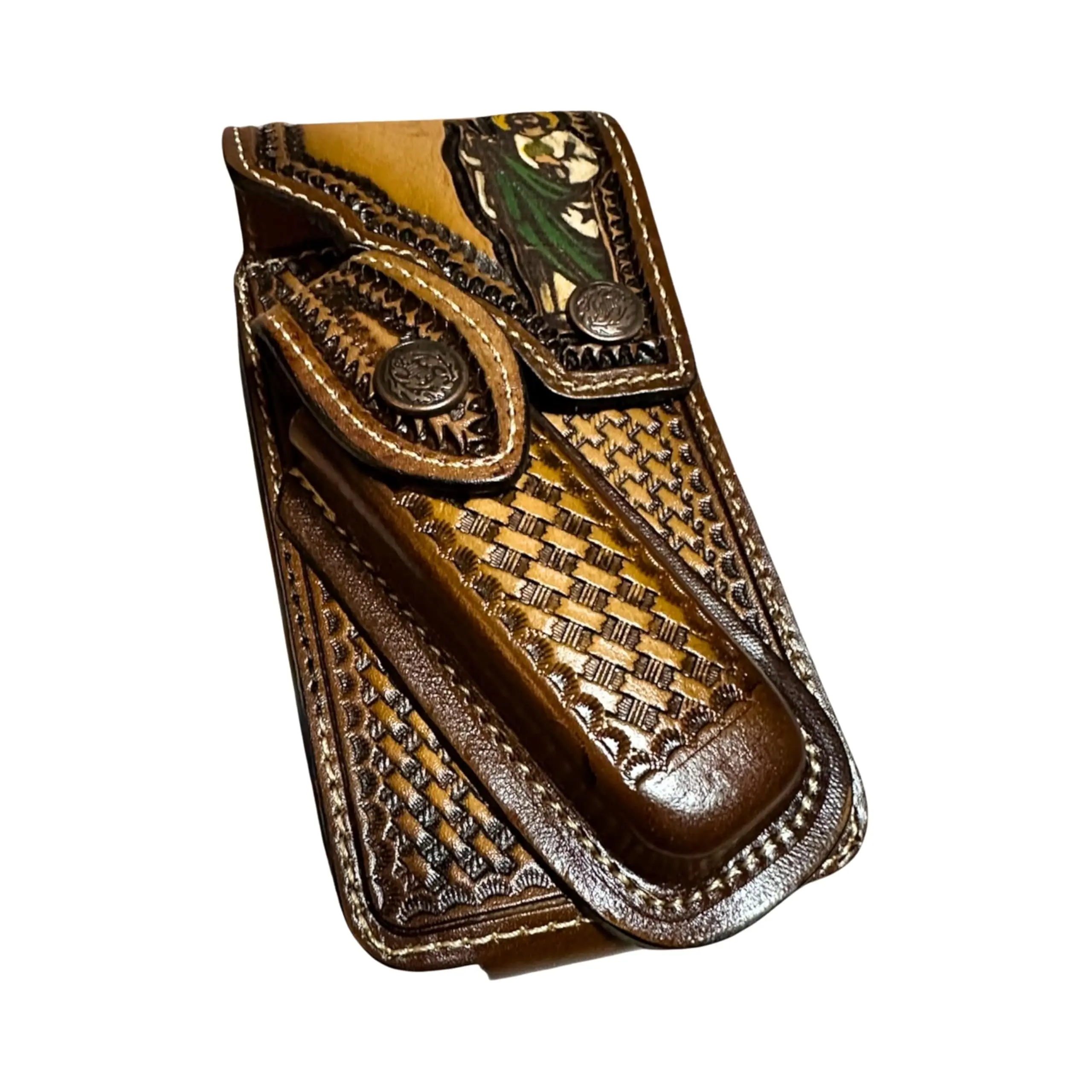 ·- Iconic Western Symbols: Adorned with intricate hand-tooled designs, including the Cowboy Deer Skull and Jesus motifs, this holster embodies the essence of Western charm.