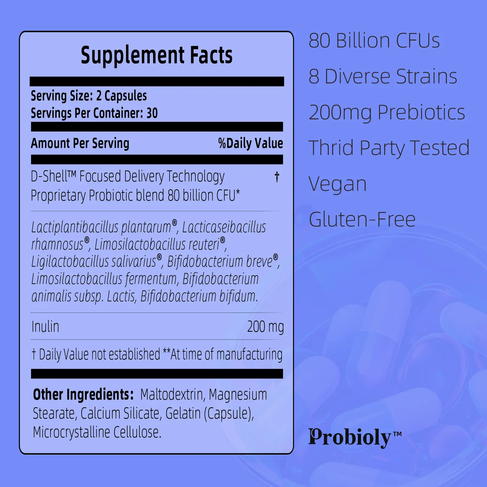 2-in-1 Prebiotic + Probiotic: Probioly Daily Synbiotic is formulated with 8 clinically studied probiotic strains and a patented, plant-based prebiotic fiber to nourish good bacteria and support optimal gut health. Delivers 80 Billion CFU for maximum effectiveness.