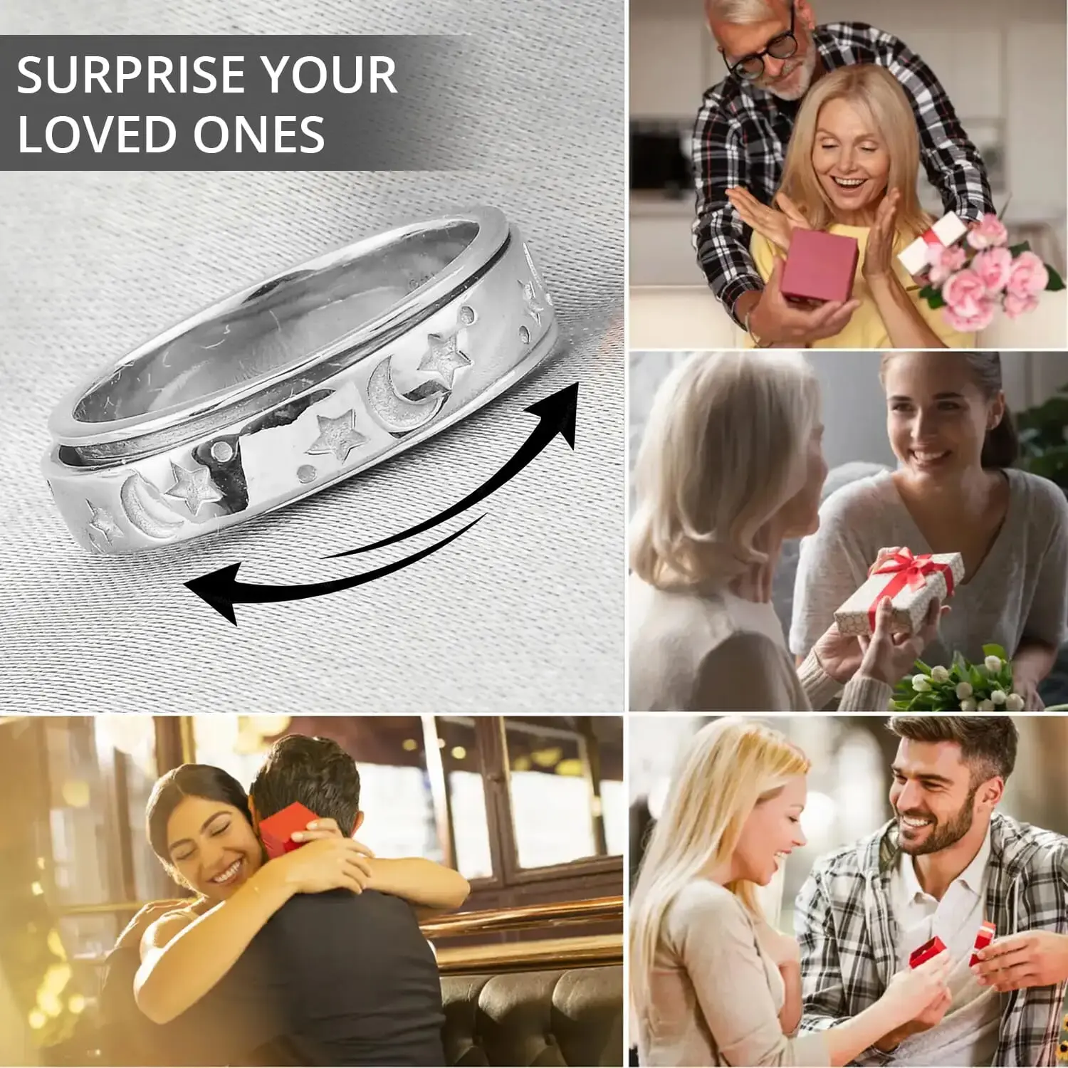 925 Sterling Silver Fidget Ring Women - Anxiety Ring Moon Star Spinner Ring Men Platinum Plated Jewelry Christmas Stress Relief Gifts for Women