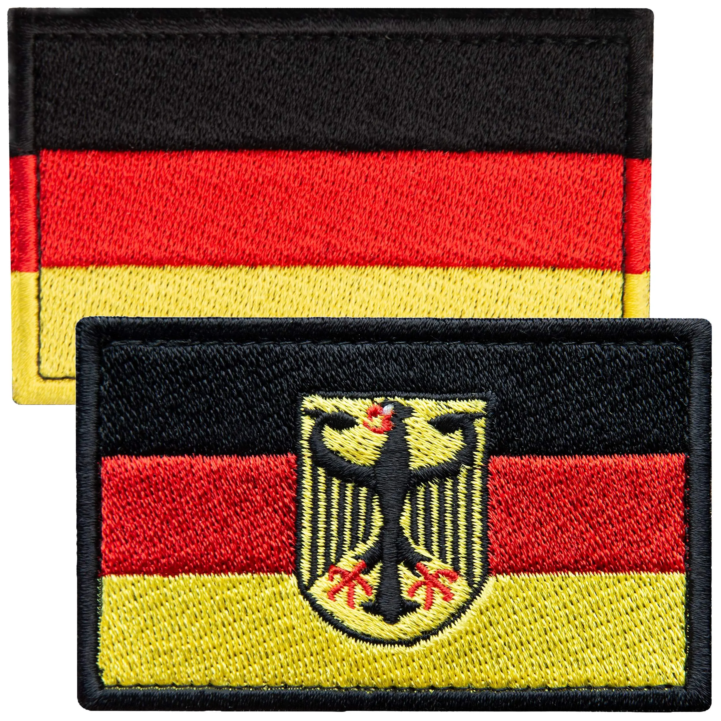 The detailed embroidery of these patches reflects authentic German artistry. The precise stitching of the black, red, and gold colors, along with the eagle shield, showcases Germany's proud heritage and craftsmanship.