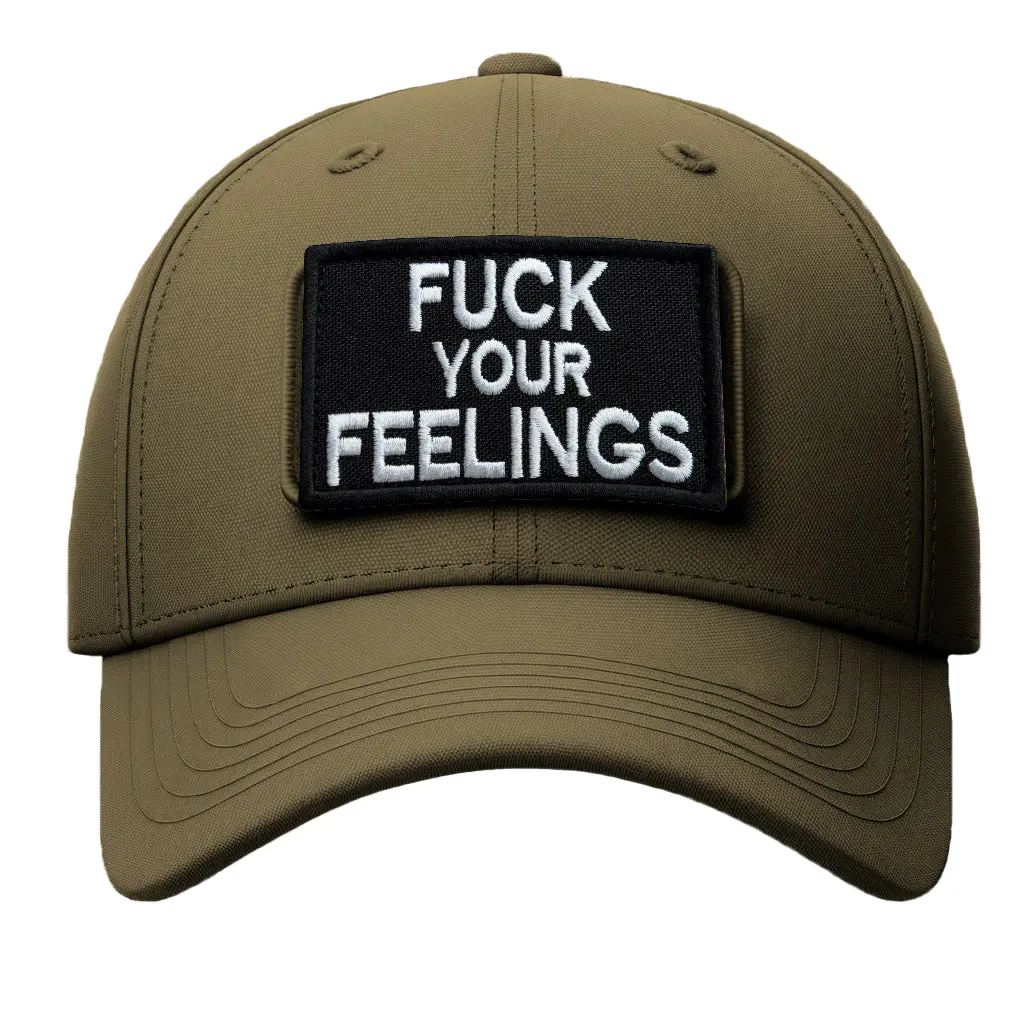 ·Design: Eye-catching phrase "Fuck Your Feelings" embroidered in bold lettering on a sturdy white background.