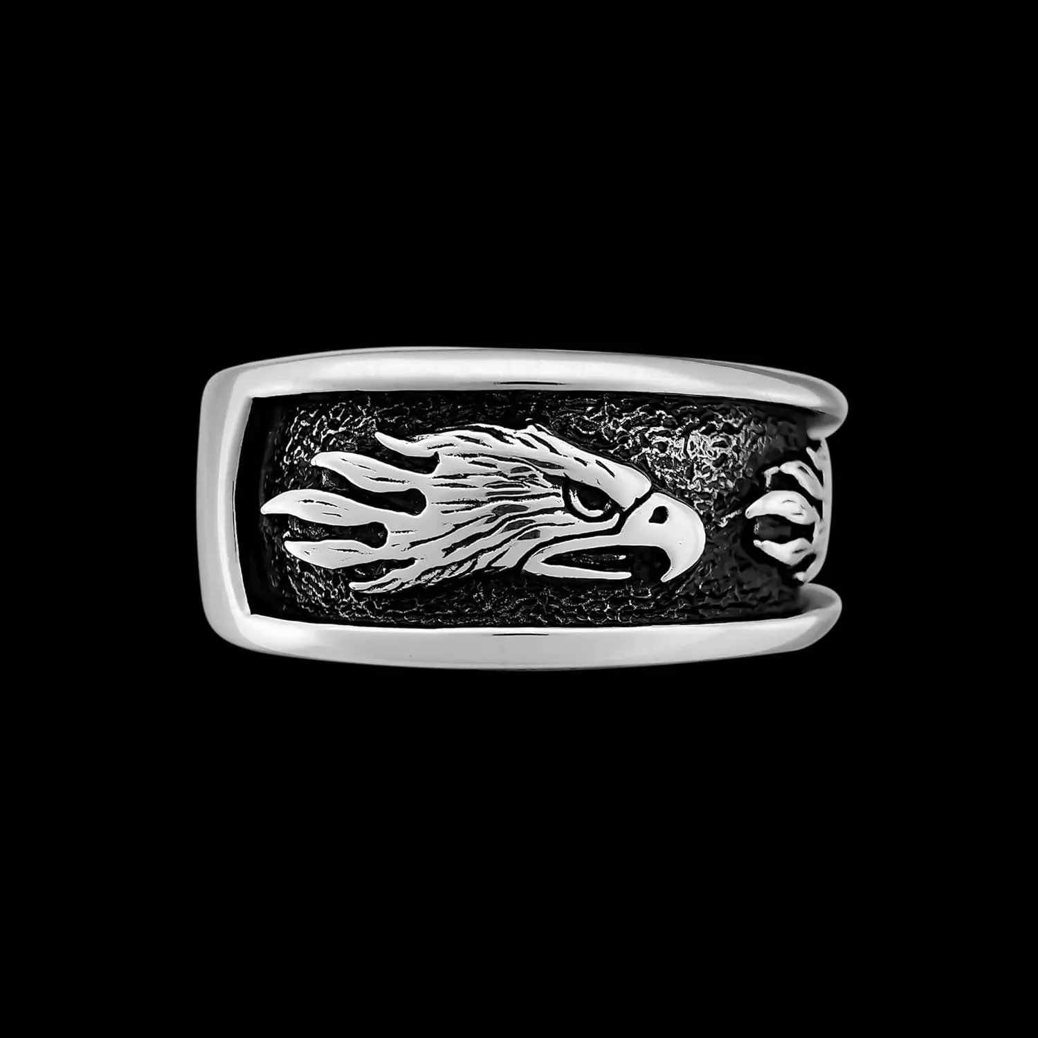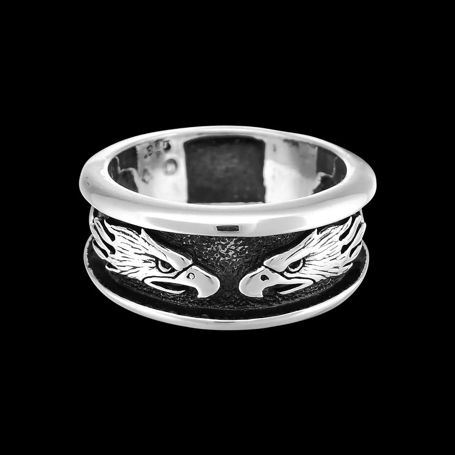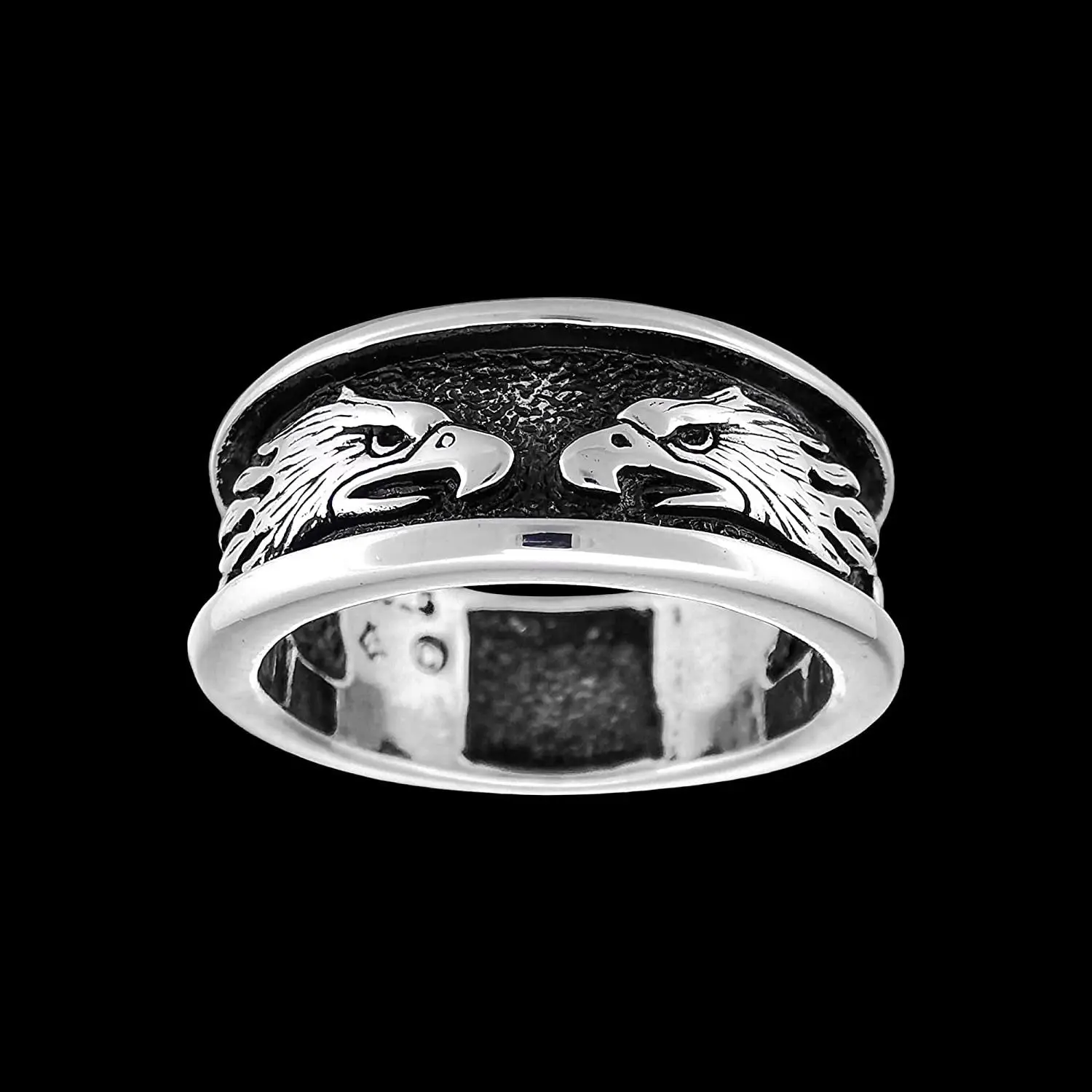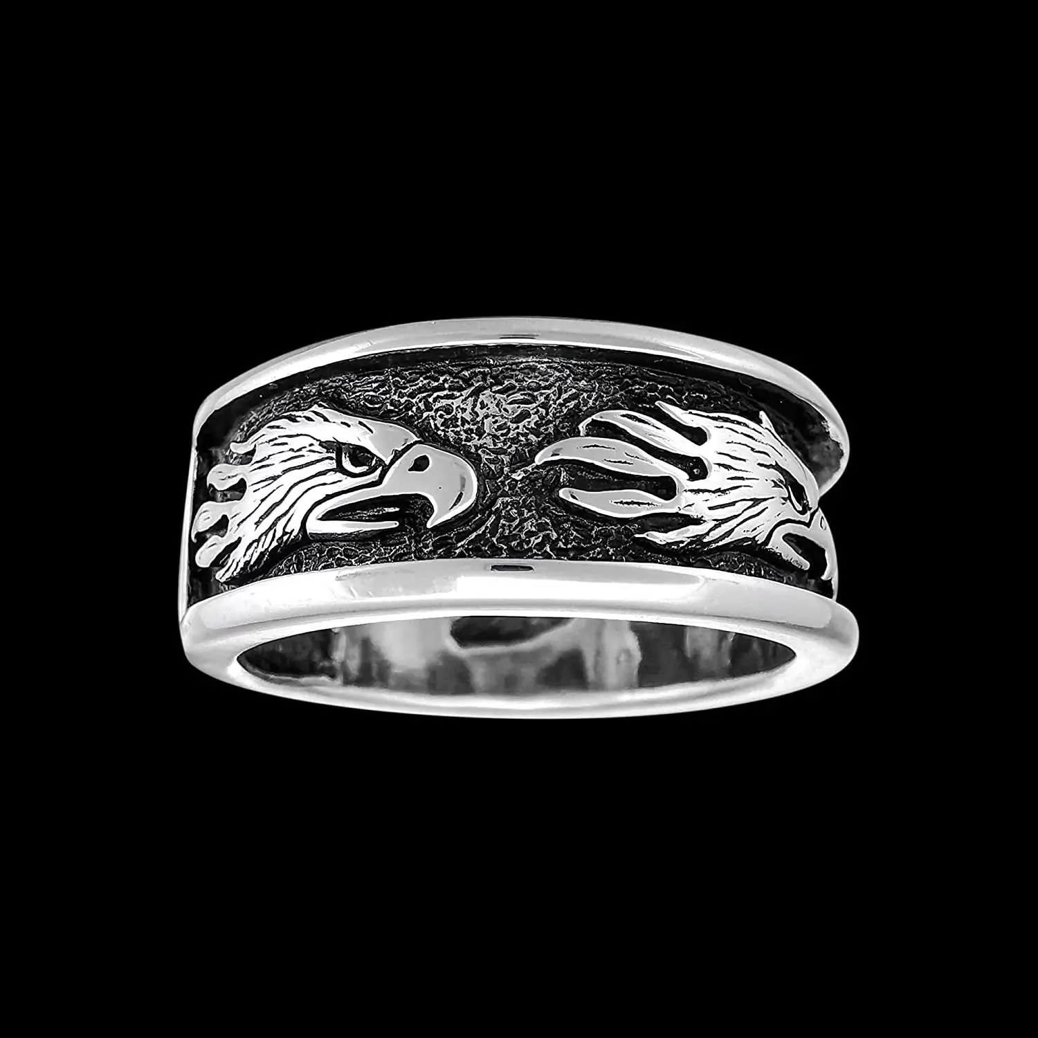 925 sterling silver bald eagle ring with multiple eagle heads around the band. This ring measures approximately 5/8 inch wide and each eagle head measures 1/2 inch long.