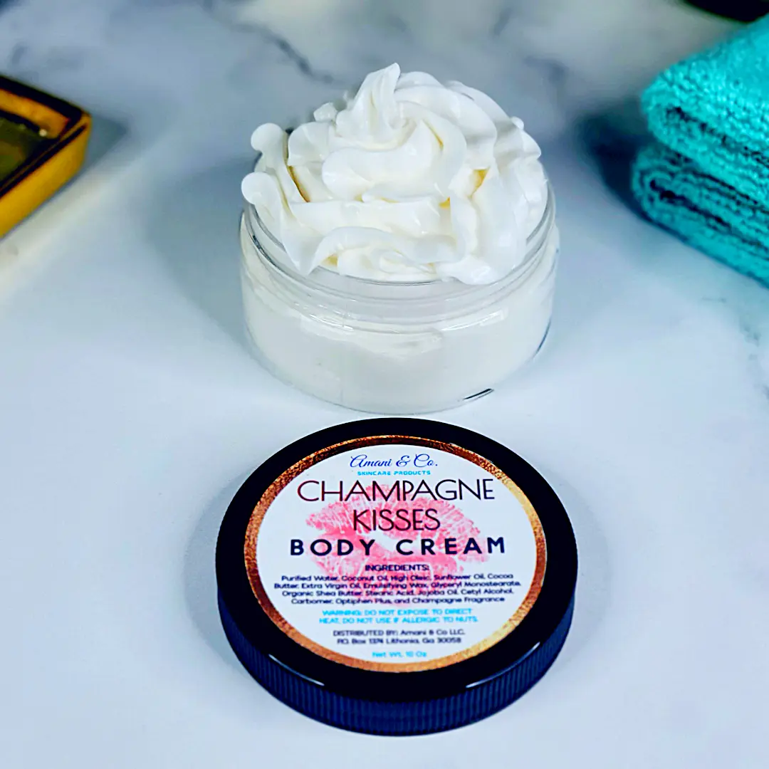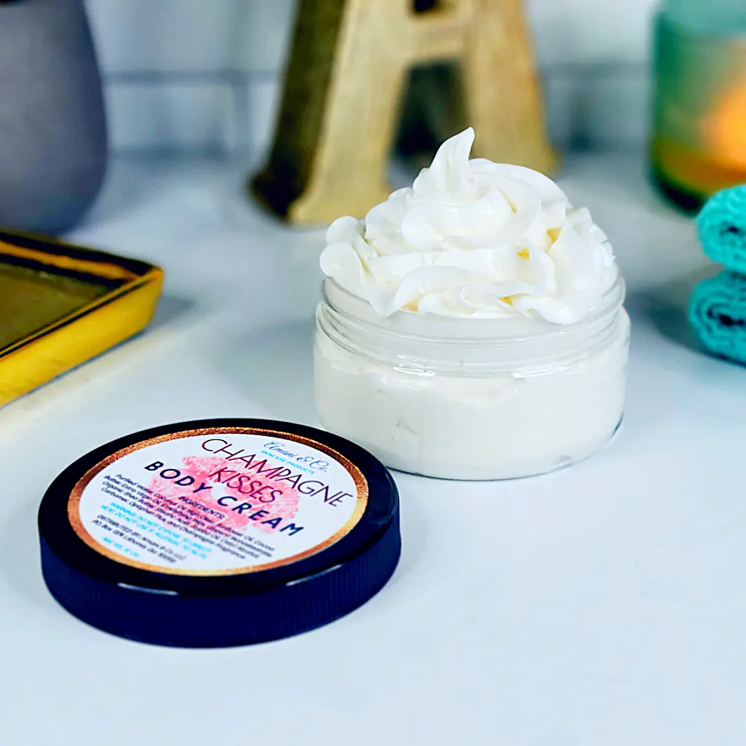 This rich luxurious shea butter cream contains ingredients to soothe and hydrate even the driest skin. Lightweight, but extremely hydrating. If you love our whipped shea body butters, then you will certainly love this blissful treat. The natural skin healing properties of this cream will allow you to experience immediate moisture to your dry skin. Our butter cream is very light, fluffy, and thick. Unlike our whipped body butters, our cream will not melt due to heat. Remember this is a body butter cream and not the same as our whipped shea body butter. Our butter cream is thicker and richer than lotion. The best part about using the butter cream is the quick absorption into the skin. Perfect for on-the-go usage. Instantly leaving the skin with a subtle glow and ultra-moisturized for hours. Your skin deserves to be rejuvenated with Champagne Kisses! This shea butter cream has a sparkling bubble scent mixed with a crisp champagne aroma. Top notes are delightfully blended with tangy grapefruit, champagne grapes and deep plum.