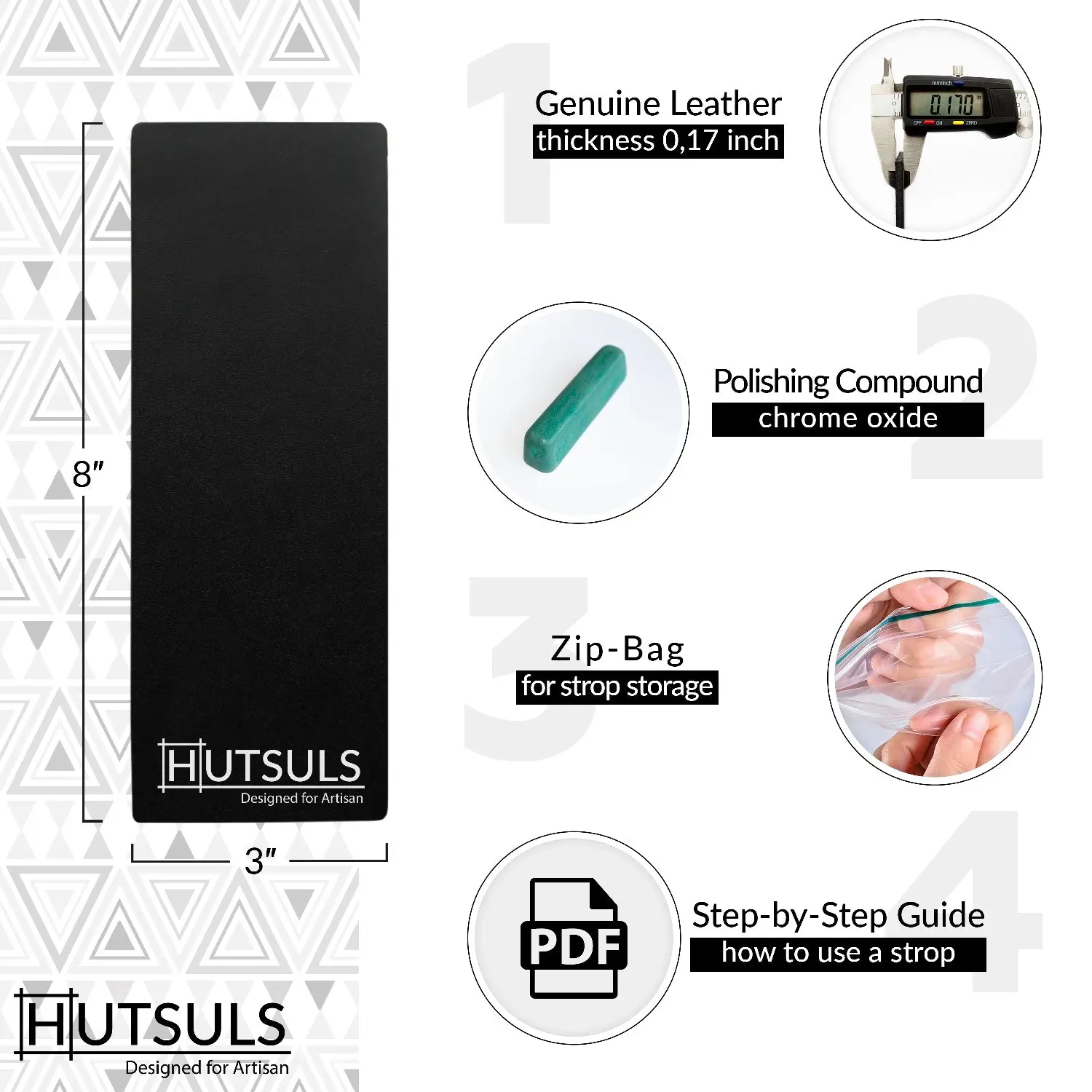 Effortless Use: Using this leather sharpening strop for knife is a breeze. This polishing leather is for professional and beginner use and includes a step-by-step knife leather sharpener guide