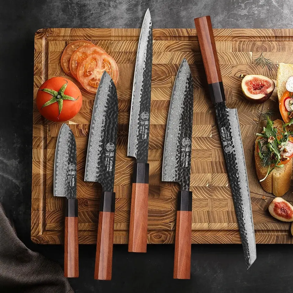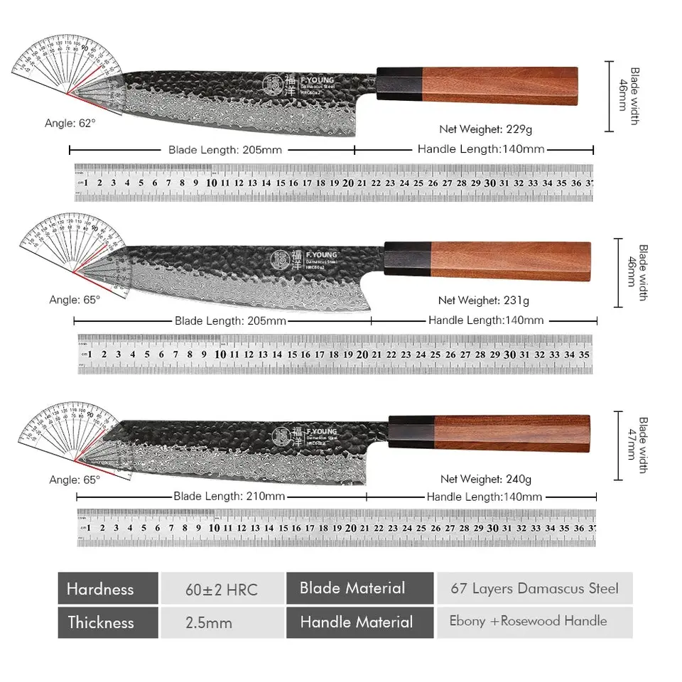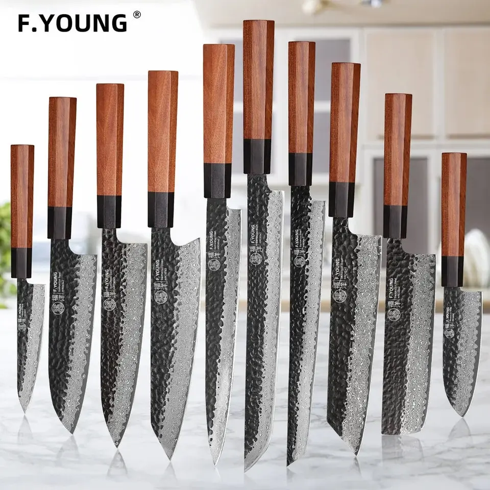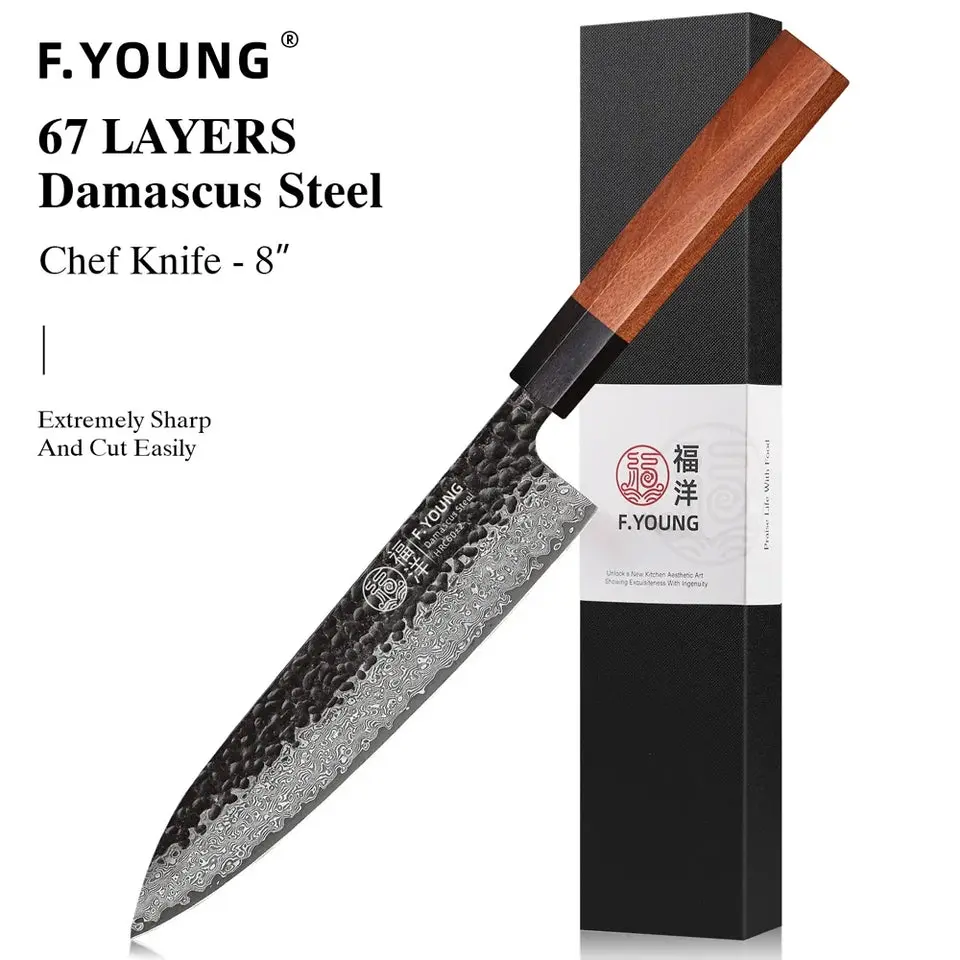 F.YOUNG Japanese Hand Forged Chef Knife Damascus Steel Kitchen Knives Vegetable Meat Slicing Sashimi Utility Cooking Utensils with Rosewood Octagonal Handle