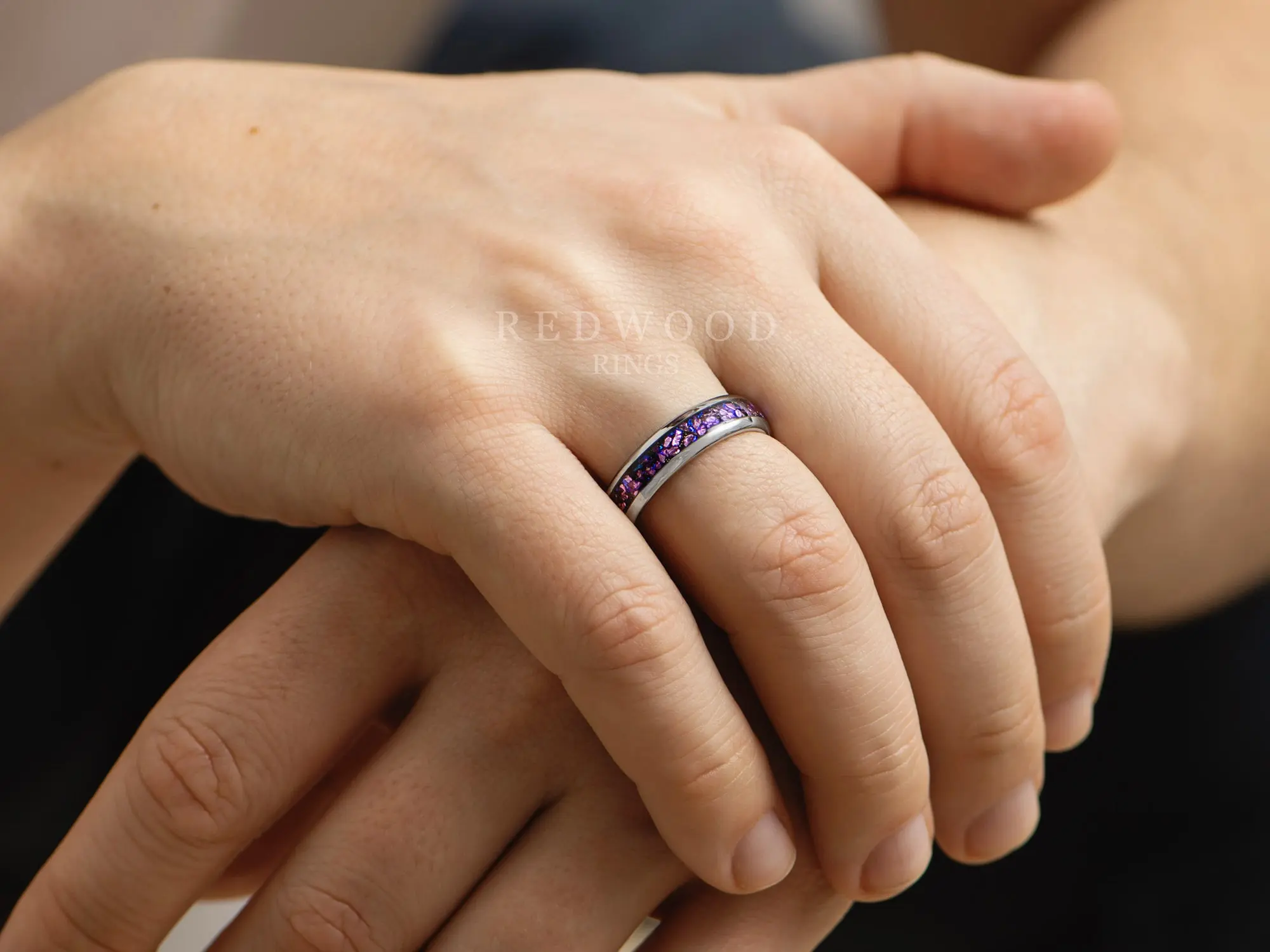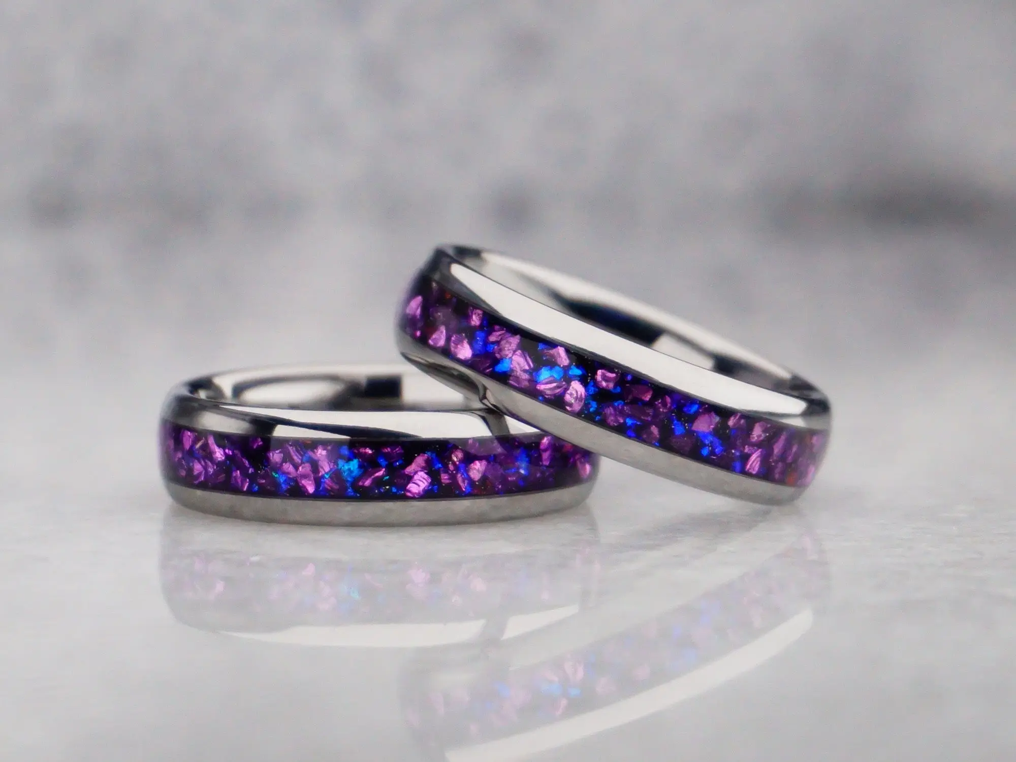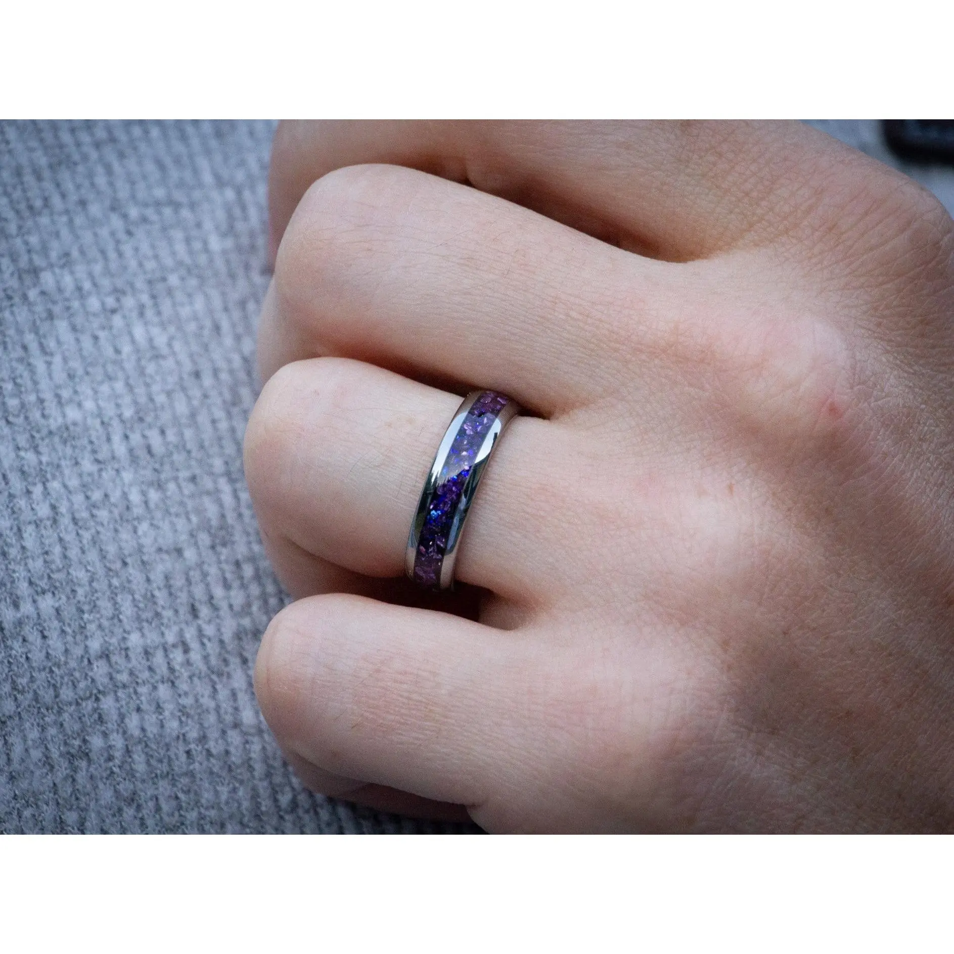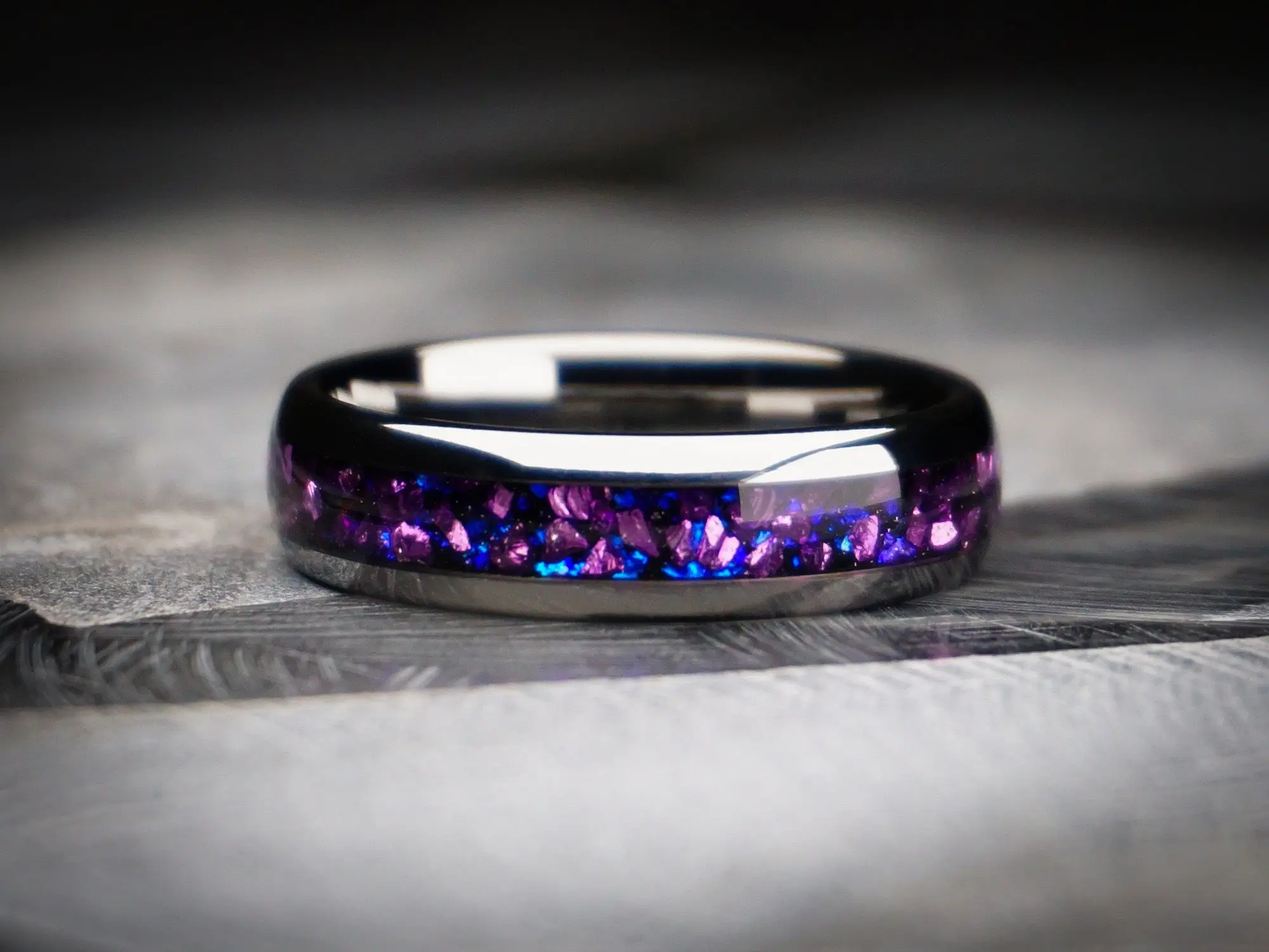 This tungsten ring features a polished natural silver color and an inlay of crushed Alexandrite gemstone.