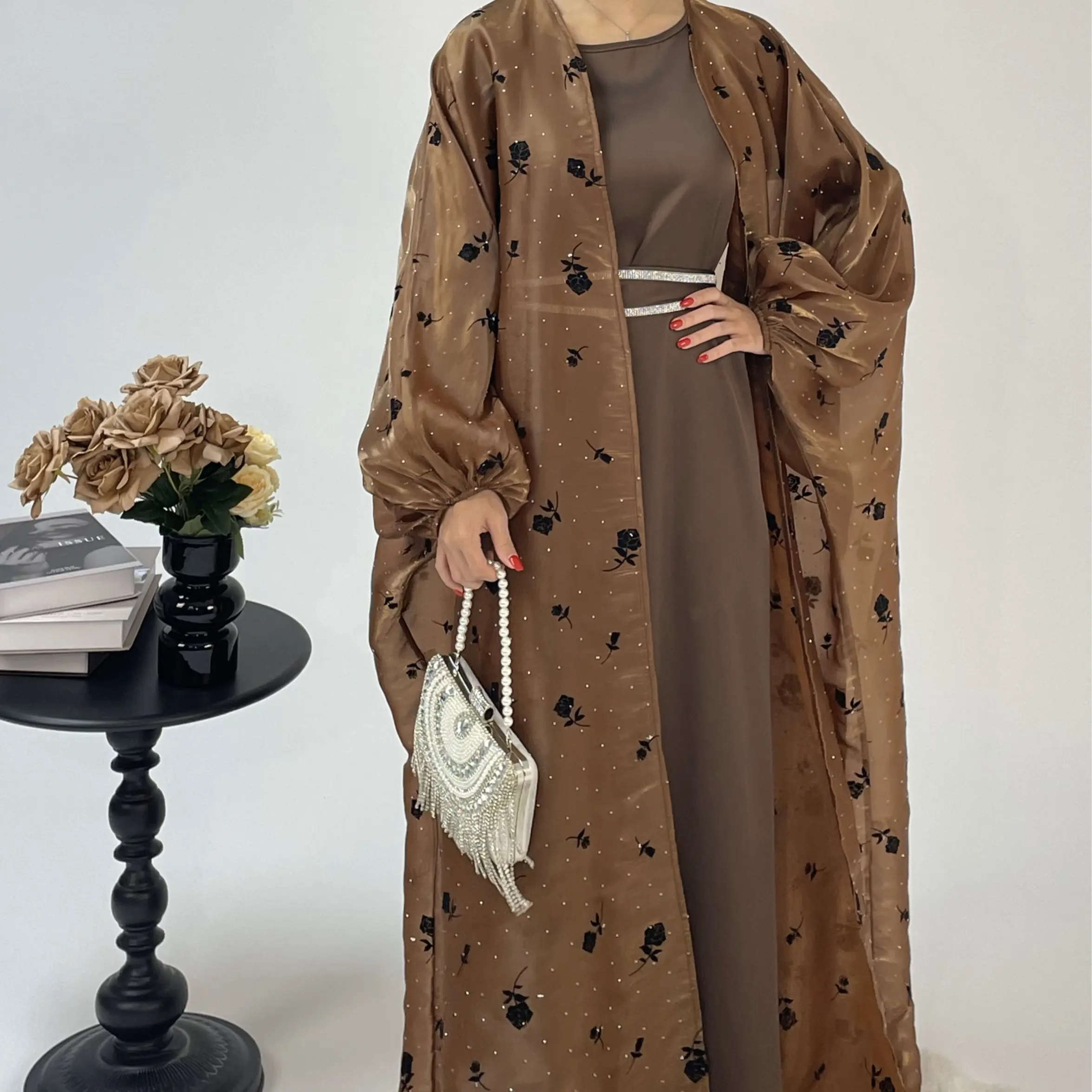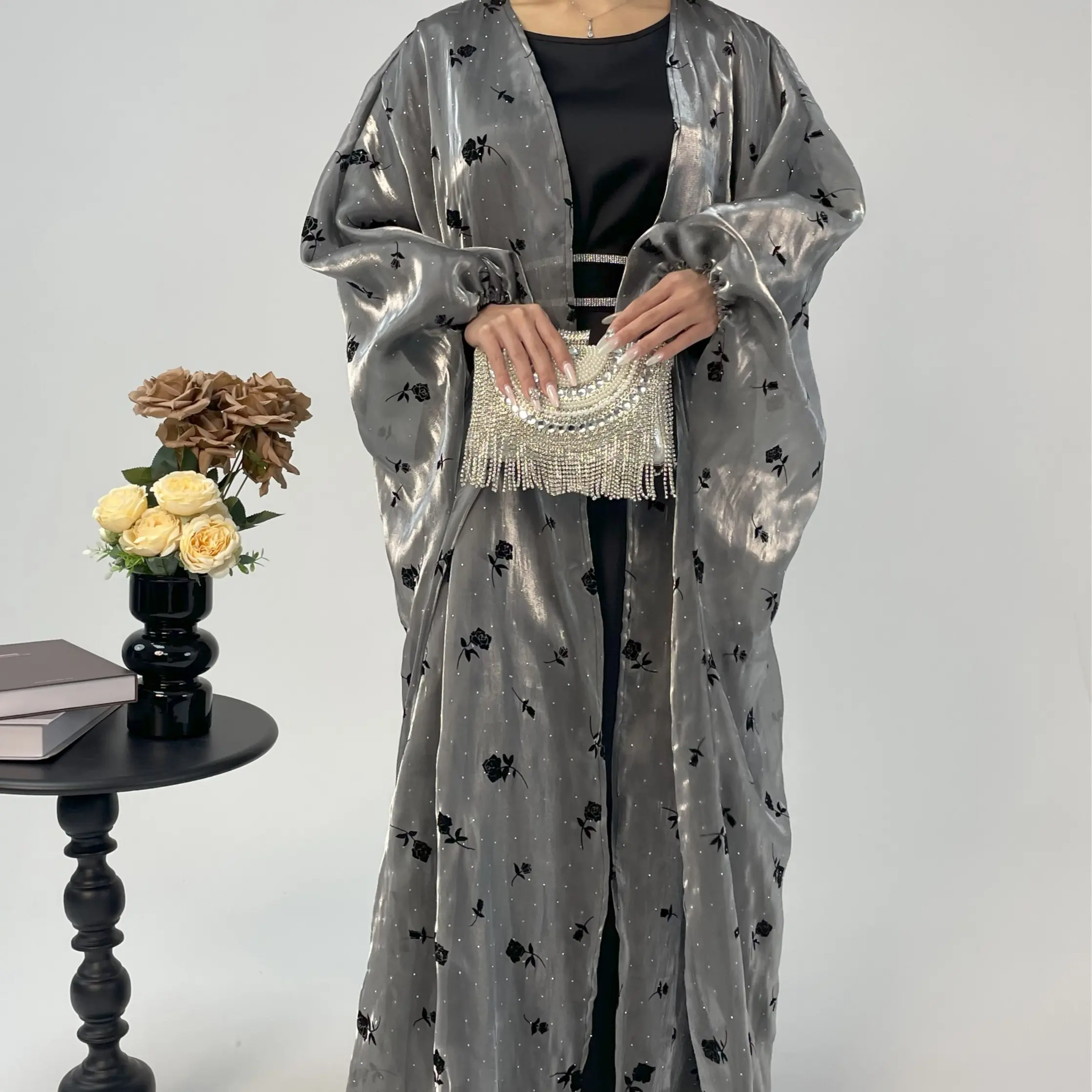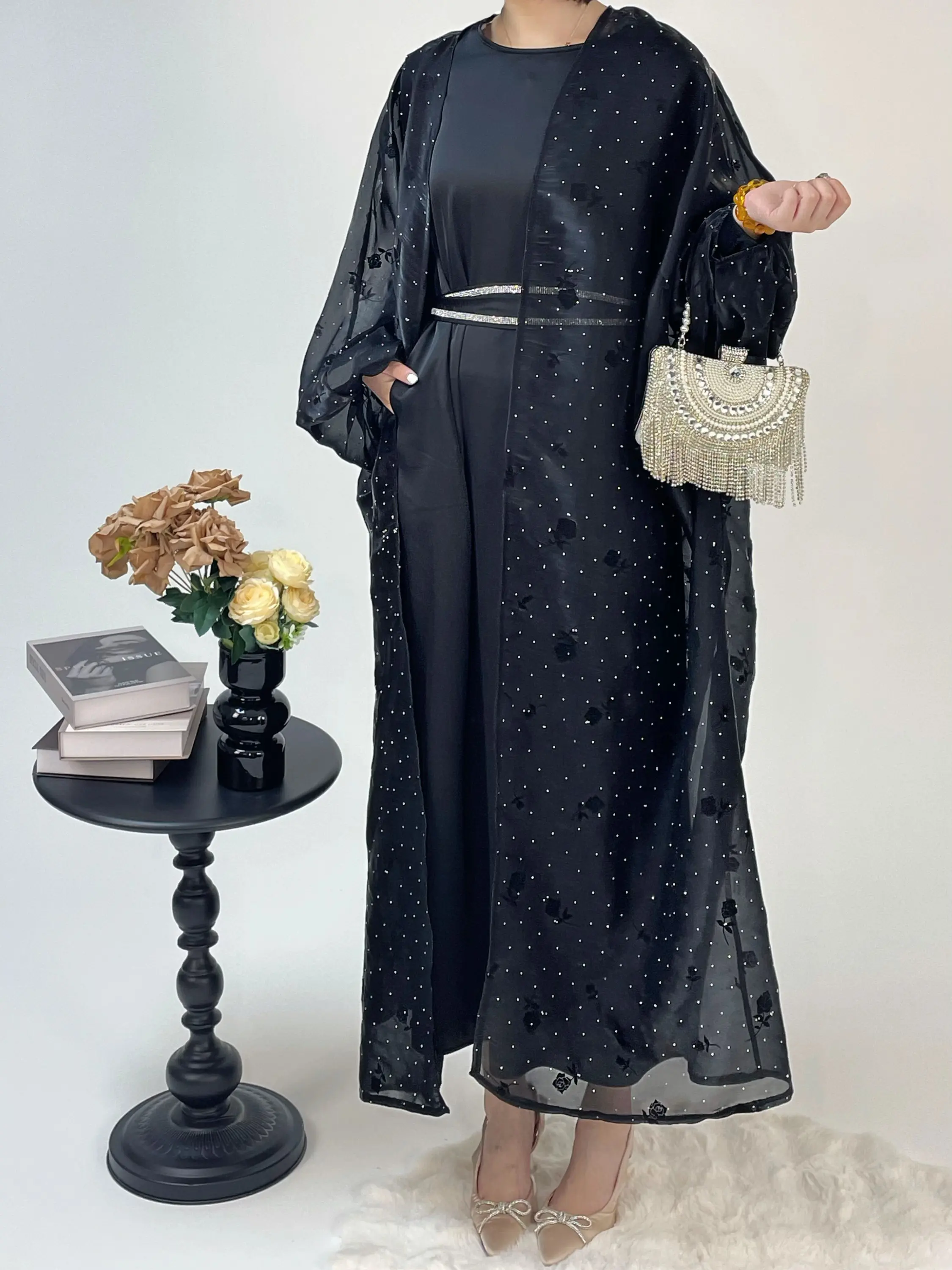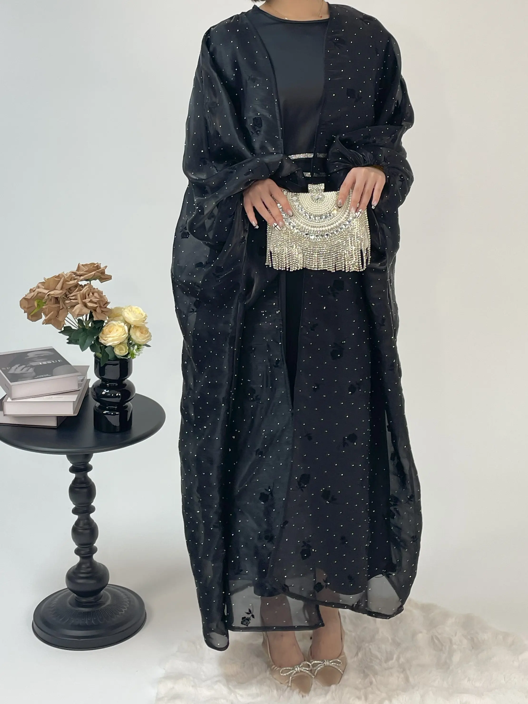 CL44 Organza Rose flower shiny abaya set, butterfly abaya with inner dress and crystal embellished belt,suitable for any occasions,Formal Chic【Fashionweek】 Modest Women