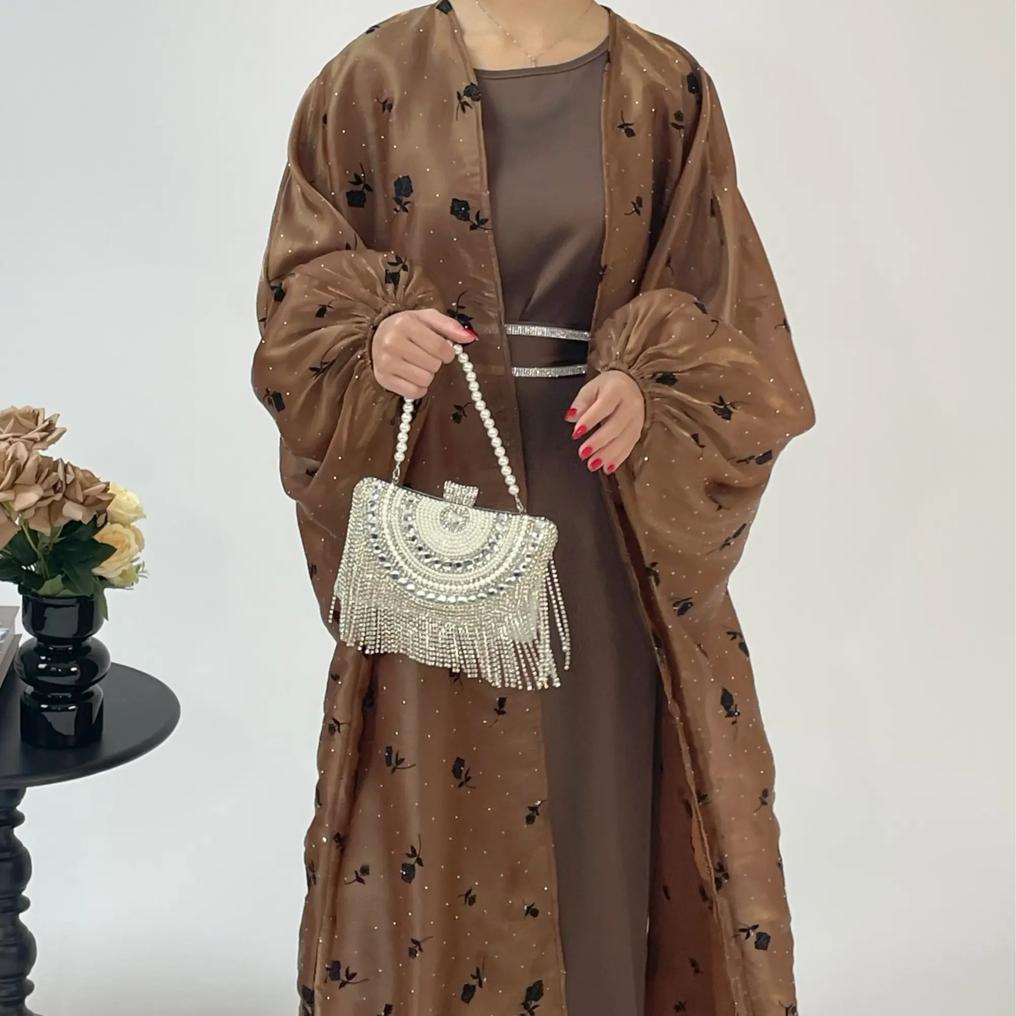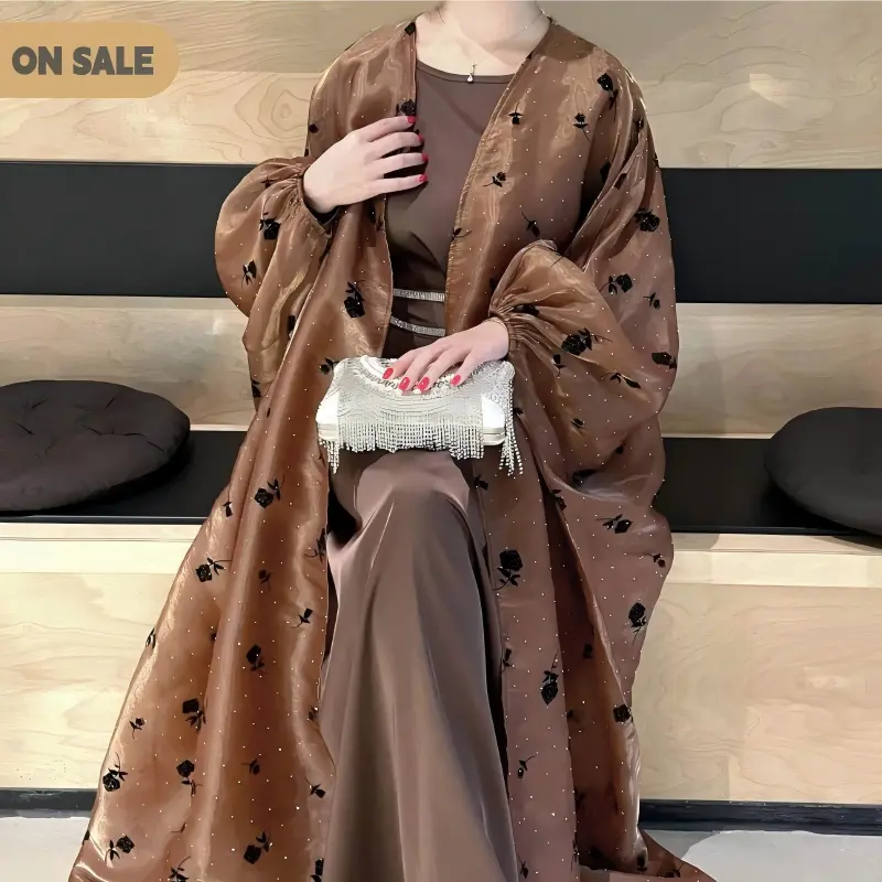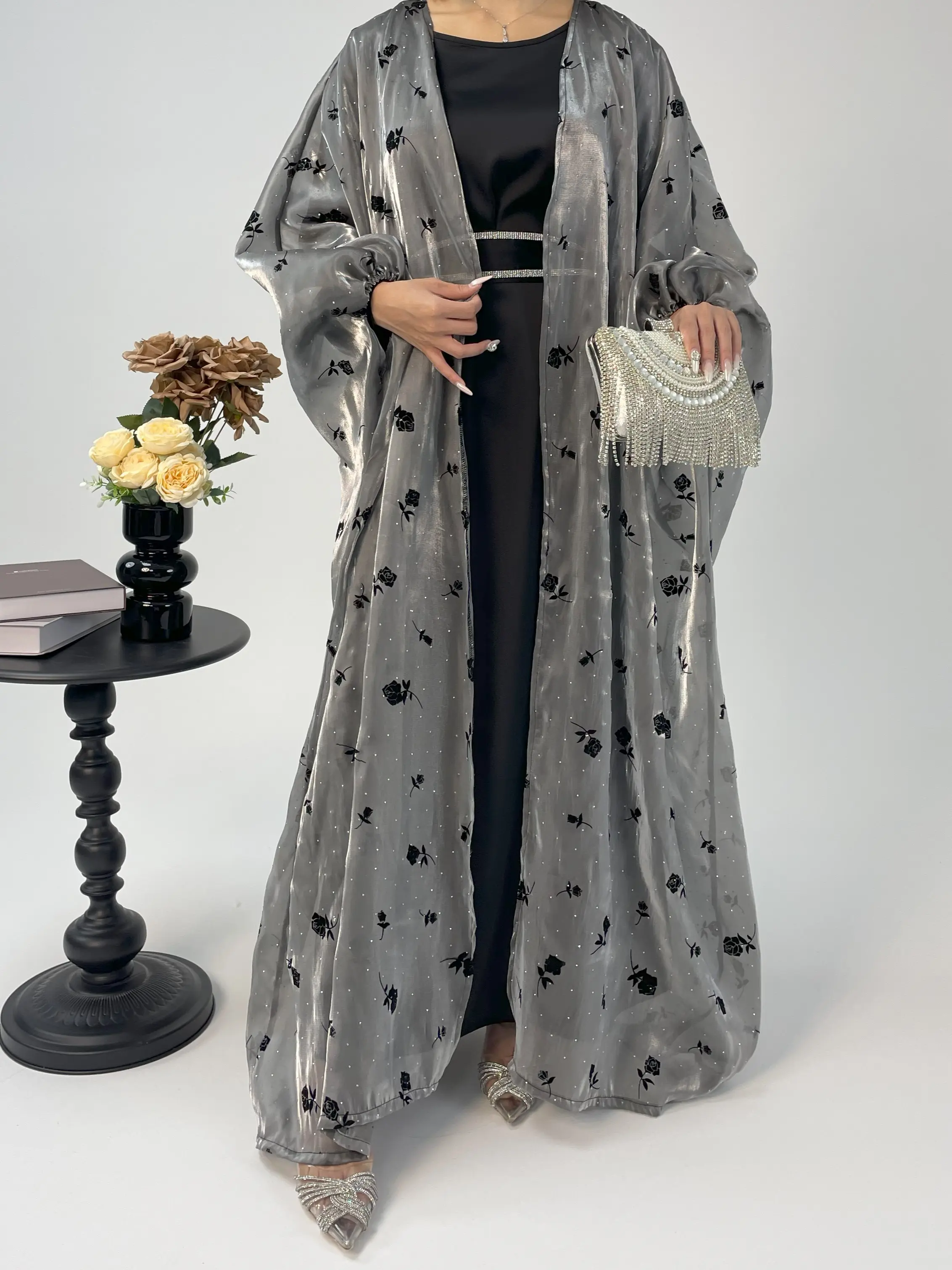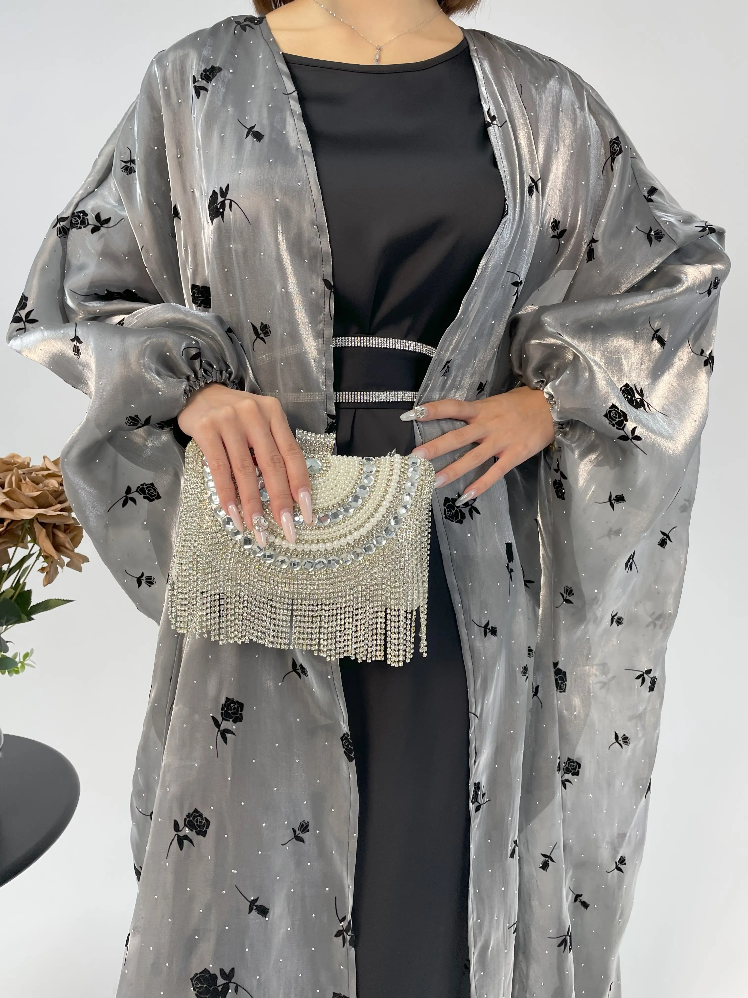 Elevate your wardrobe with the CL44 Organza Rose flower shiny abaya set. This ensemble includes a stunning butterfly abaya, paired with an inner dress and a crystal embellished belt. Perfect for any occasion, it exudes formal chic. Choose from grey, black, or brown options to suit your style.