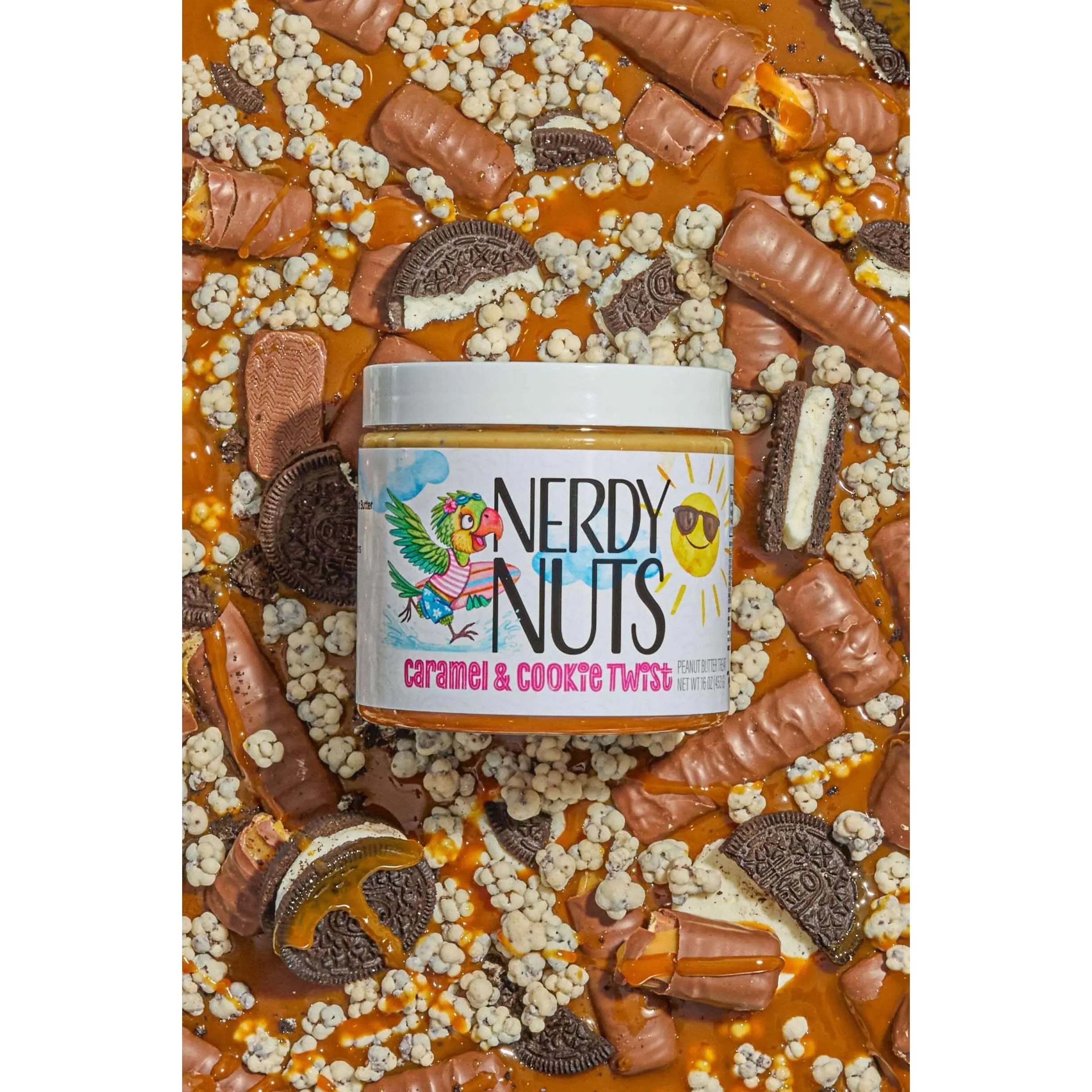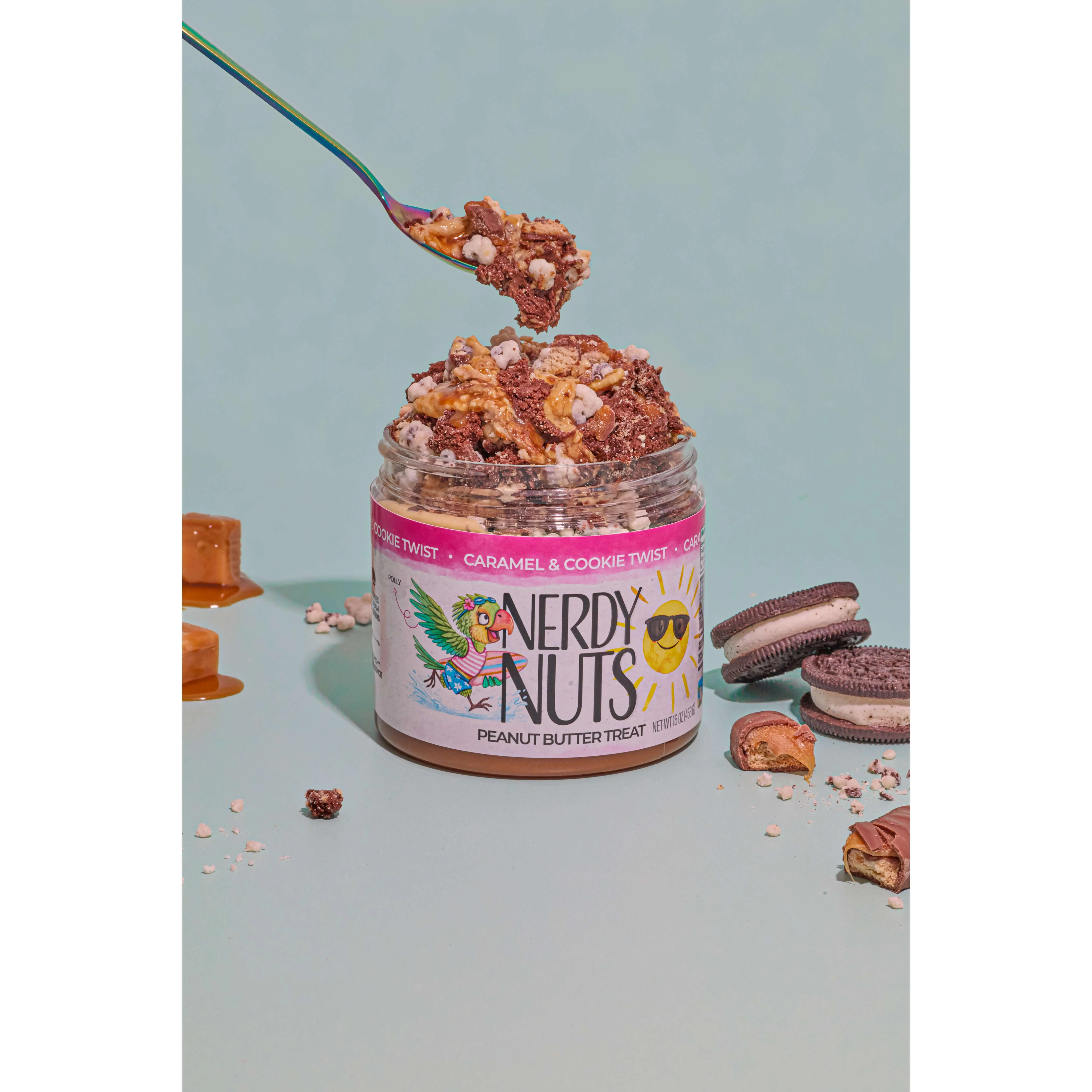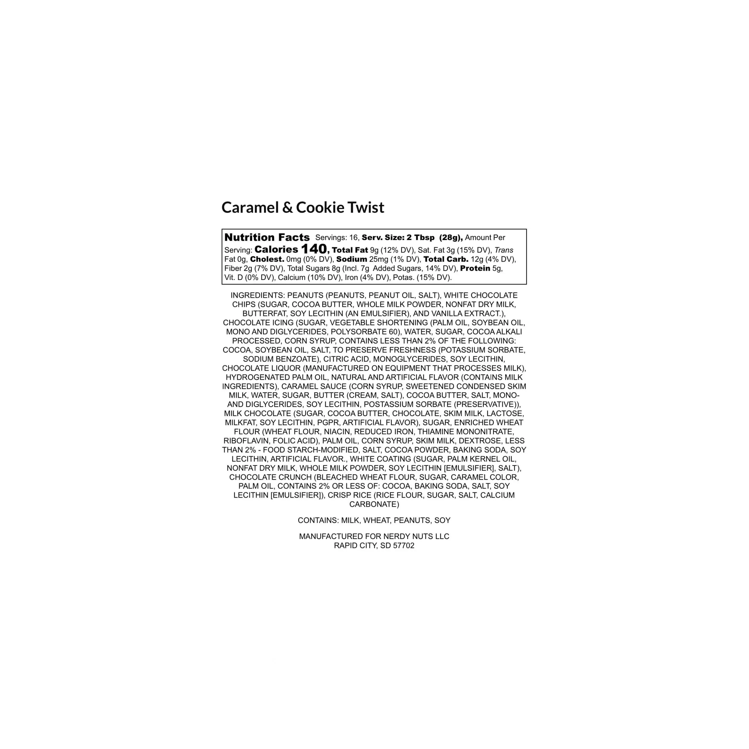 White chocolate peanut butter is layered on caramel sauce, topped with chocolate frosting, chopped caramel twin sticks candy, & cookies & cream clusters!