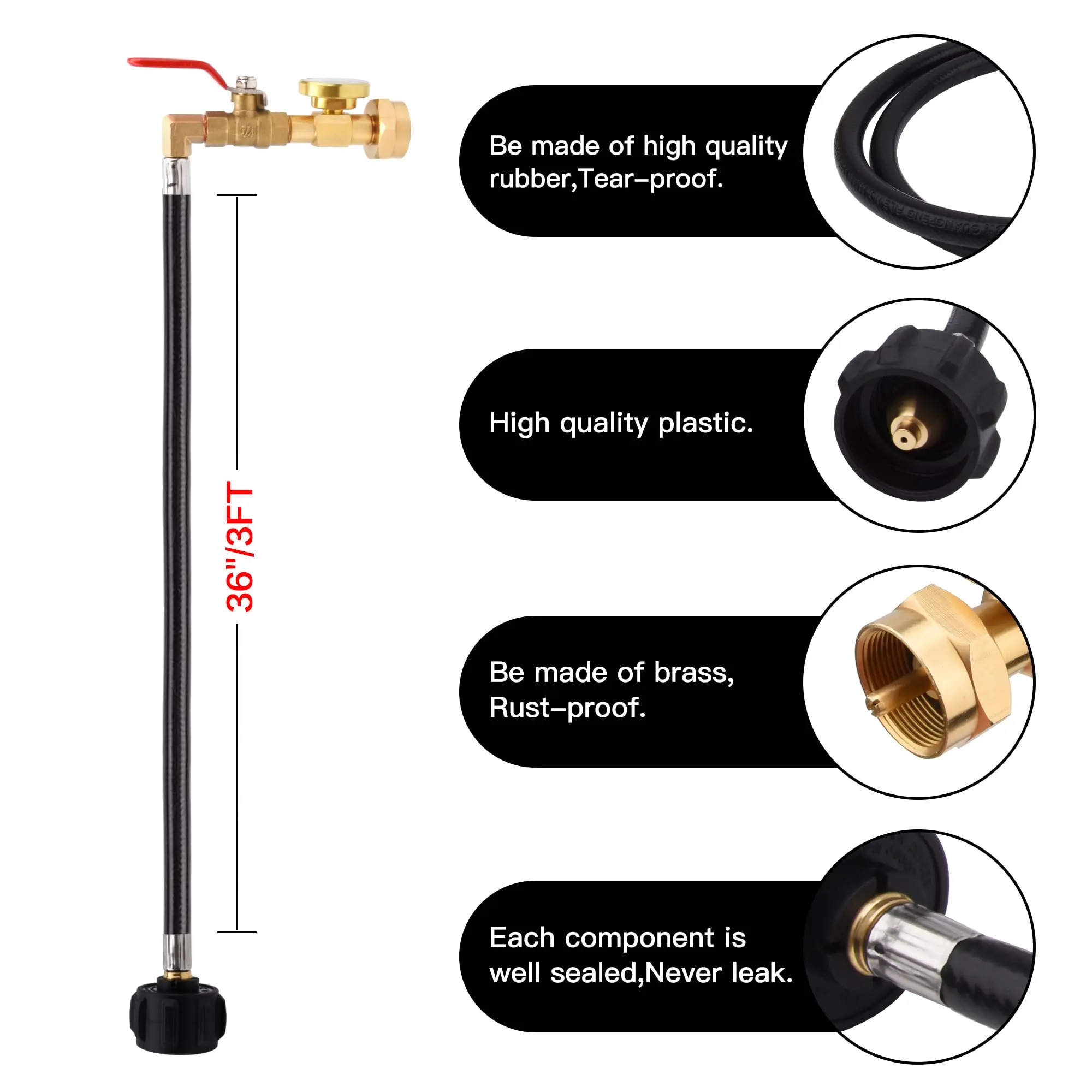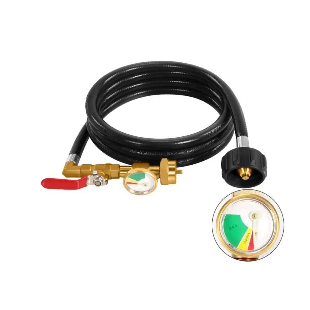 Conclusion:This 3FT Propane Refill Adapter Hose is a versatile and durable solution for refilling 1lb propane tanks. It features an ON-Off control valve, a tank gauge with a glow-in-the-dark dial, and is made from 100% Solid Brass and durable rubber. It is compatible with a wide range of propane tanks and is easy to install and use. Perfect for camping, tailgating, heating needs, and outdoor cooking.