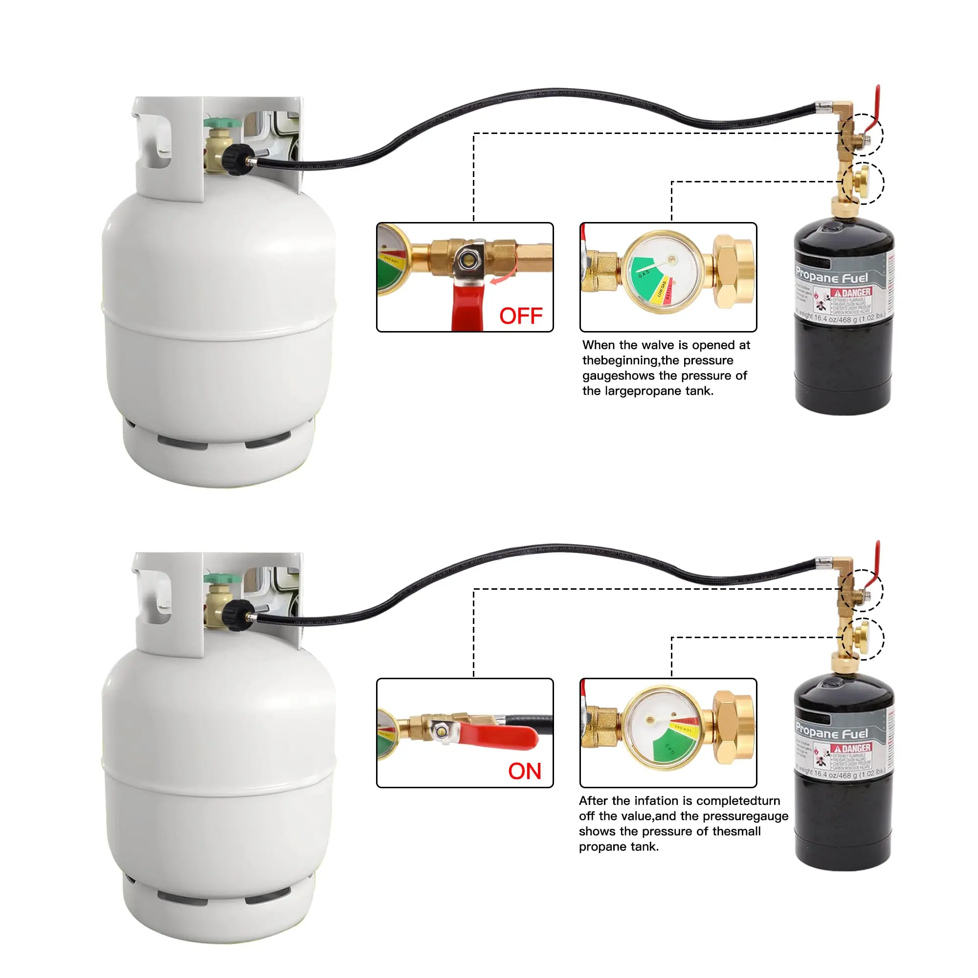 ·Usage: Connect QCC1 adapter to your tank, open the gas, then connect the 1lb adapter to your small tanks