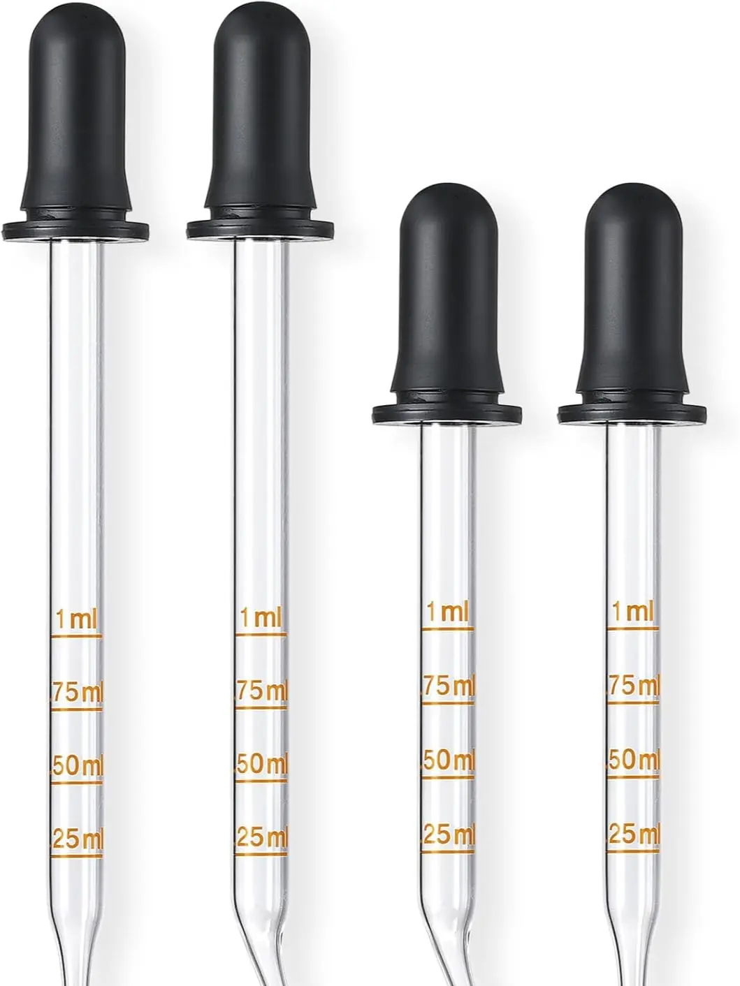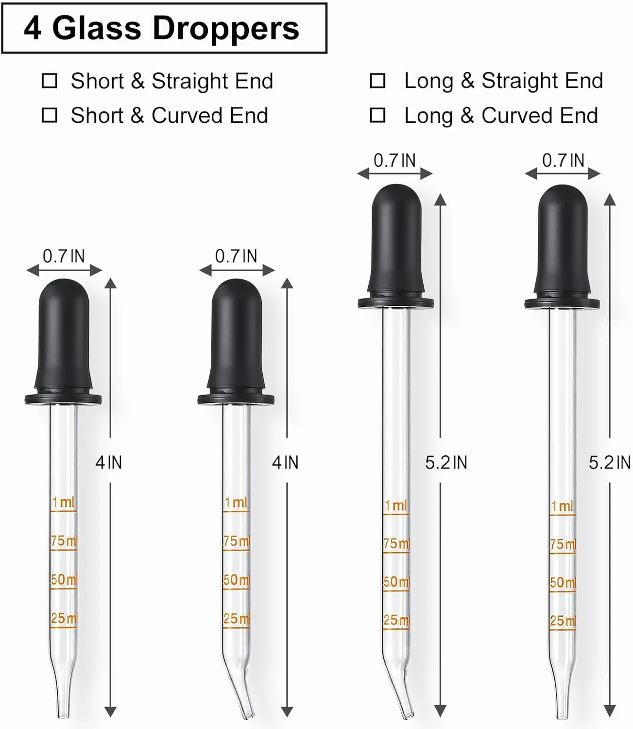 The 4 Pack, 1 mL Glass Eye Dropper set includes four glass droppers. Each pack contains one long & straight, one long & curved, one short & straight, and one short & curved tip. Perfect for dispensing essential oils, eye care, ear care, and pet feeding. The set weighs 1.45 ounces and measures 5 x 5 x 1 inches.
