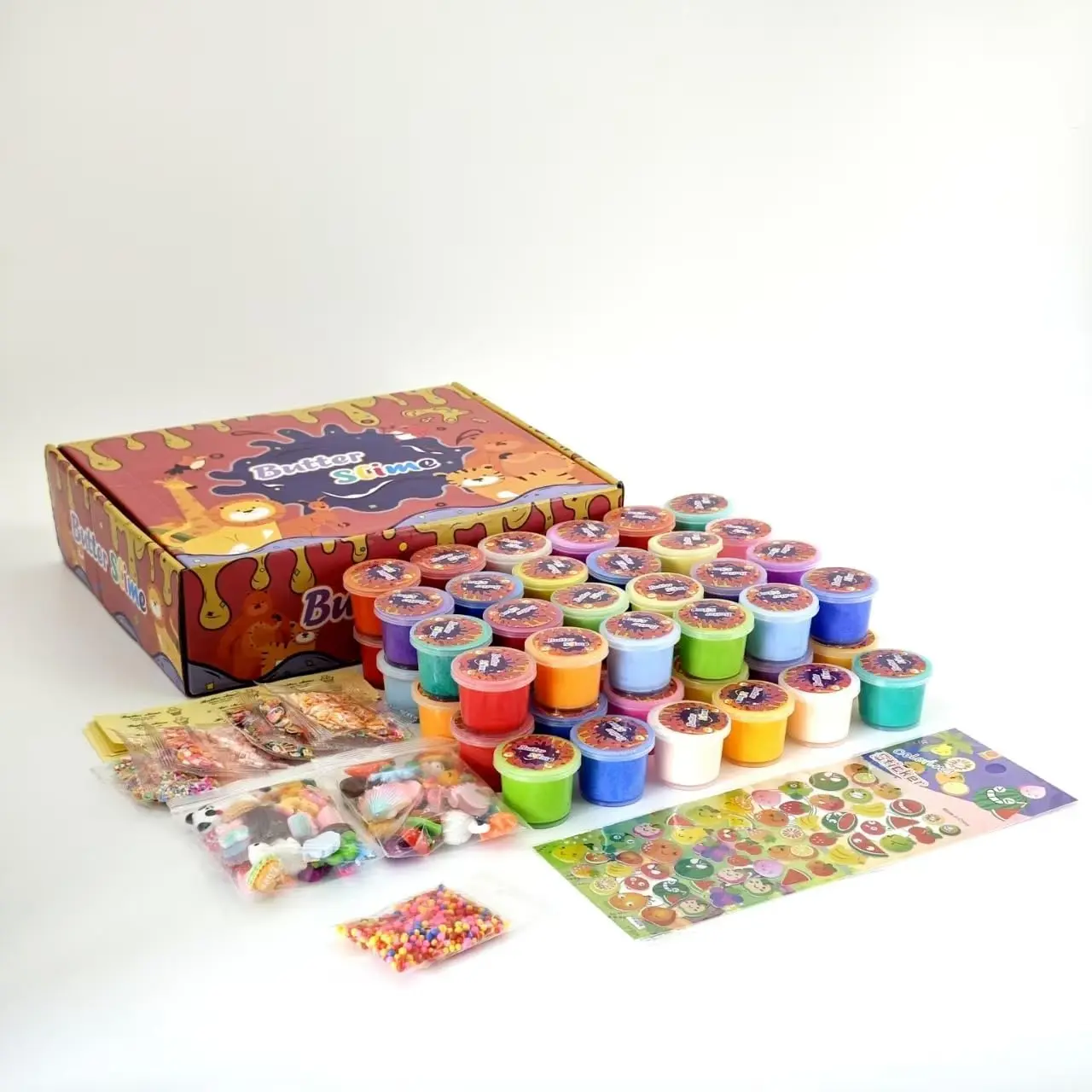 ·【Party Favors Butter Slime 】The mini party favors slime kit includes 54 packs of slime toys, 30 colors, 54 Slime charms, 1 pack of foam balls, 1 pack of fruit stickers, 1 pack of cute pieces, 9 packs of slime decorations, 1 beautiful gift box