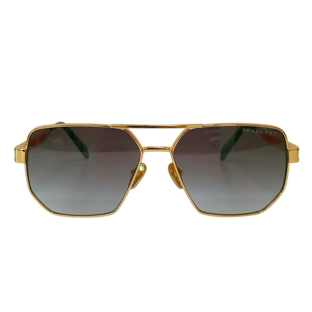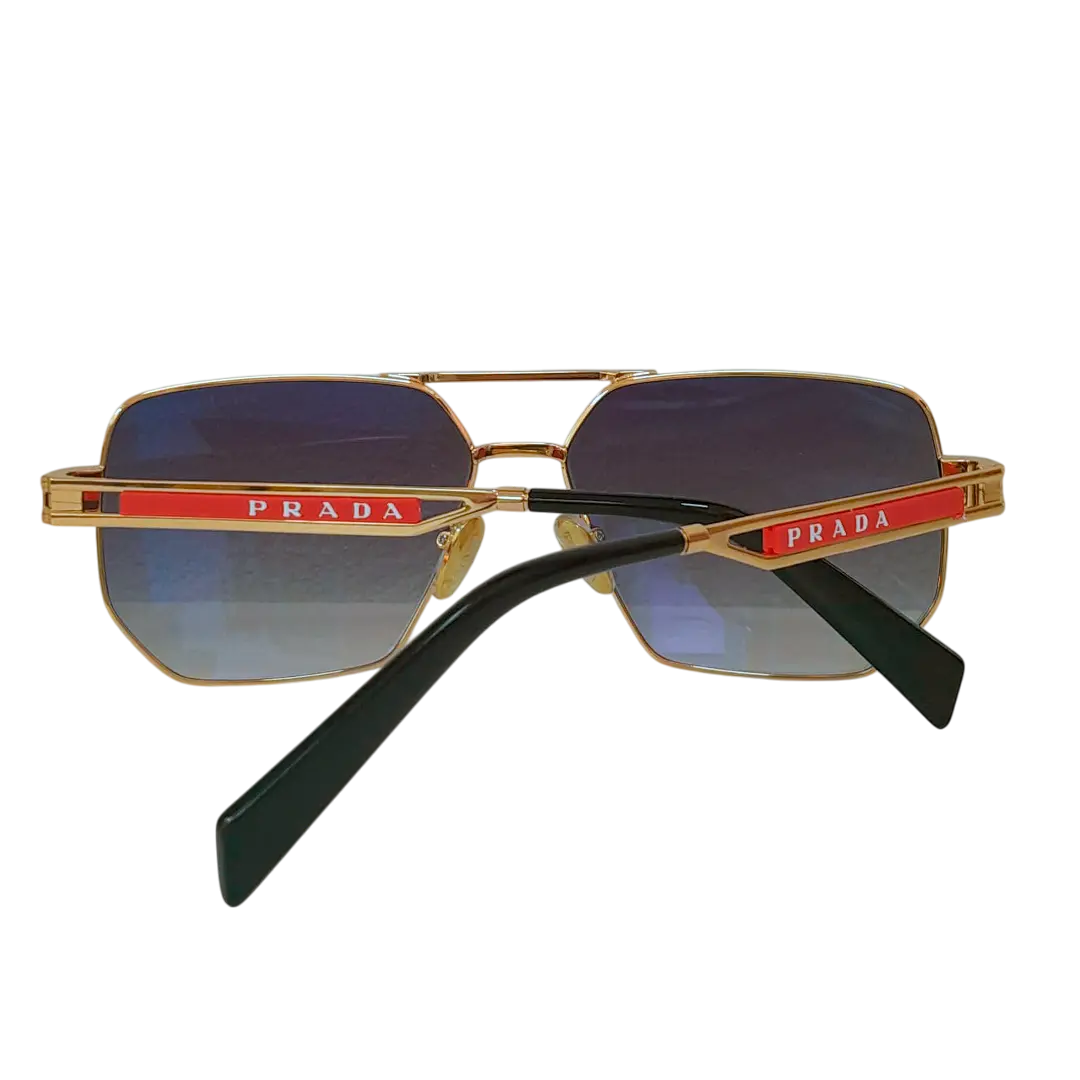 These sunglasses feature semi-dark lenses that offer a unique and stylish look. The name is prominently displayed on each arm, adding a touch of luxury. With a color combination of gold, black, and red, these sunglasses are a bold and fashionable accessory.