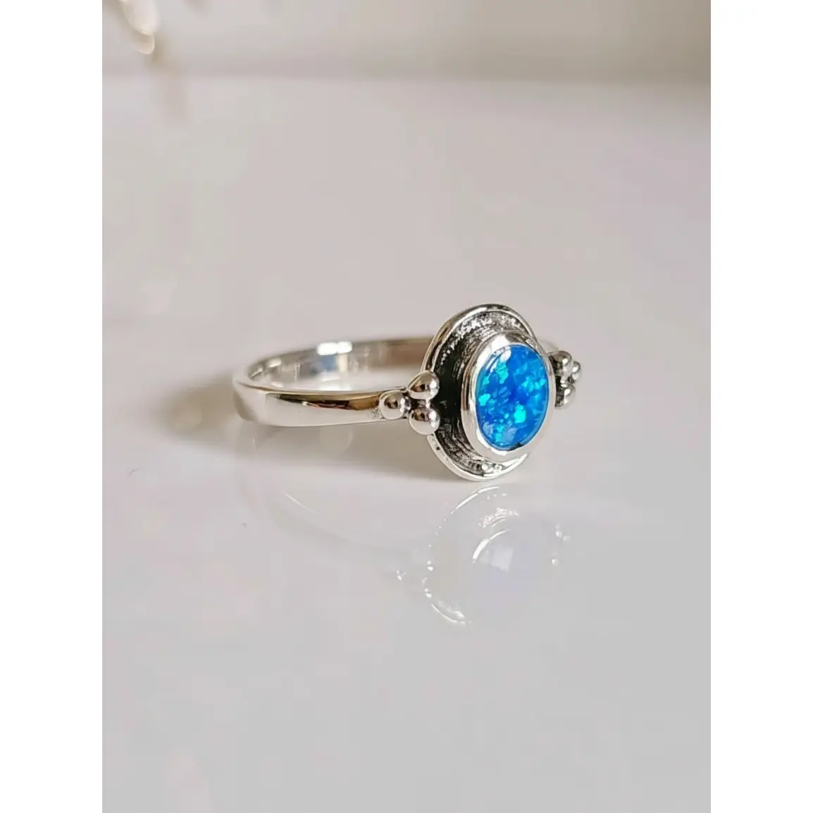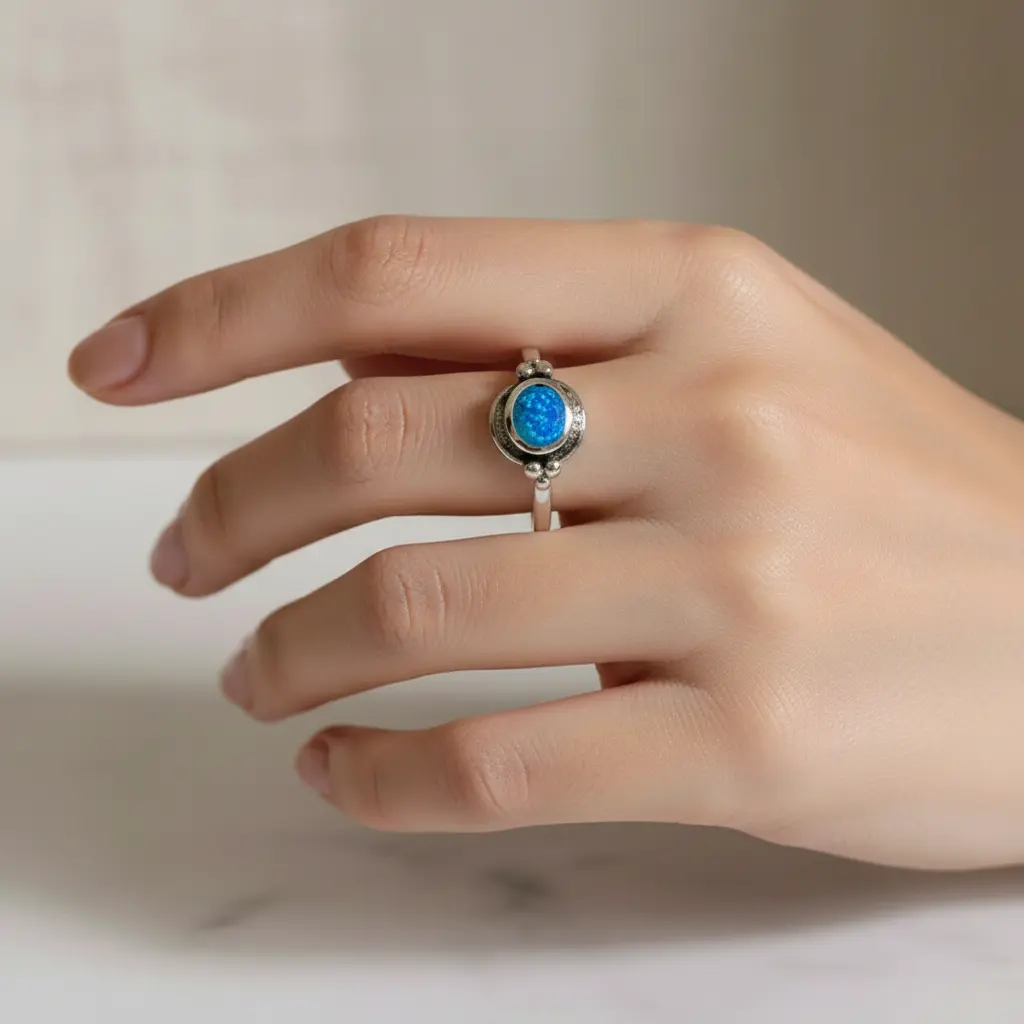 This ring is a perfect anniversary or birthday gift. Its unique combination of a striking blue lab opal and intricate beaded design makes it a standout accessory. It complements any outfit and ensures a comfortable fit. The 925 sterling silver construction ensures it remains a cherished piece of jewelry.