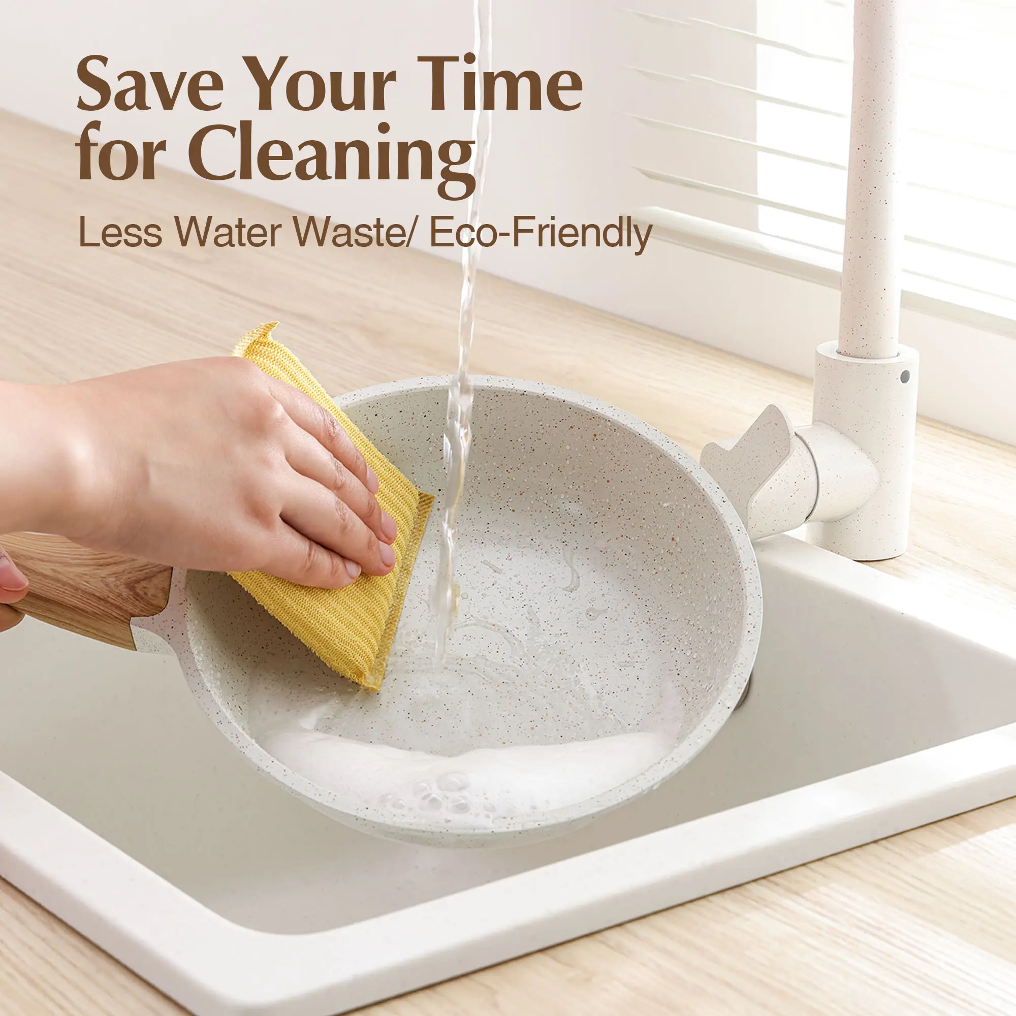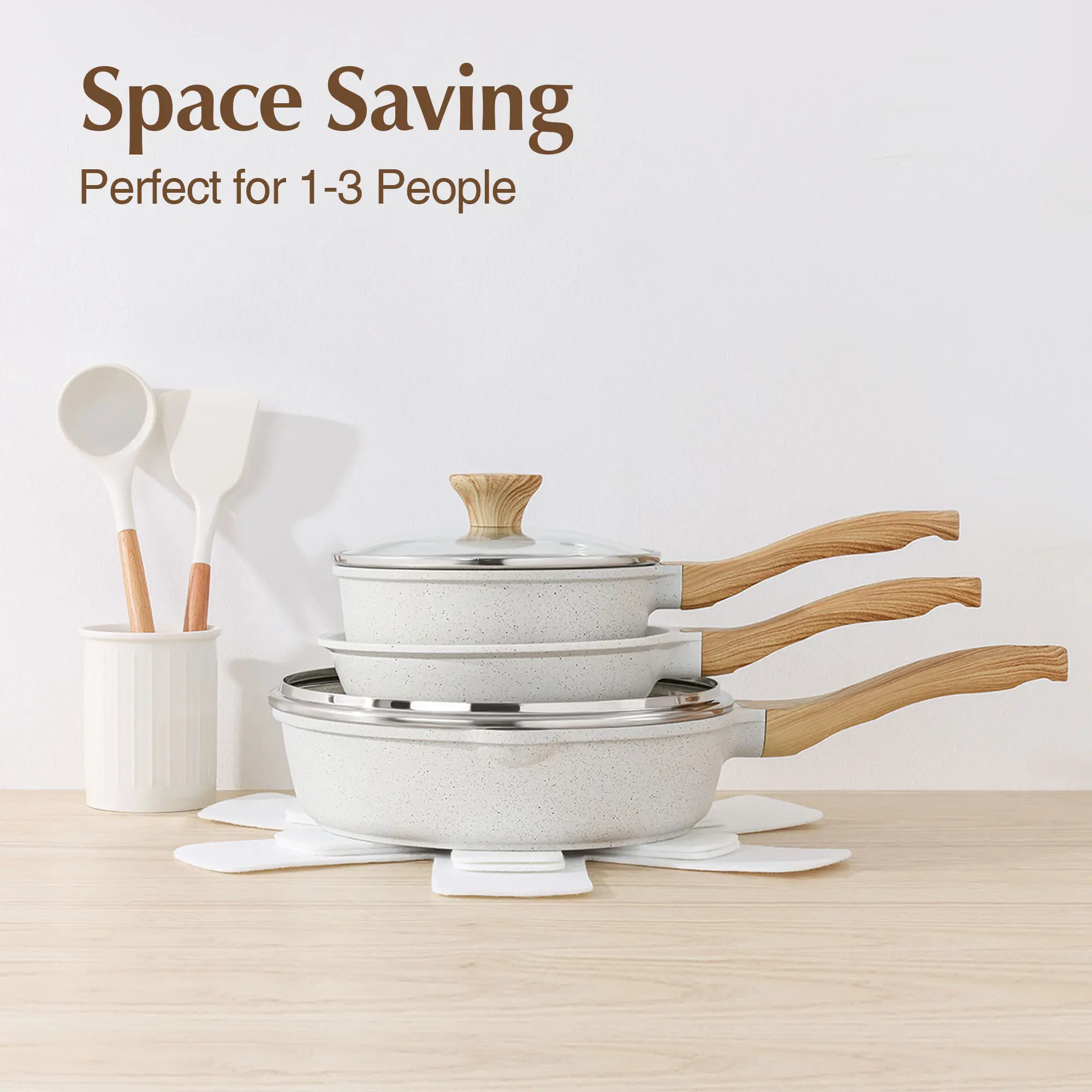 ·Eco-Friendly: Stacking design saves 30% kitchen space, and 4 pieces of padded protectors prevent cookware sets from scratching. Our pans and packages are all recyclable, reducing waste and ensuring a smaller carbon footprint.
