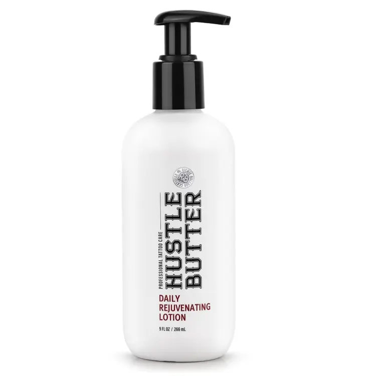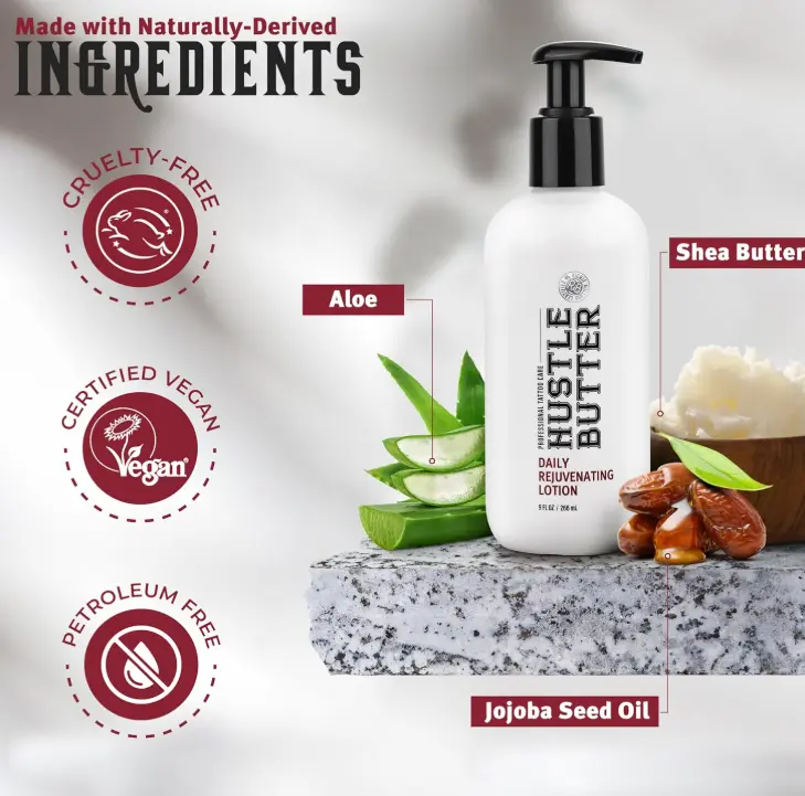 ·Daily Tattoo Lotion made with: vegan and cruelty-free ingredients. Like all Hustle Butter products, Daily Rejuvenating Lotion is naturally-derived petroleum-free.