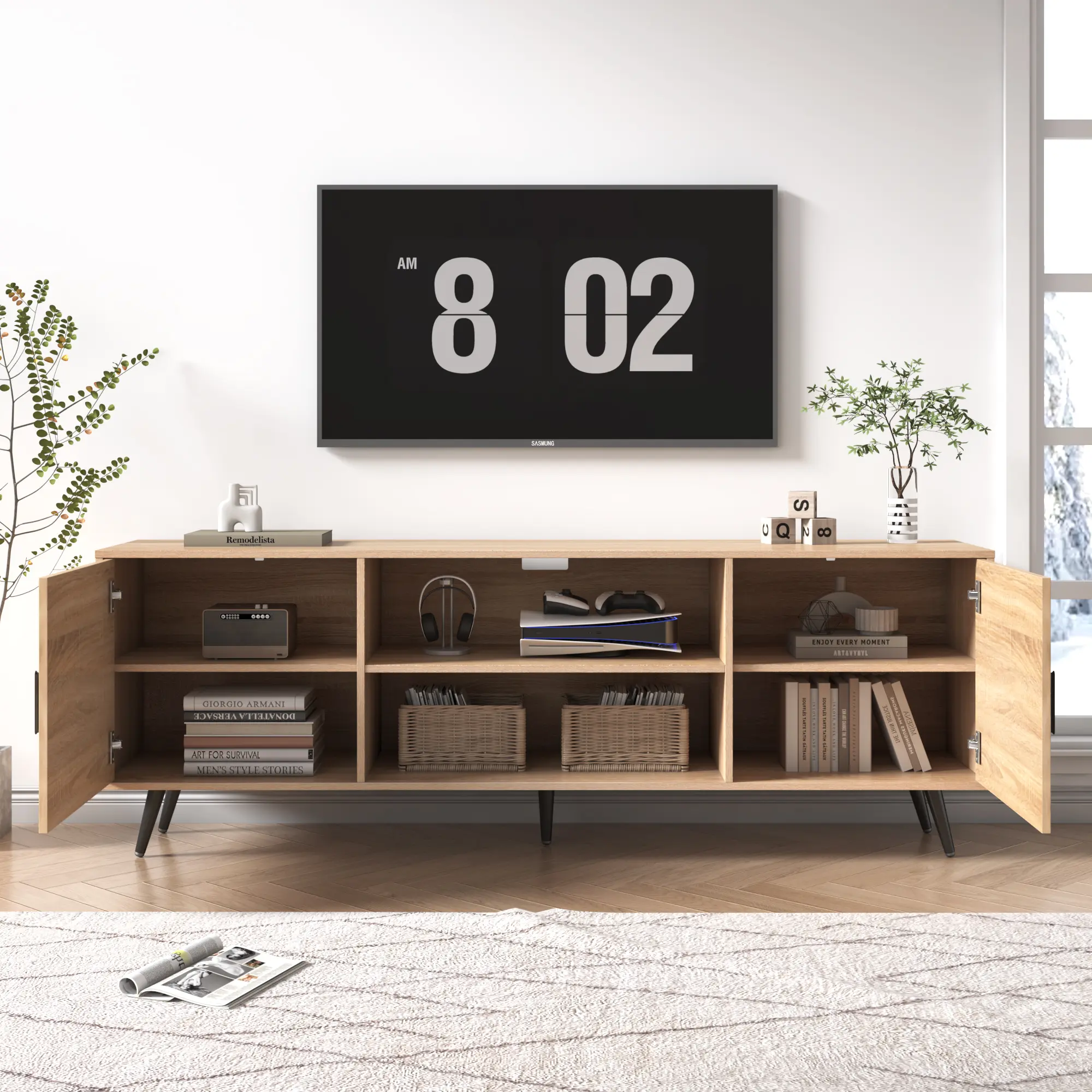 Modern Mid Century TV Stand: Featuring a classic two-door design with a mid century look and pine legs, the simple lines of the long TV stand design can easily be incorporated into a variety of decorative aesthetics to enhance the look of any room.