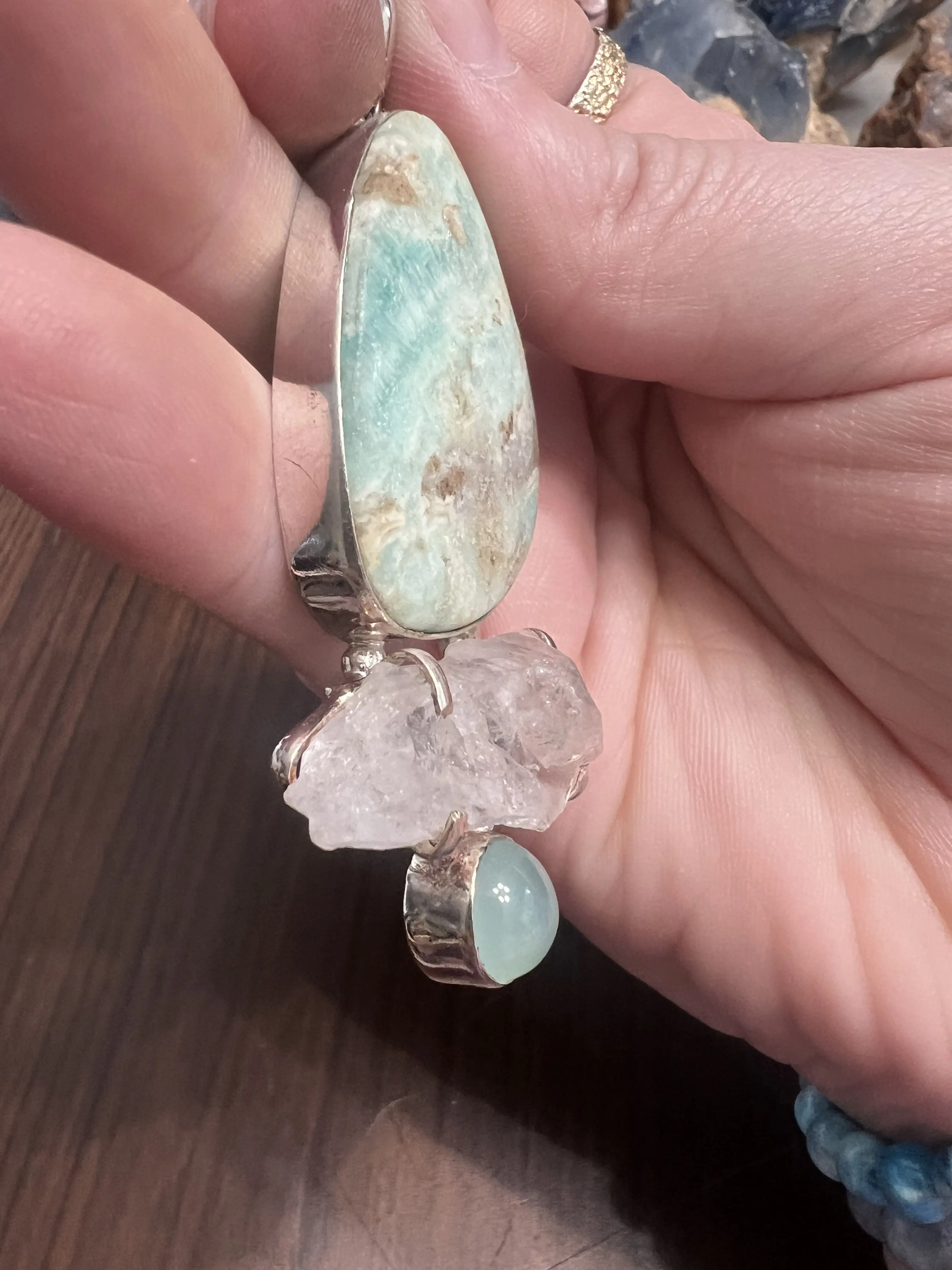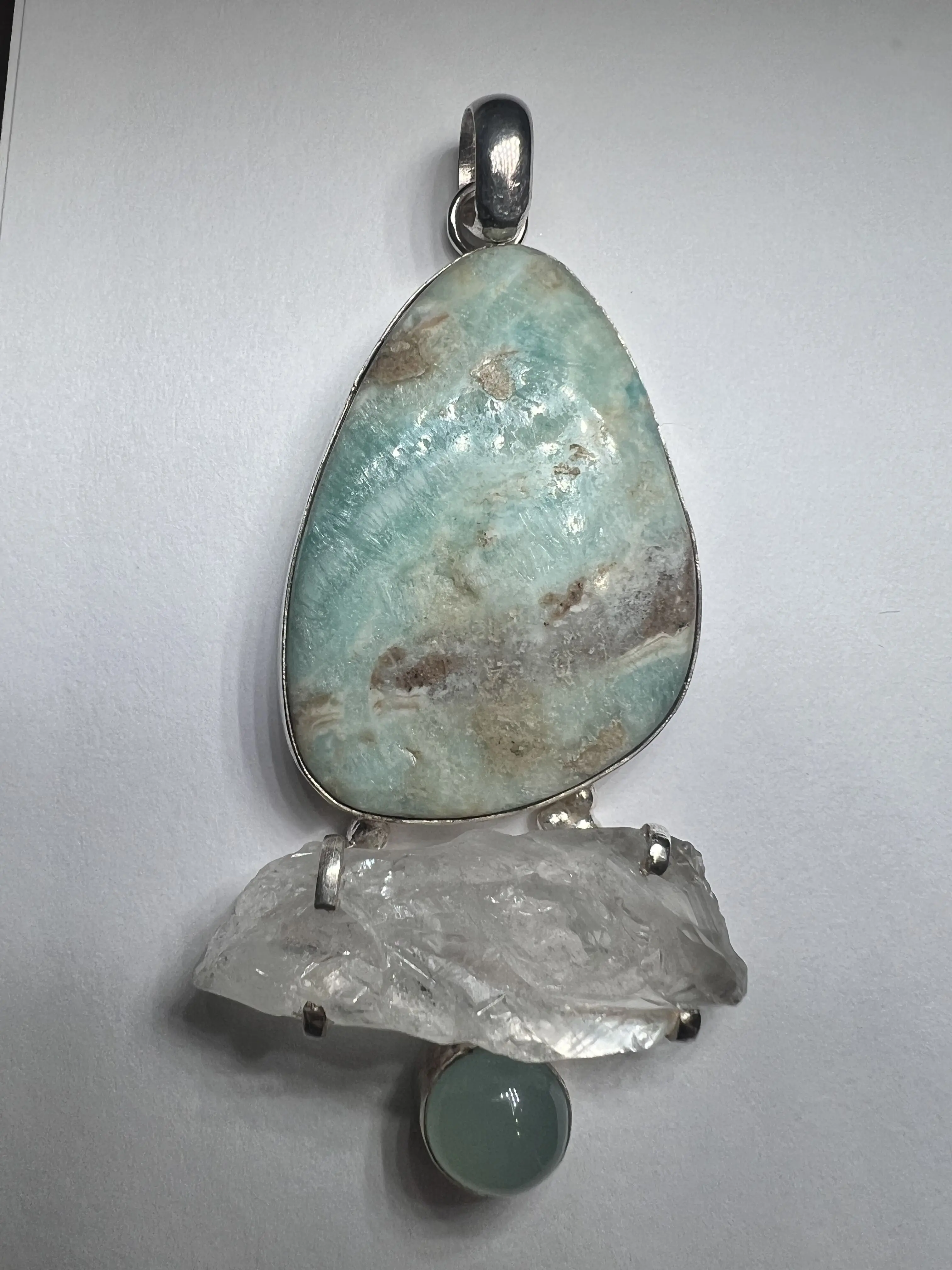 Authentic Blue Aragonite, Clear Quartz, & Blue Chalcedony Pendant - set in 925 Sterling Silver
