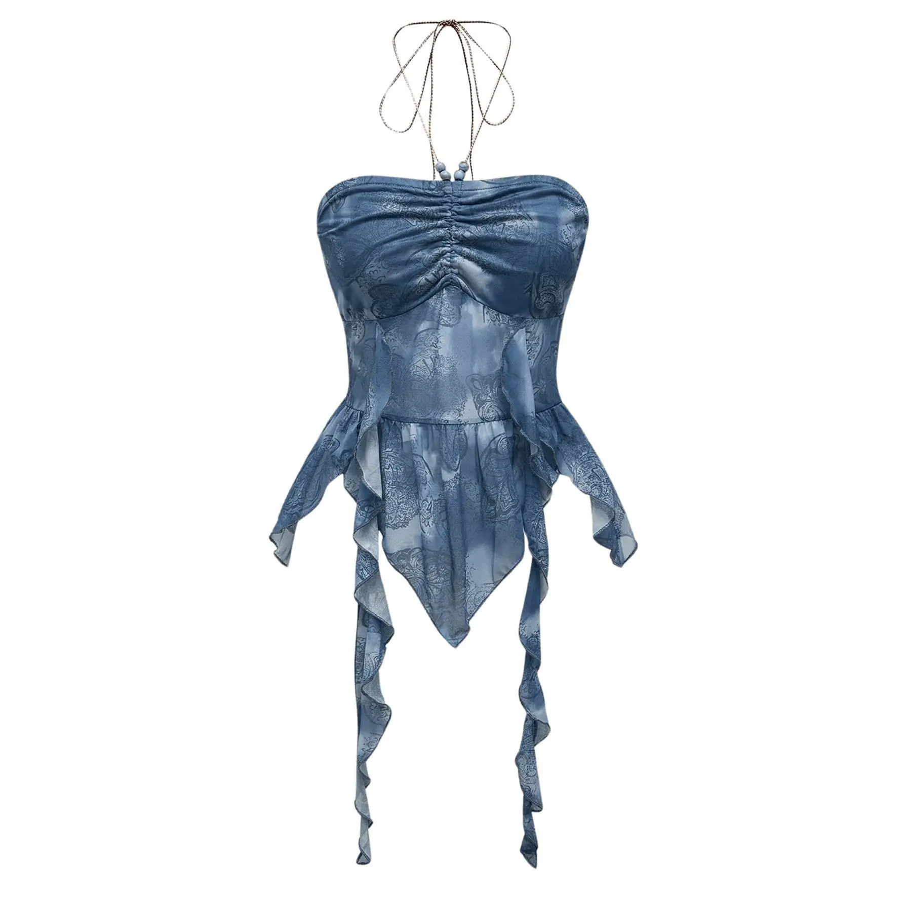 Ruffle hem, asymmetrical hem, lettuce trim, tie backless, paisley print, sleeveless, ruched, slim fit, sexy crop halter top for women