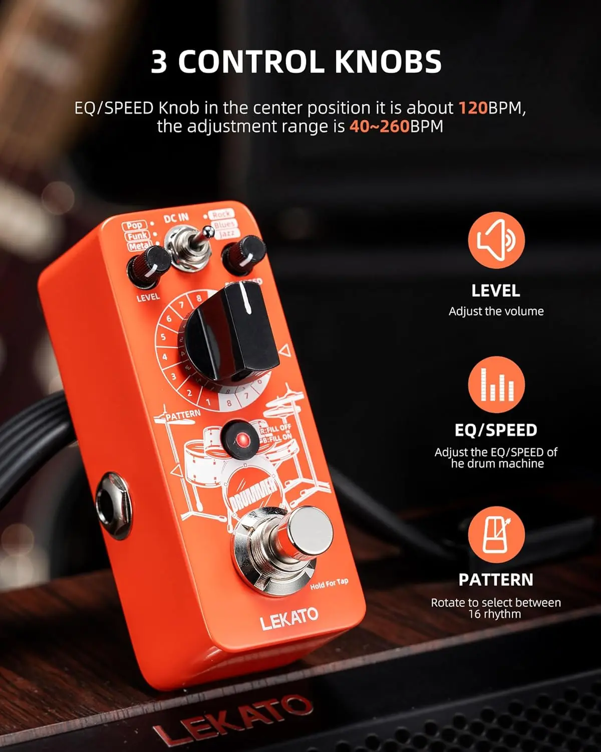 LEKATO Drummer Guitar Pedal include 6 music styles: Pop, Rock, Funk, Blues,Metal and Jazz. 8 different rhythm types for each music style, 48 grooves in total
