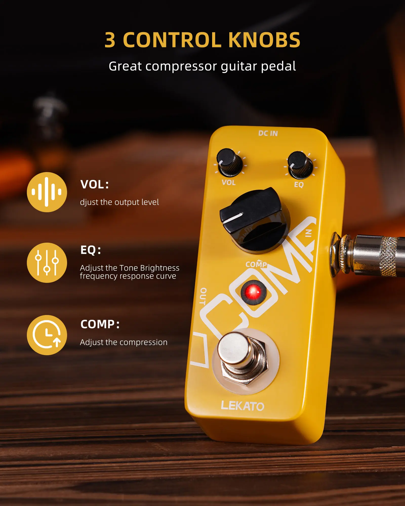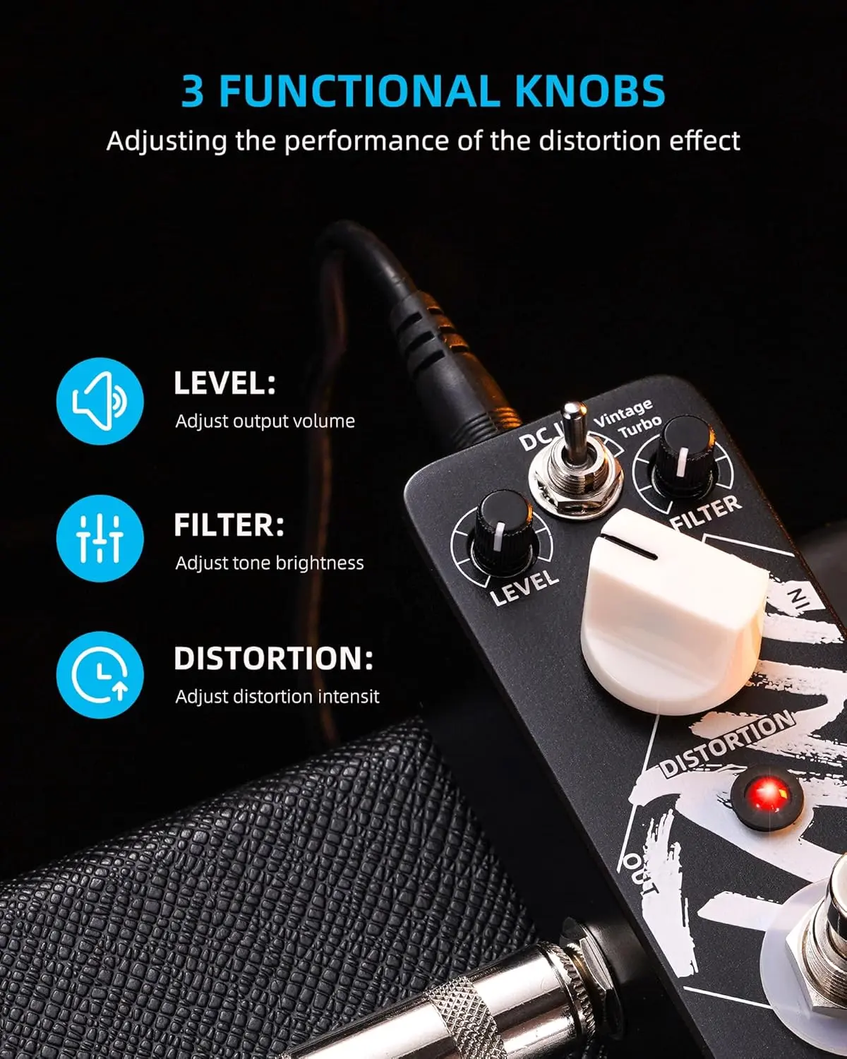 LEKATO guitar pedal is a High-Gain distortion pedal with wide adjustment range