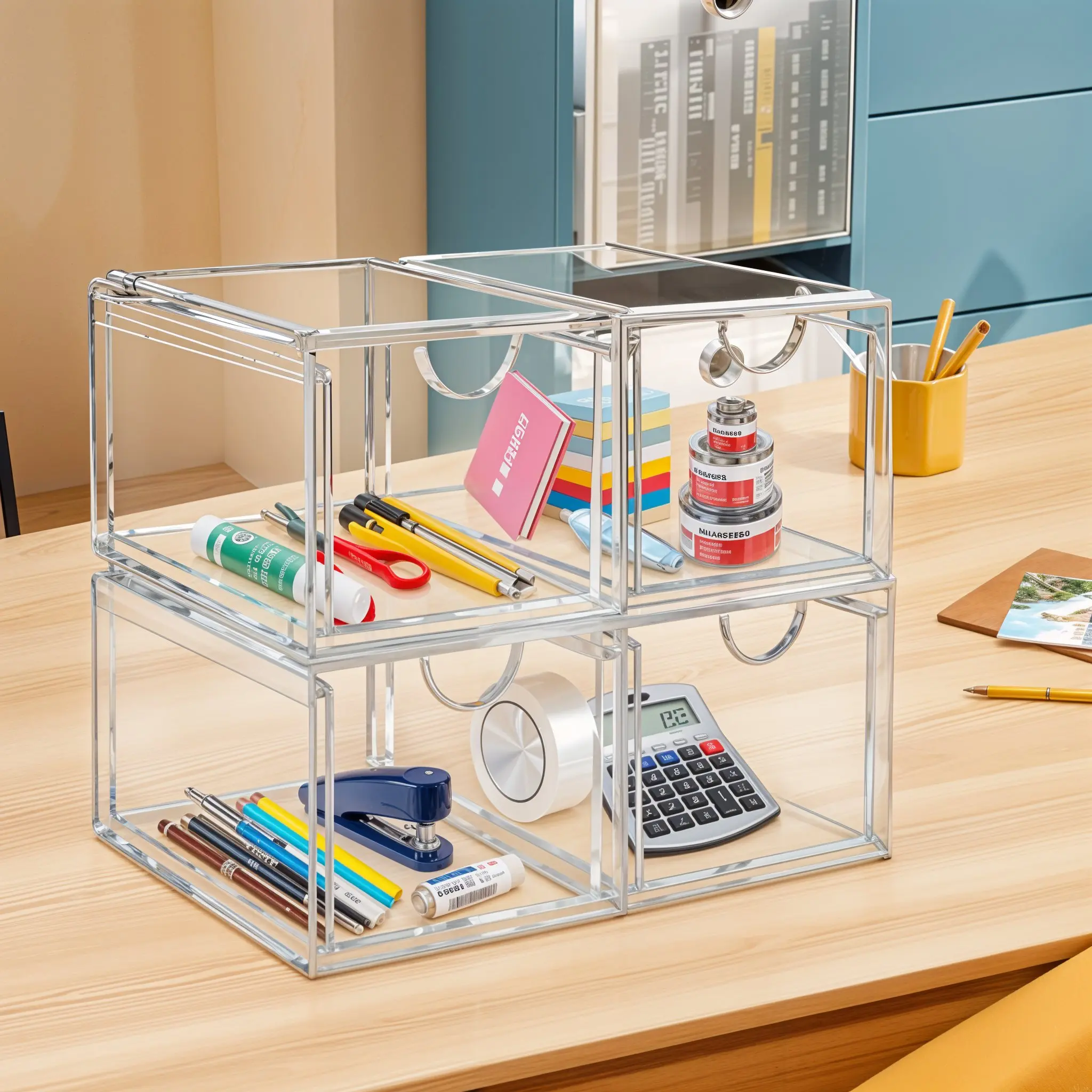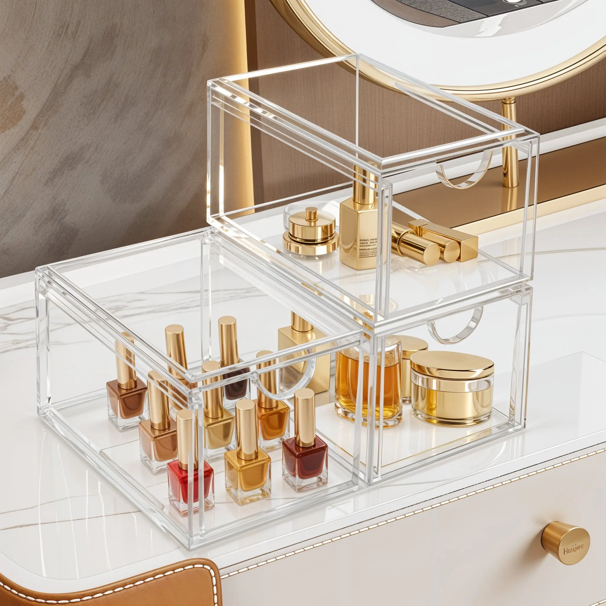 Modular system allows vertical stacking to save 70% counter space. Perfect for vanities, bathroom counters, or tight spaces. Dust-resistant design keeps items clean.