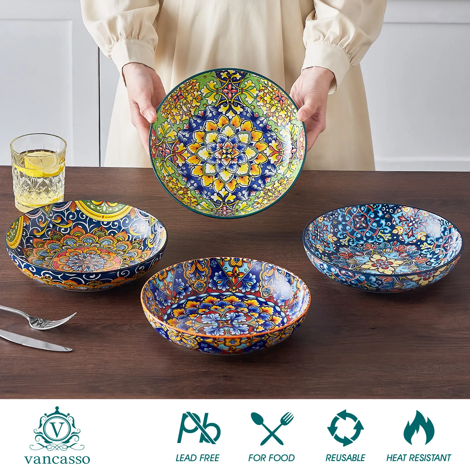 Vancasso Bohemian style pasta bowls set features a Bohemian pattern design on both the inside and outside, capturing the free spirit essence of Bohemian culture. The bright colors and artistic patterns evoke a sense of joy and positivity, making your dining experience full of vitality and happiness.