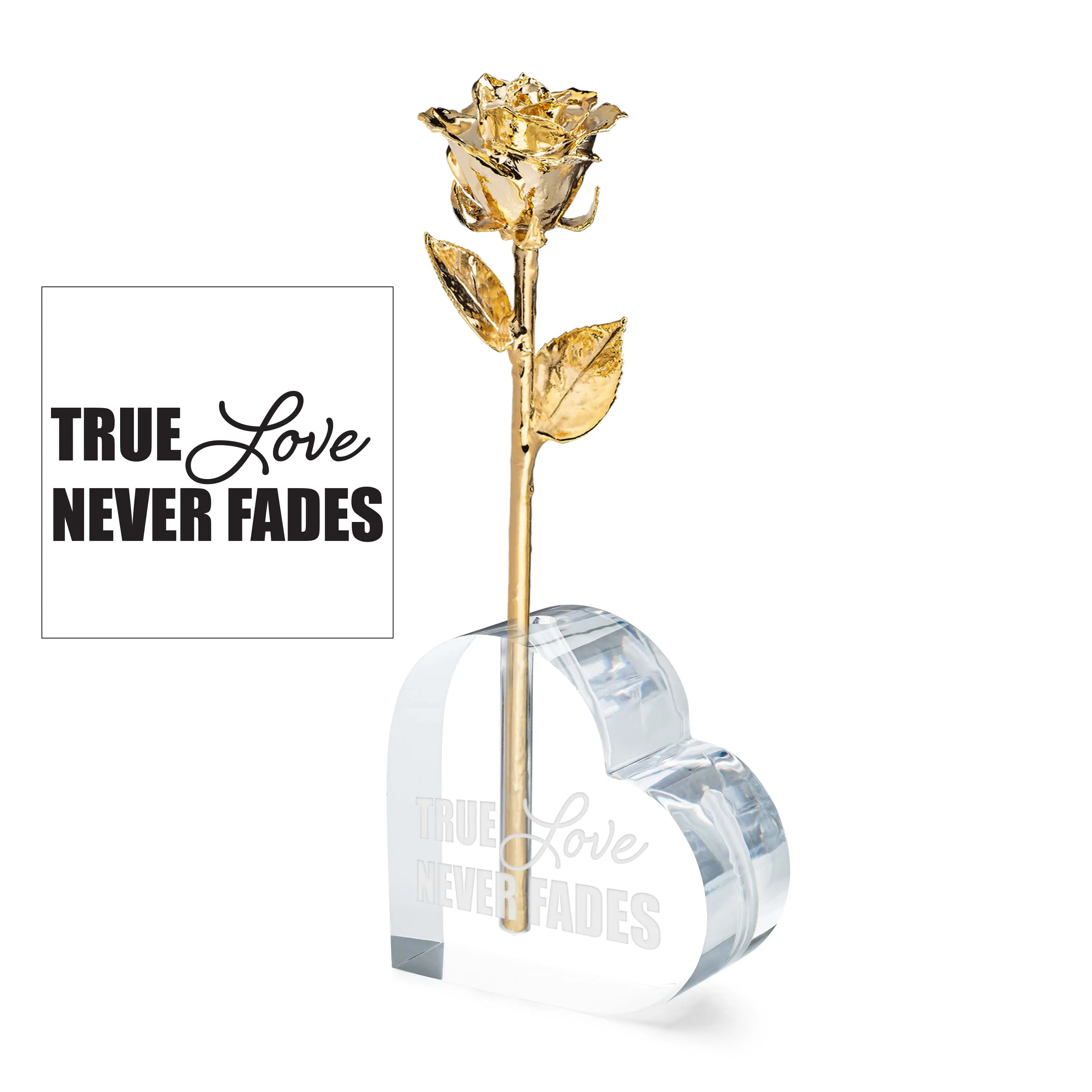 ·In The Box: Forever Rose, Engraved Acrylic Heart Vase, Gold Gift Box & Bow, Certificate of Authenticity