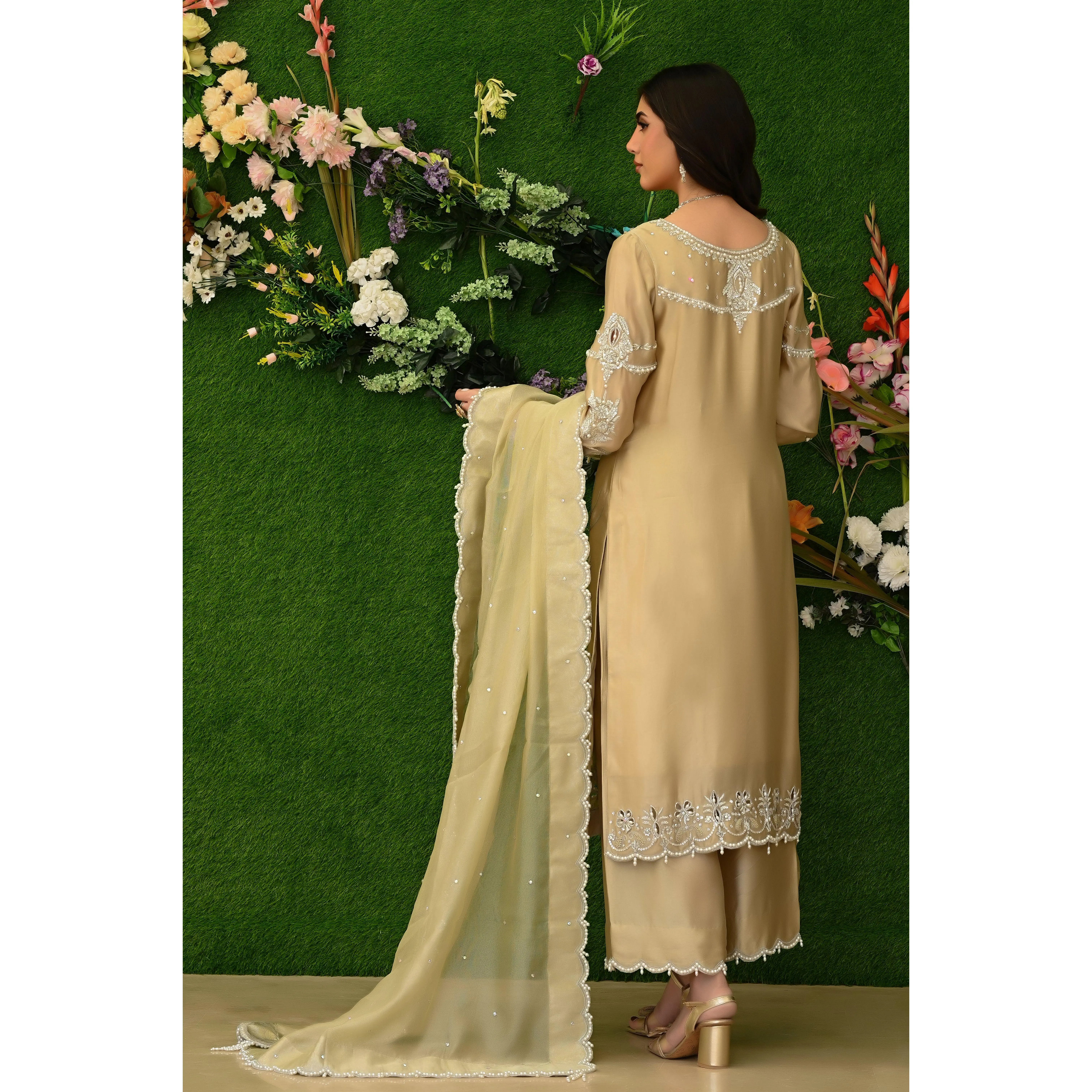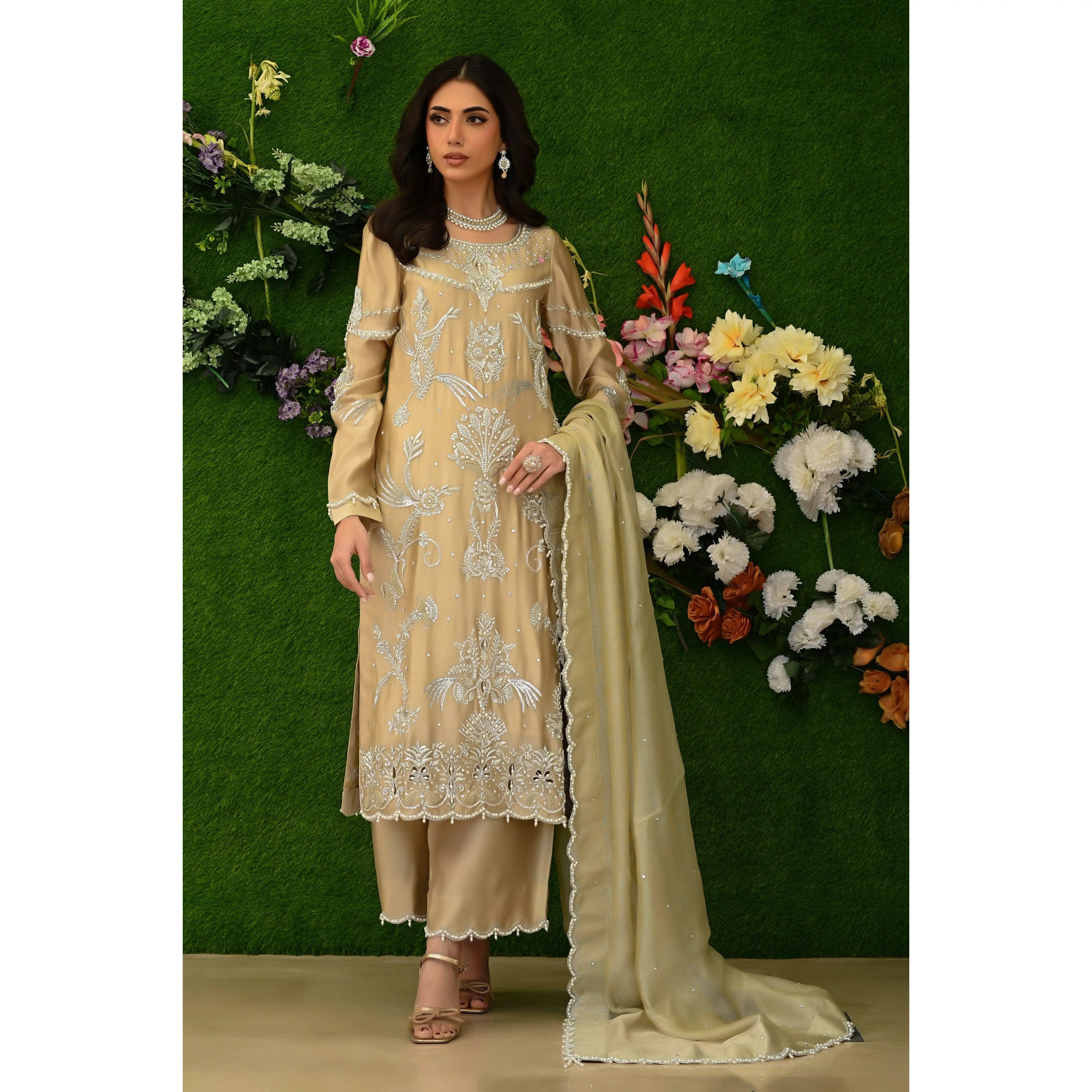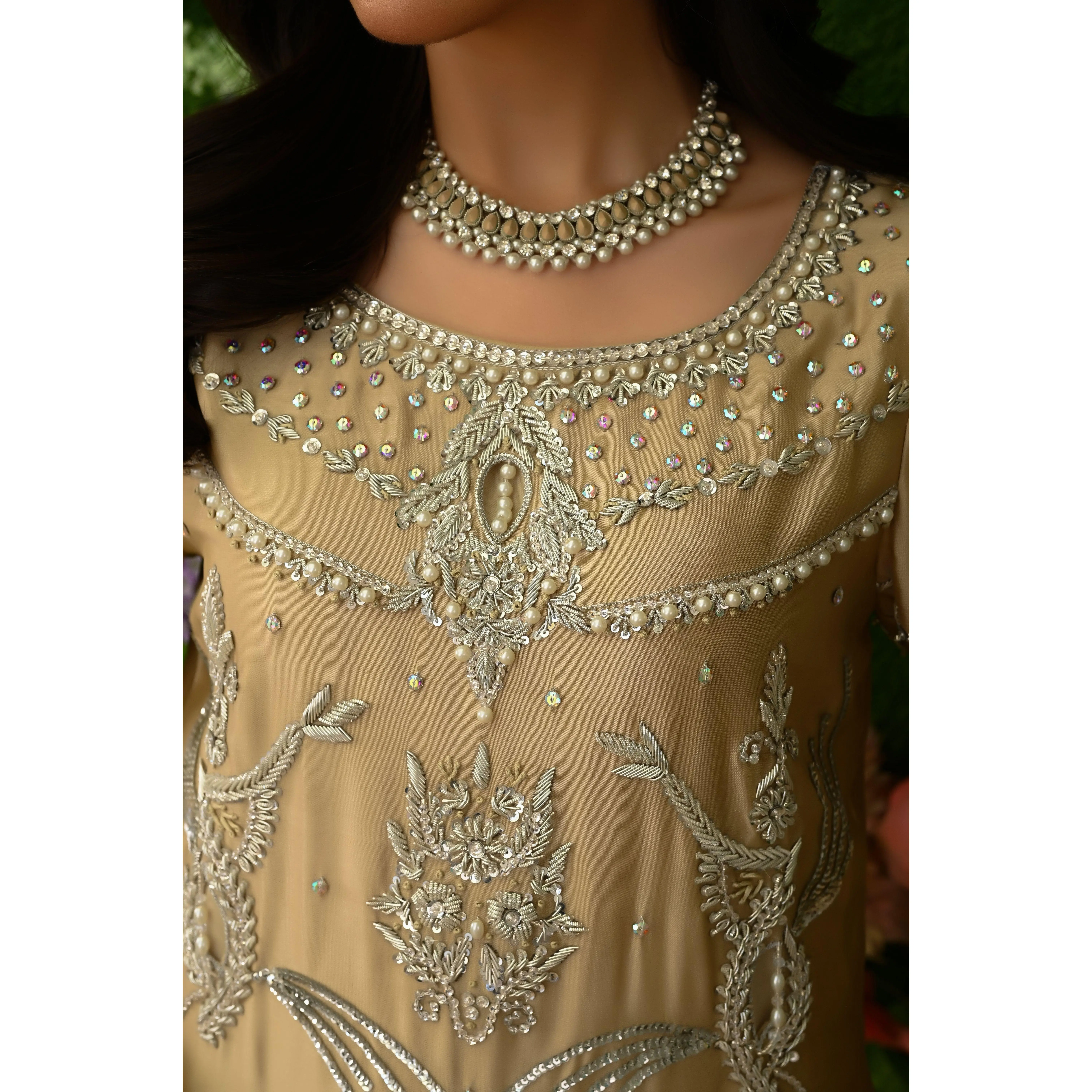 Get ready to be the centre of the attention with the most alluring shade of the season. The balance of traditional with a touch of modern makes this outfit so very unique. fully embellish silhouette pursue the enchanting combination of silver dabka and pearl work on all over shirt and sleeves. Pair your outfit with the wide leg pants and high heels for that ultimate contemporary glam look.