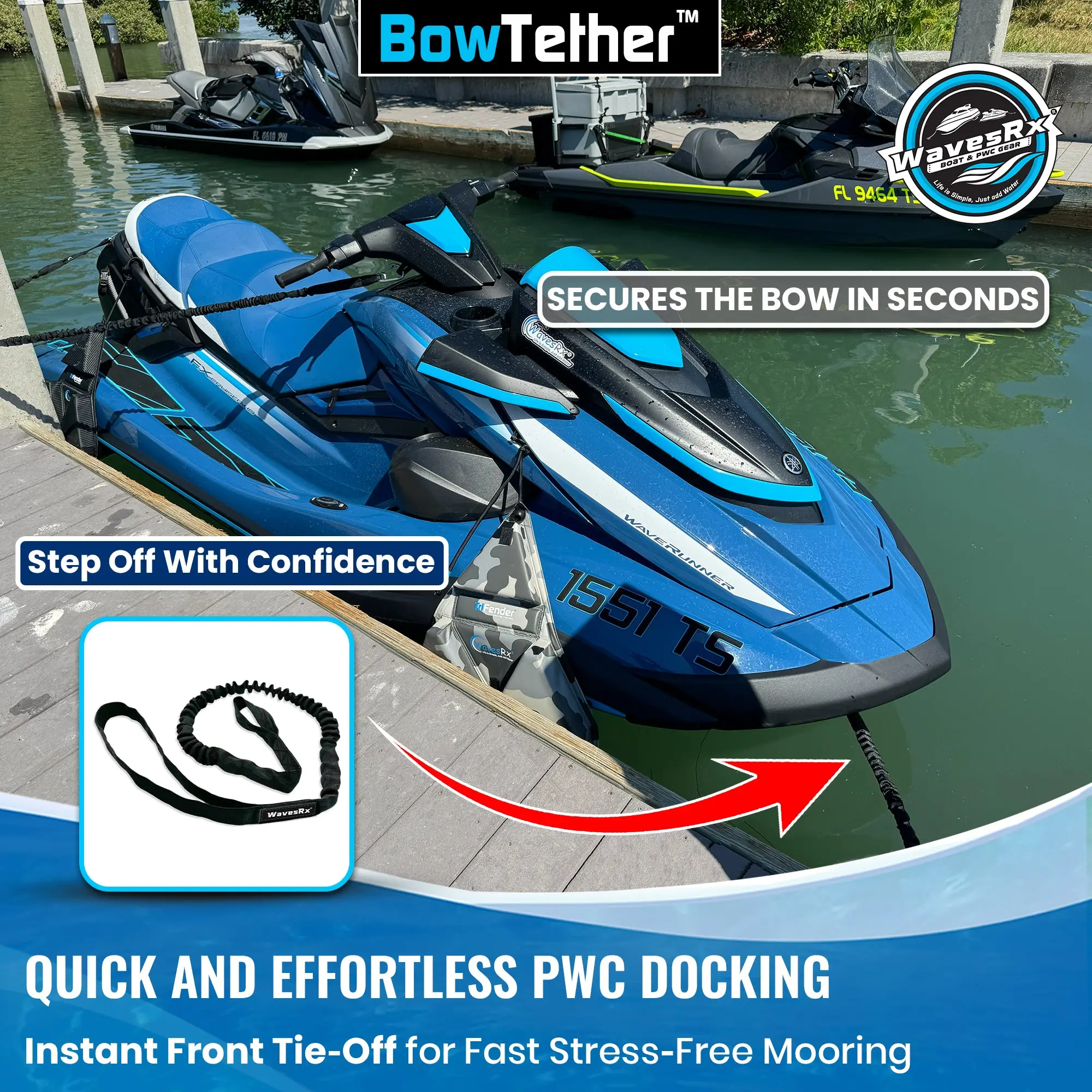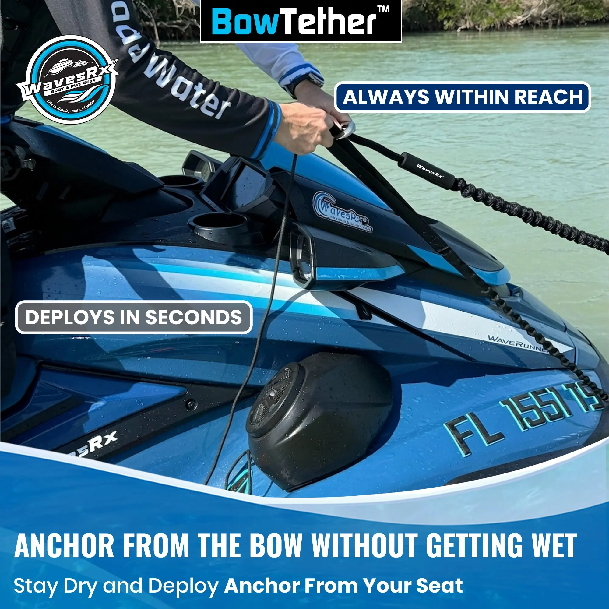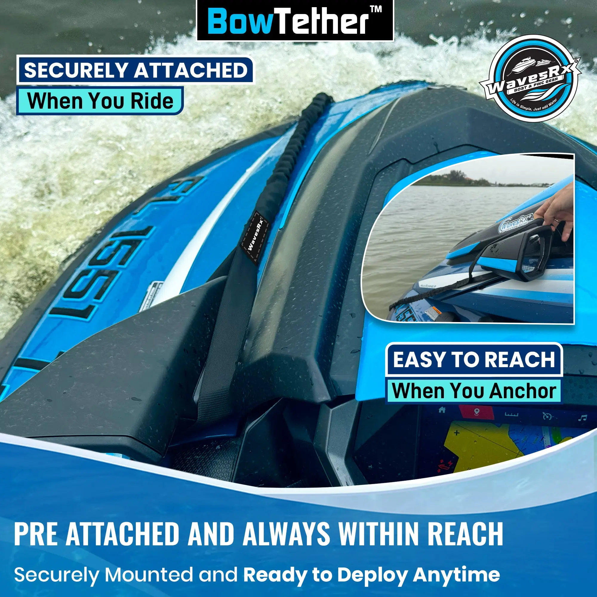 EASY JET SKI ANCHORING - With the WavesRx BowTether, you can anchor your jet ski without getting wet. Simply remove the large BowTether loop from the side mirror, attach your anchor line to it, and throw it into the water. The opposite end is permanently secured to your bow, making PWC anchoring a breeze.