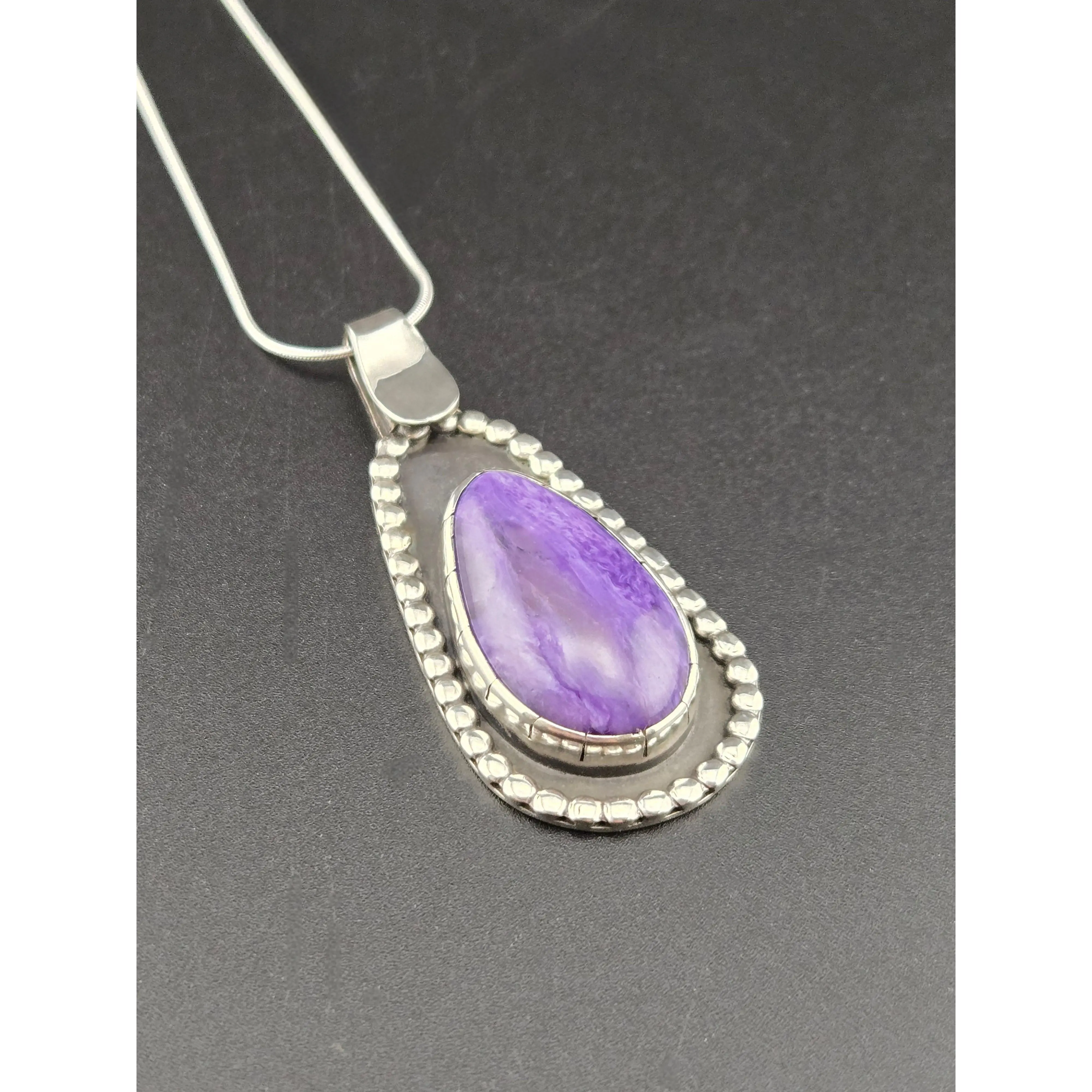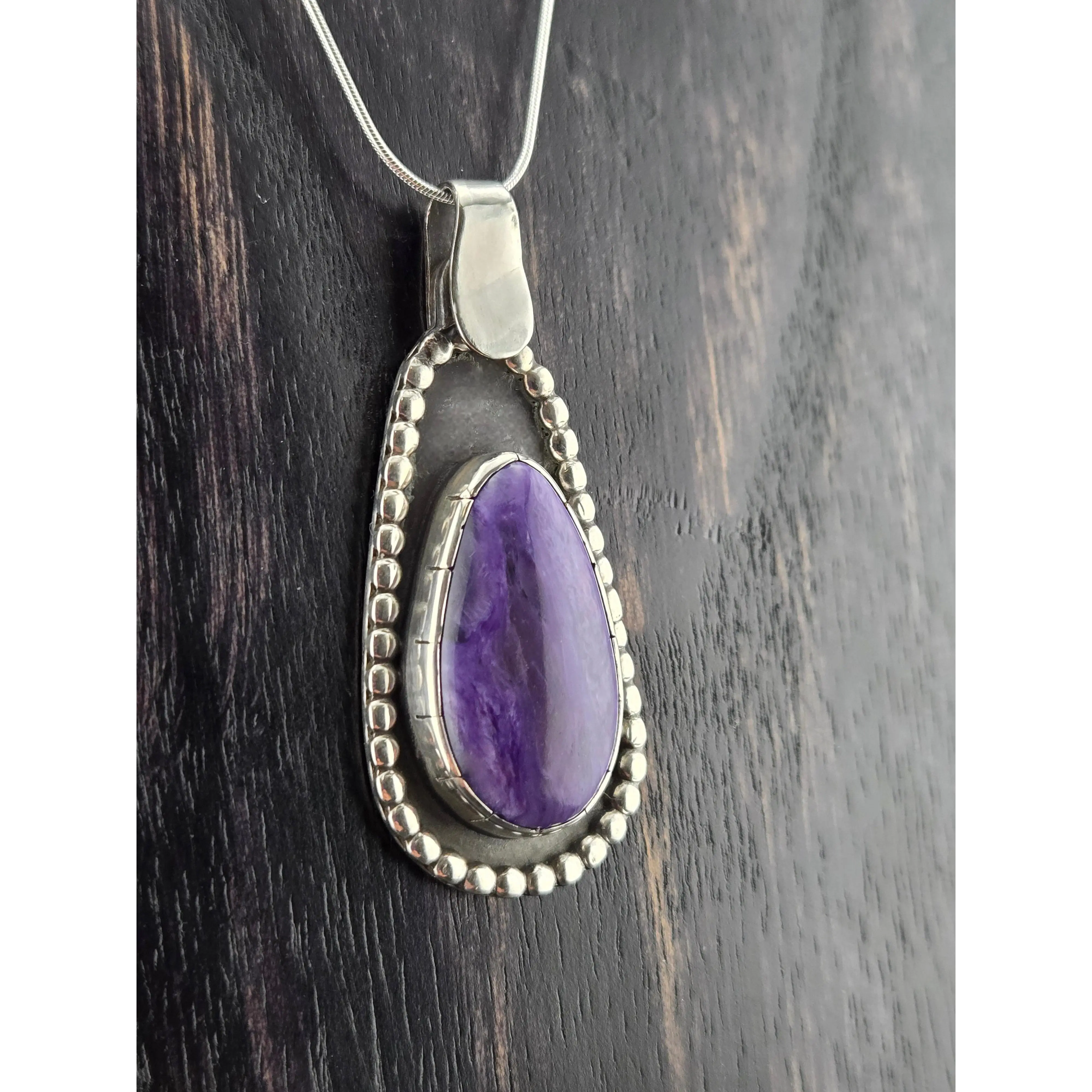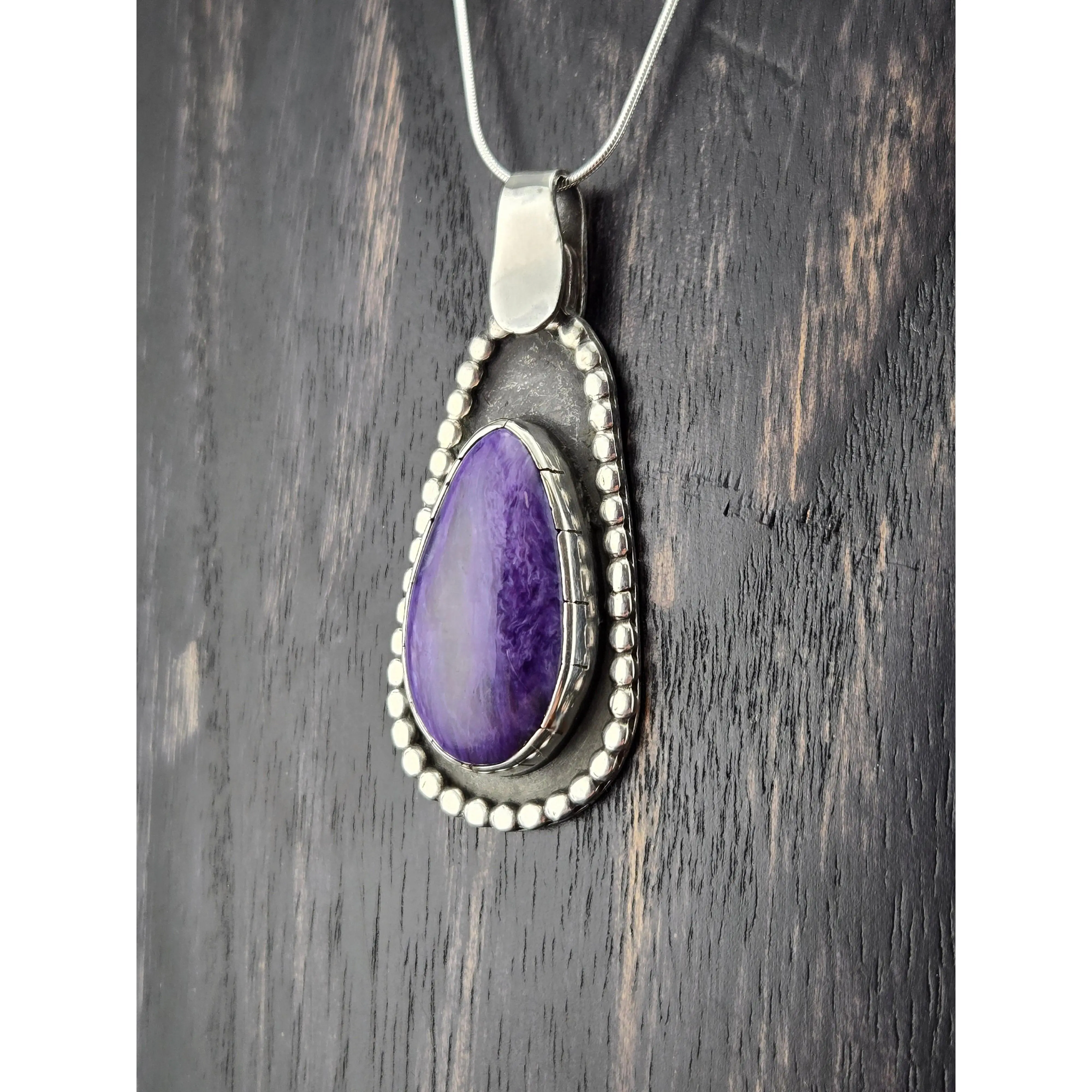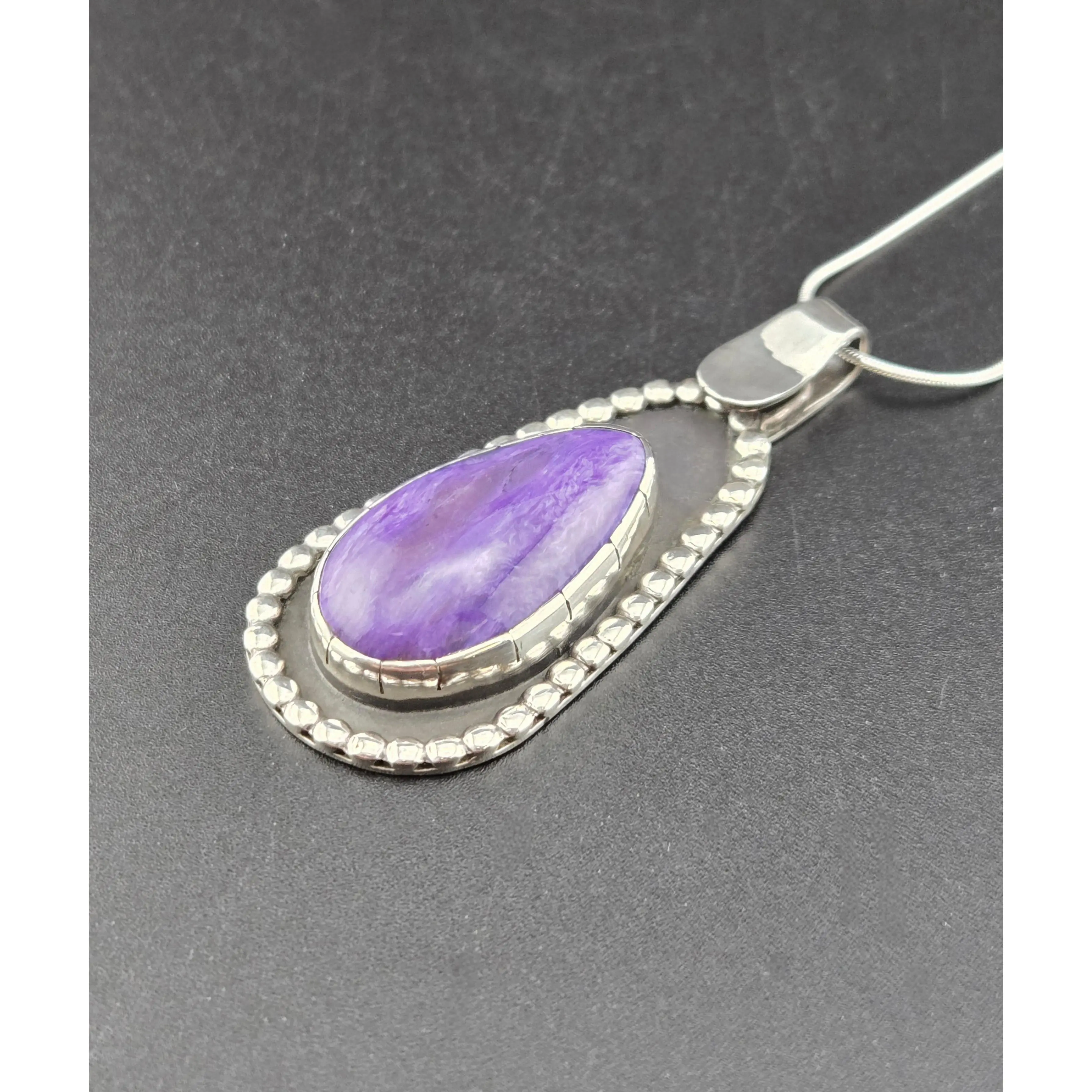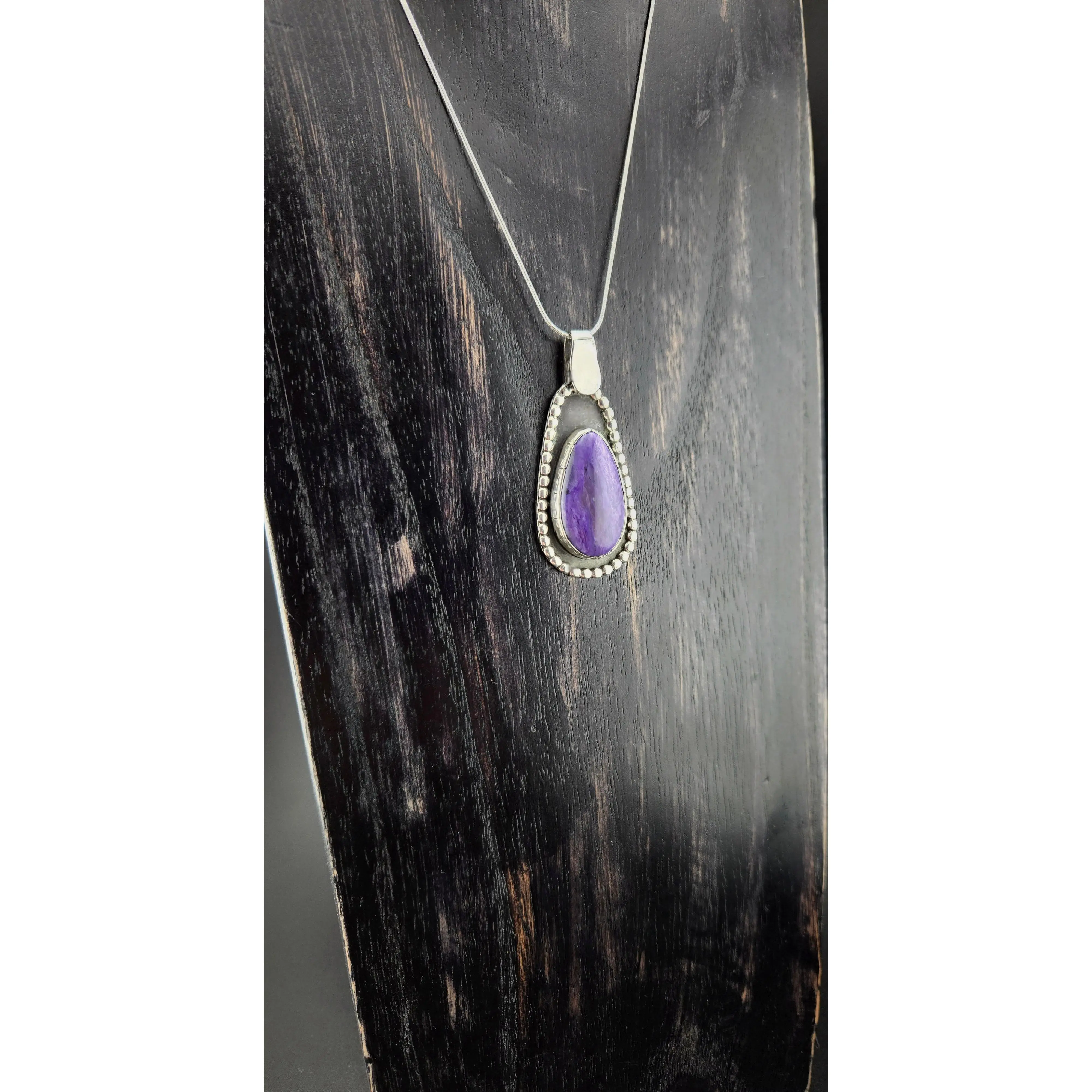 Charoite comes all the way from Serbia, Russia. It is unique, as it is not found anywhere else in the world. This beautiful mineral is handcut in house. Set with original design in .925 sterling silver. Comes with sterling silver snake chain. One of a kind.