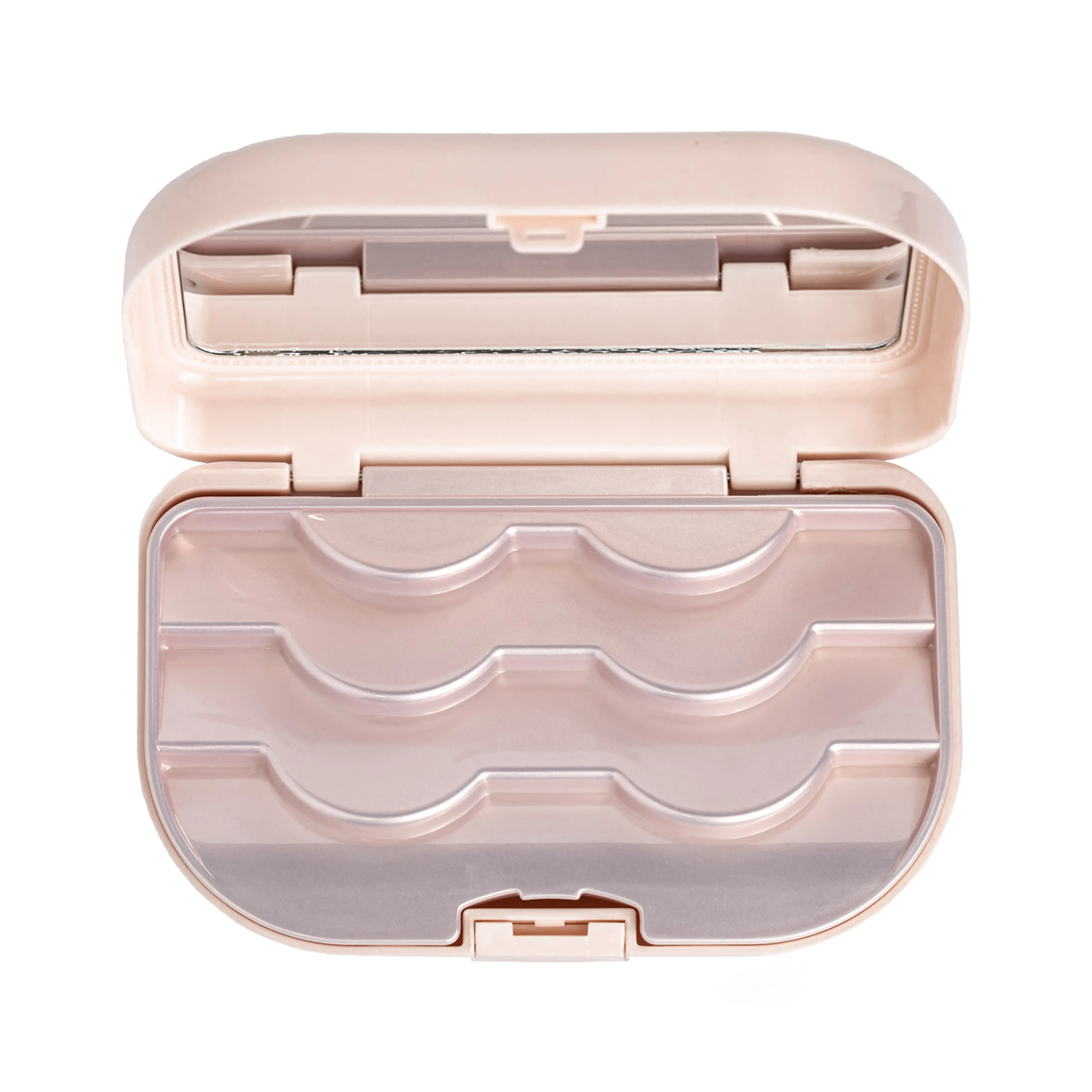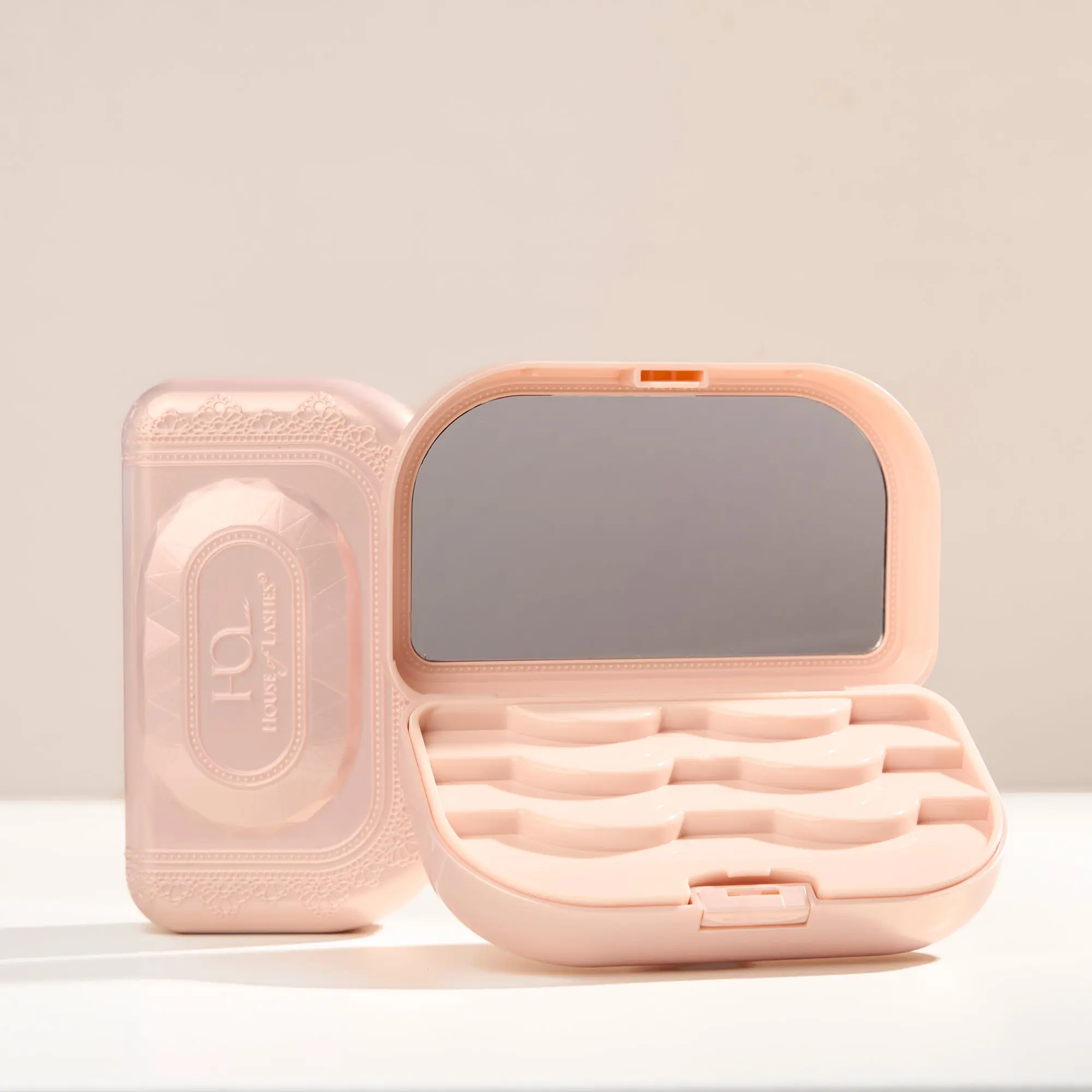 A compact double-layered lash case in Blushing Pearl with a built-in mirror, designed to store up to three pairs of lashes plus glue and accessories for easy, on-the-go touch-ups.