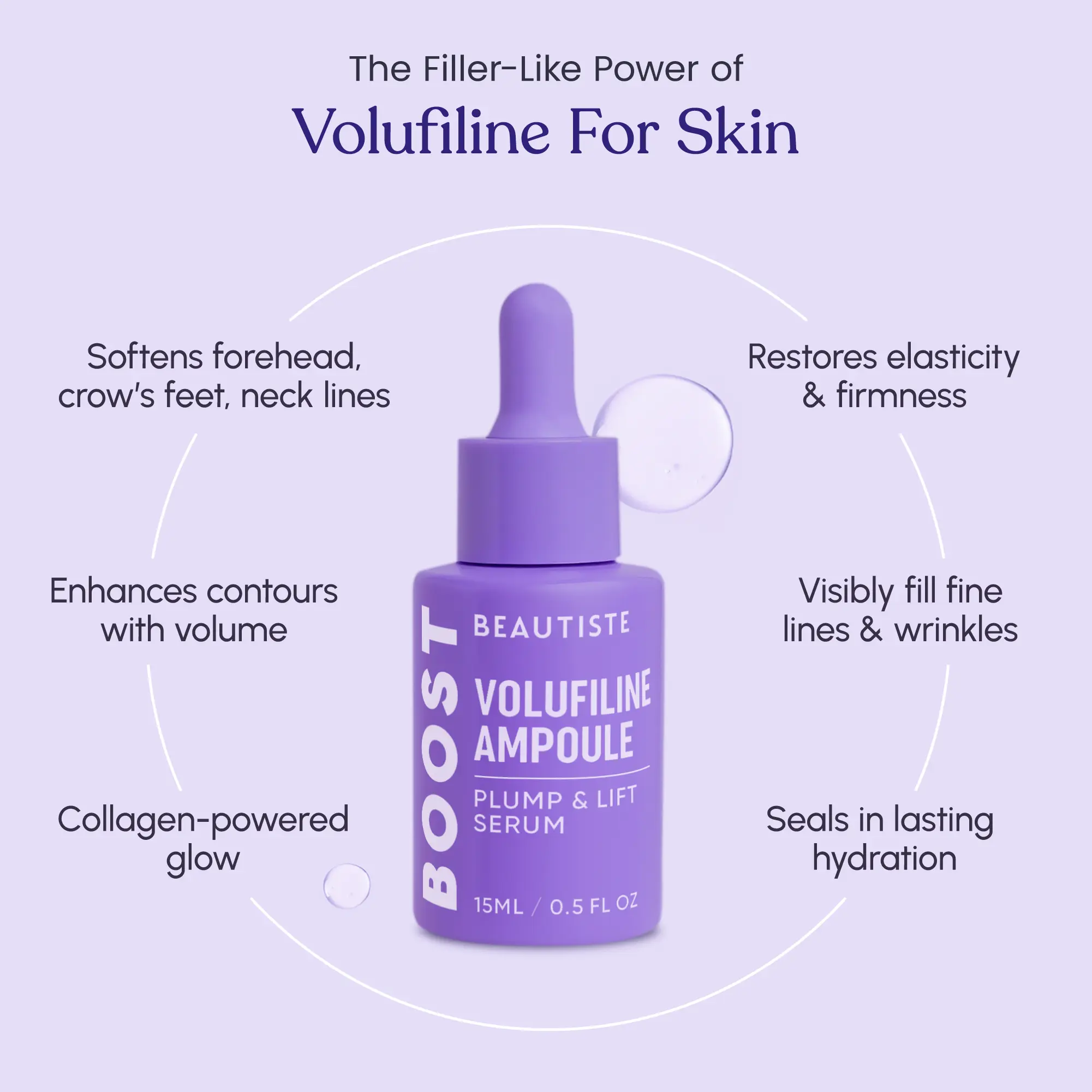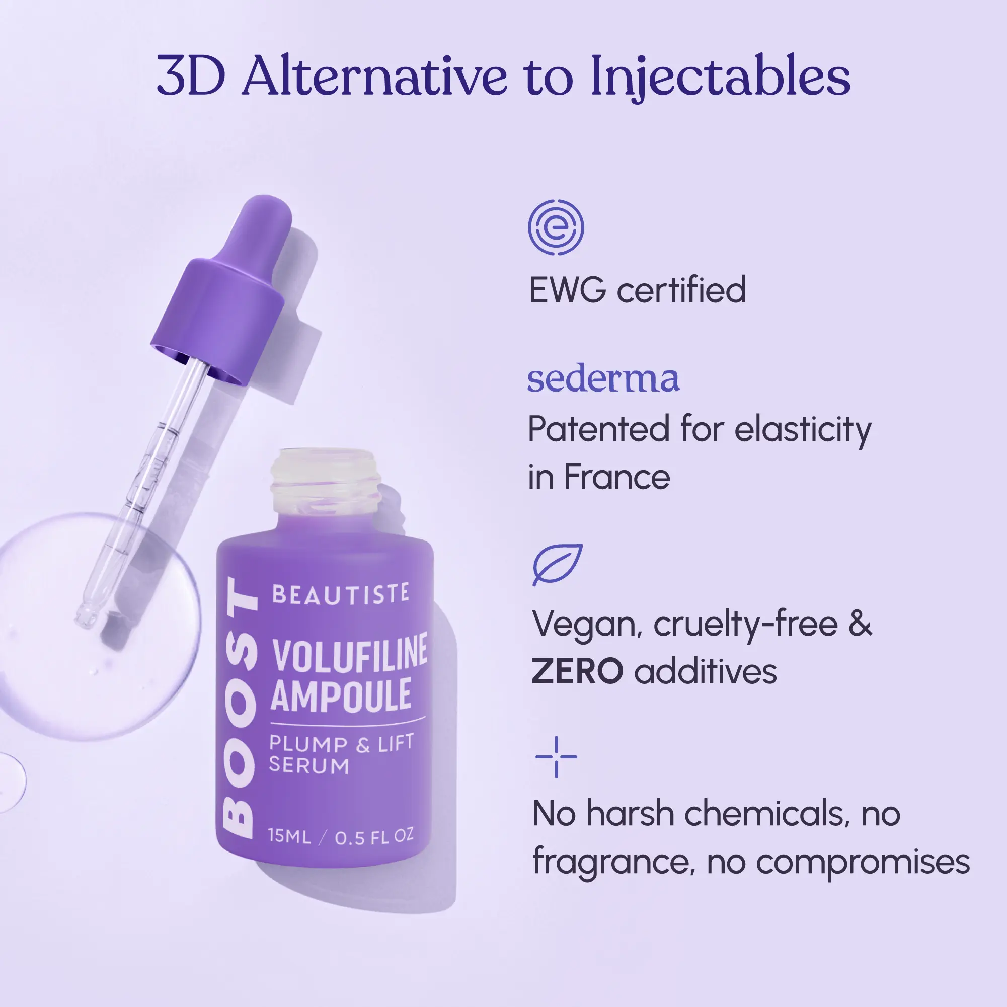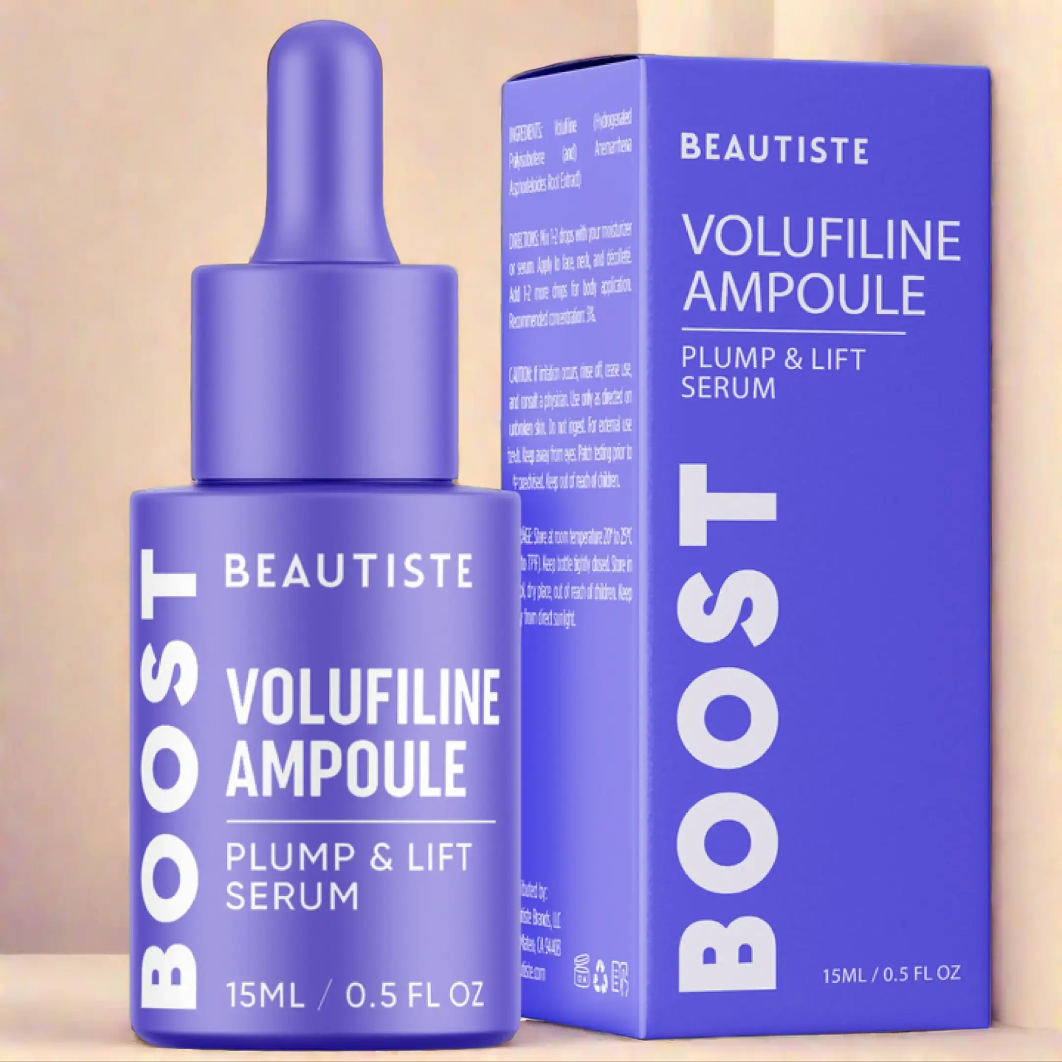 Beautiste PURE Volufiline Ampoule Plump & Lift Serum is a high potency, plant-based anti-aging serum that provides essential nutrients, plumps skin, reduces wrinkles, and enhances skin elasticity. It is suitable for daily use on the face, neck, and décolletage. With its patented ingredients, it delivers visible results in just 28 days.
