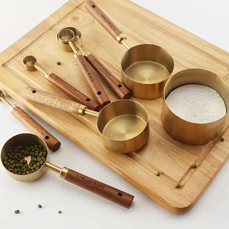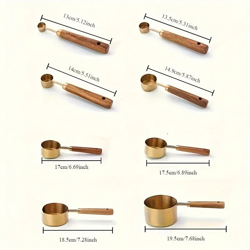 5. 8 Pcs Measuring Spoon Measuring Cup Set with Wooden Handle,Space-saving Nesting Design,Suitable for Seasoning,Powder and Coffee Metering,Durable,Rust-proof,Comfortable Grip,Home Supplies