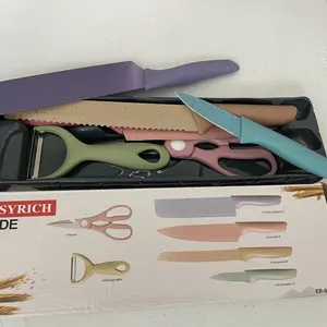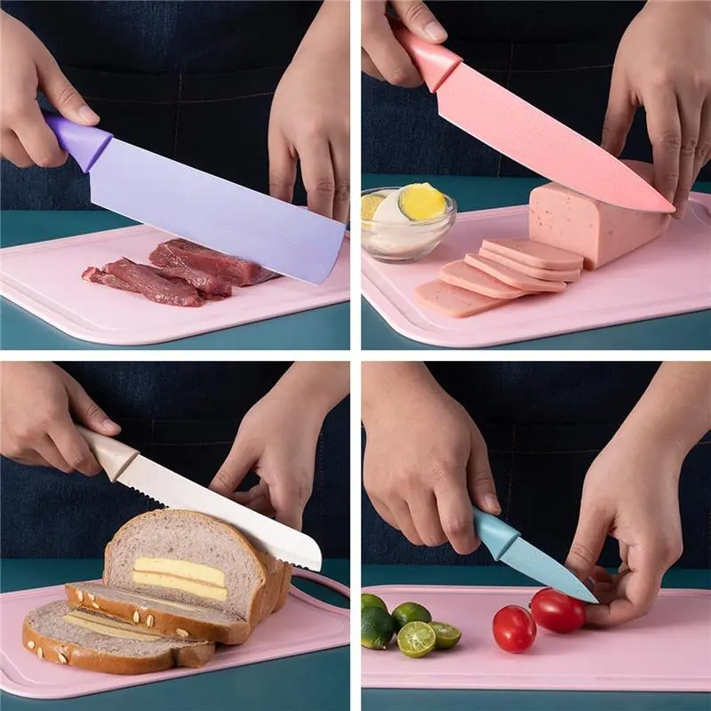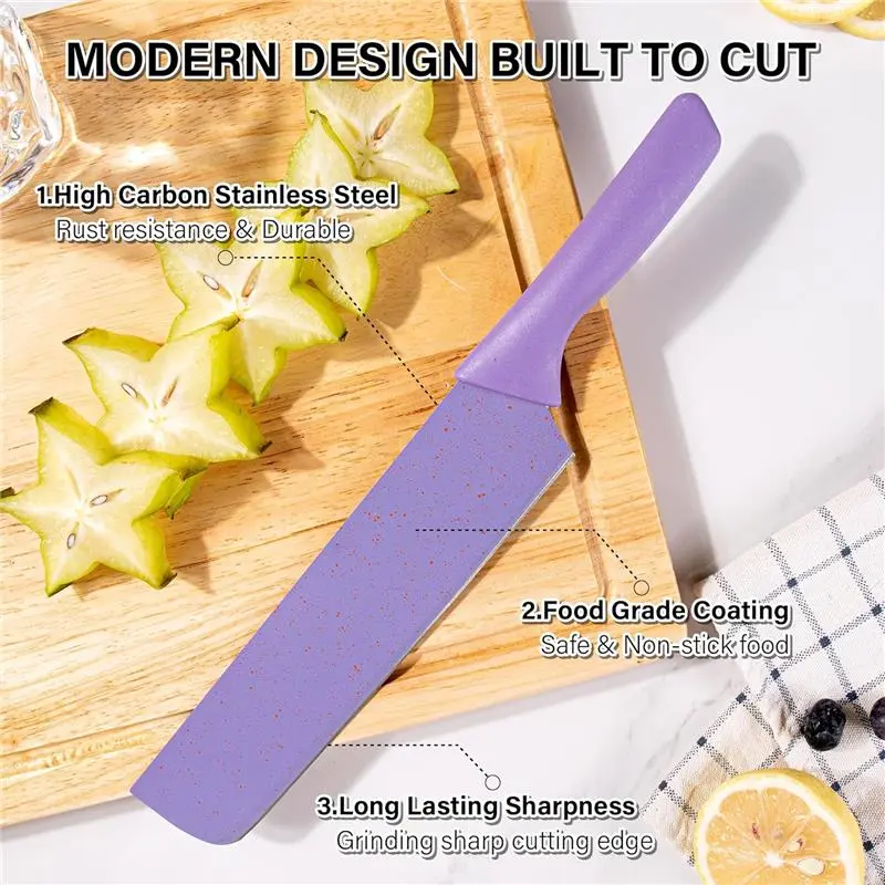 · 【Kitchen Knife Set of 6 Pieces Content】 The colorful knife set includes 1 x 7'' Cleaver knife, 1 x 7" Chef knife, 1 x 7'' Bread knife, 1 x Paring Knife, 1 x Peeler, 1 x Scissors. This multifunctional colorful knife could meet for all different in your daily life.