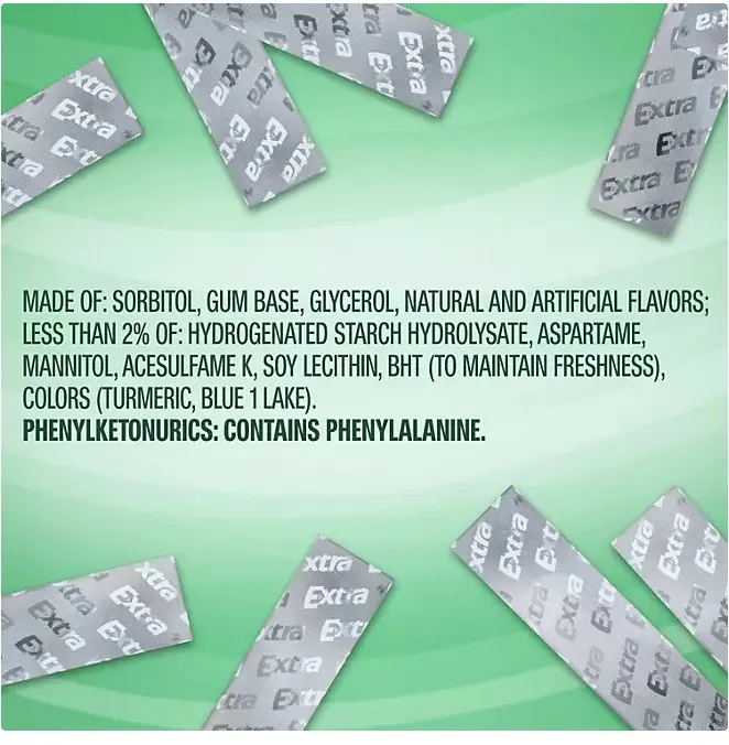 Ingredients: Sorbitol, gum base, glycerol, natural and artificial flavors; less than 2% of: hydrogenated starch hydrolysate, aspartame, mannitol, acesulfame k, soy lecithin, bht (to maintain freshness), colors (turmeric, blue 1 lake). Phenylketonurics: Contains Phenylalanine.