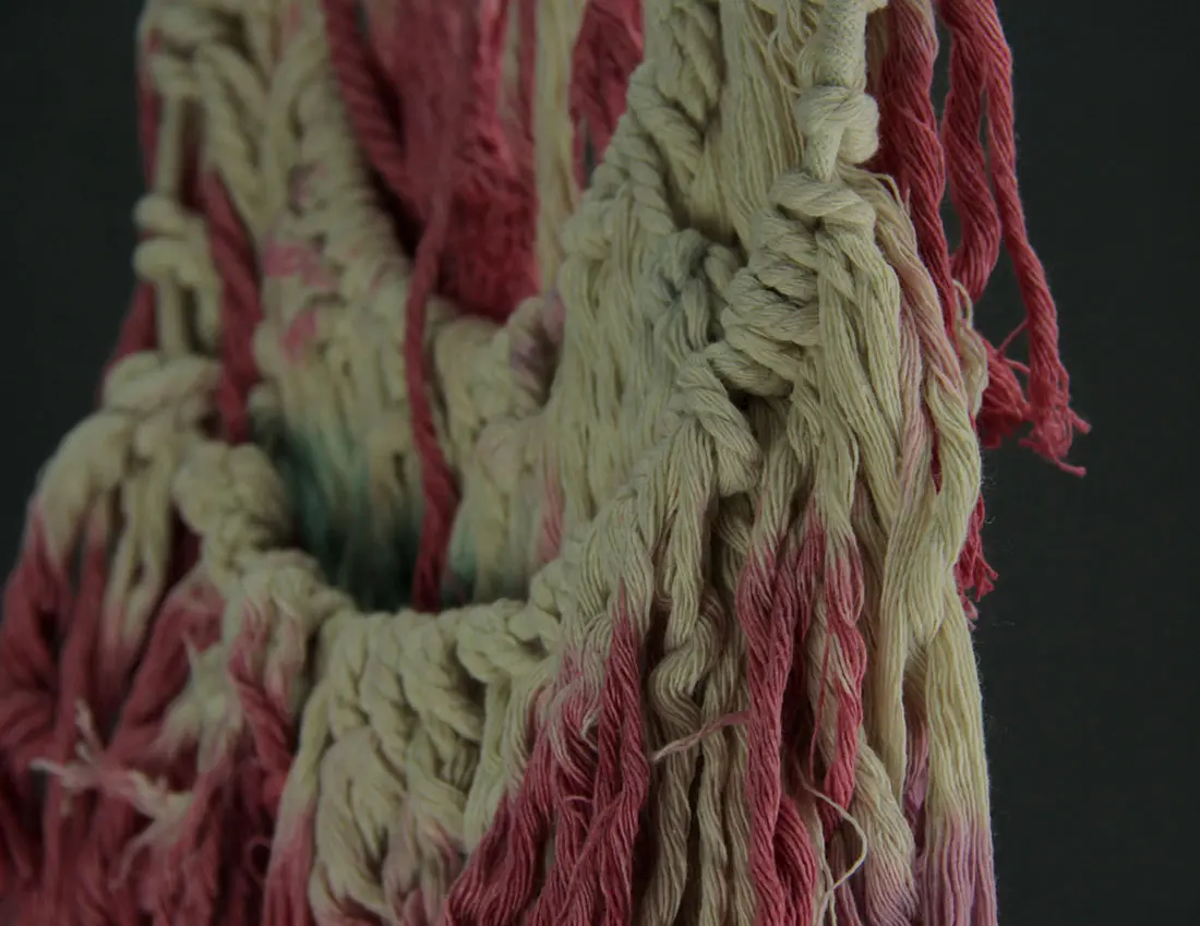 It is made using natural cotton rope hand tied to a cotton covered metal ring and dip dyed by hand in a two-tone pink and bright blue finish.