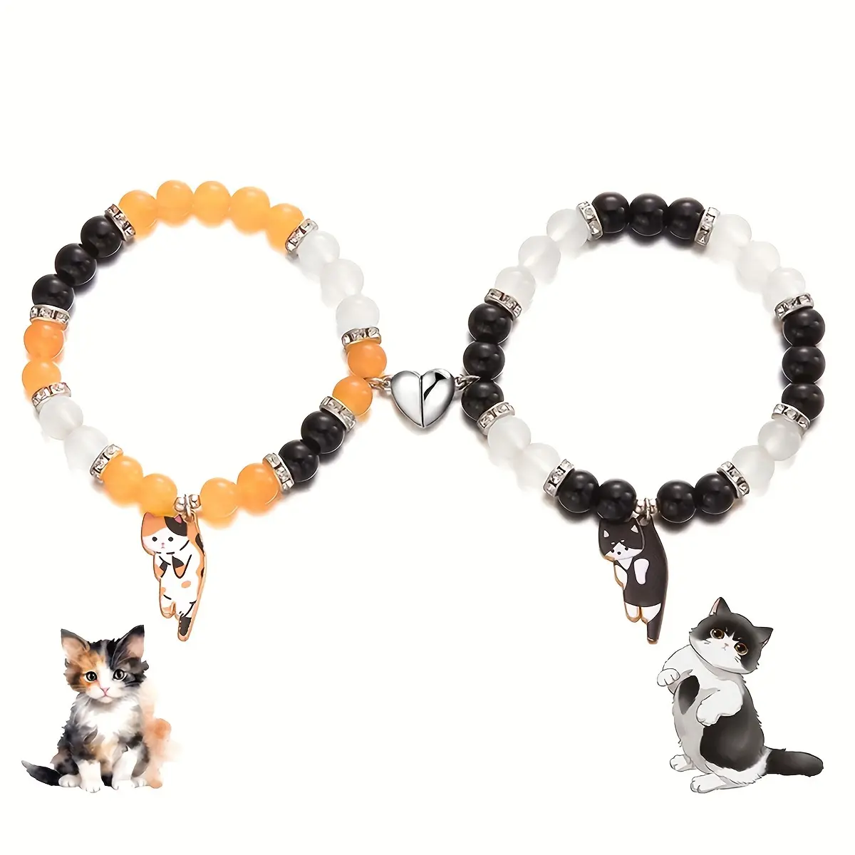 2pcs Magnetic Couple Bracelets with Cat Charms, Romance Style, Matching Friendship Bracelet Set with Heart Pendant, Creative Gift for Cat Lovers