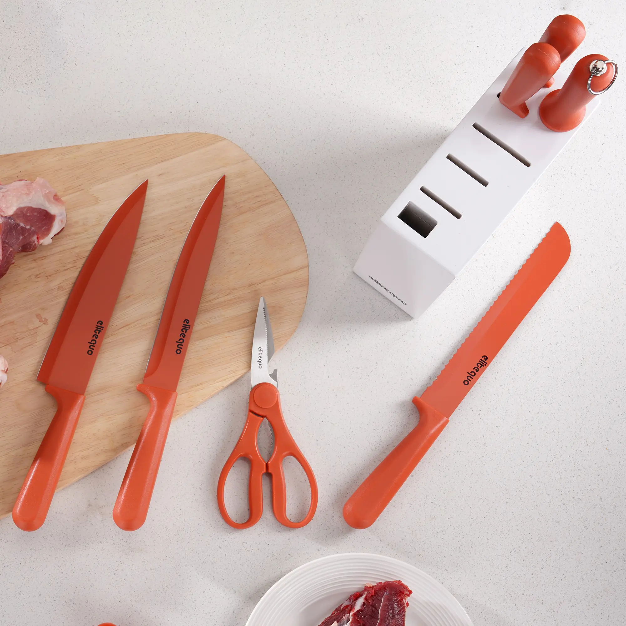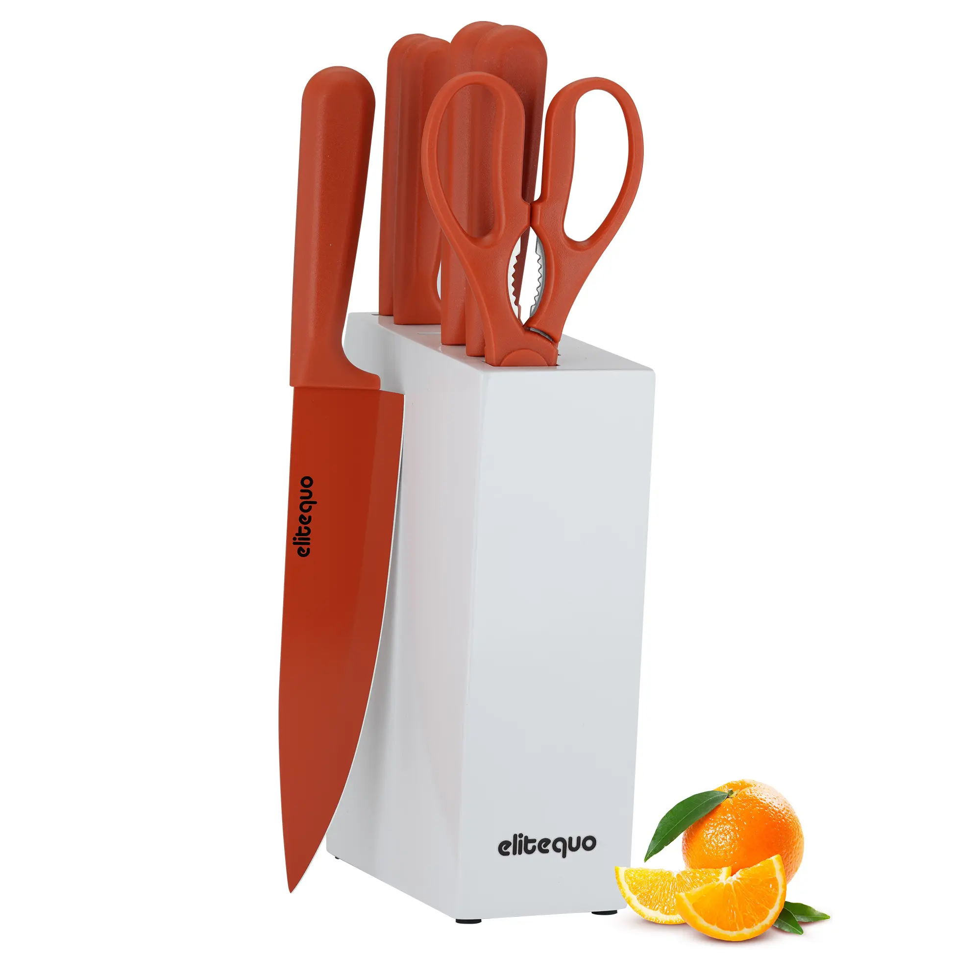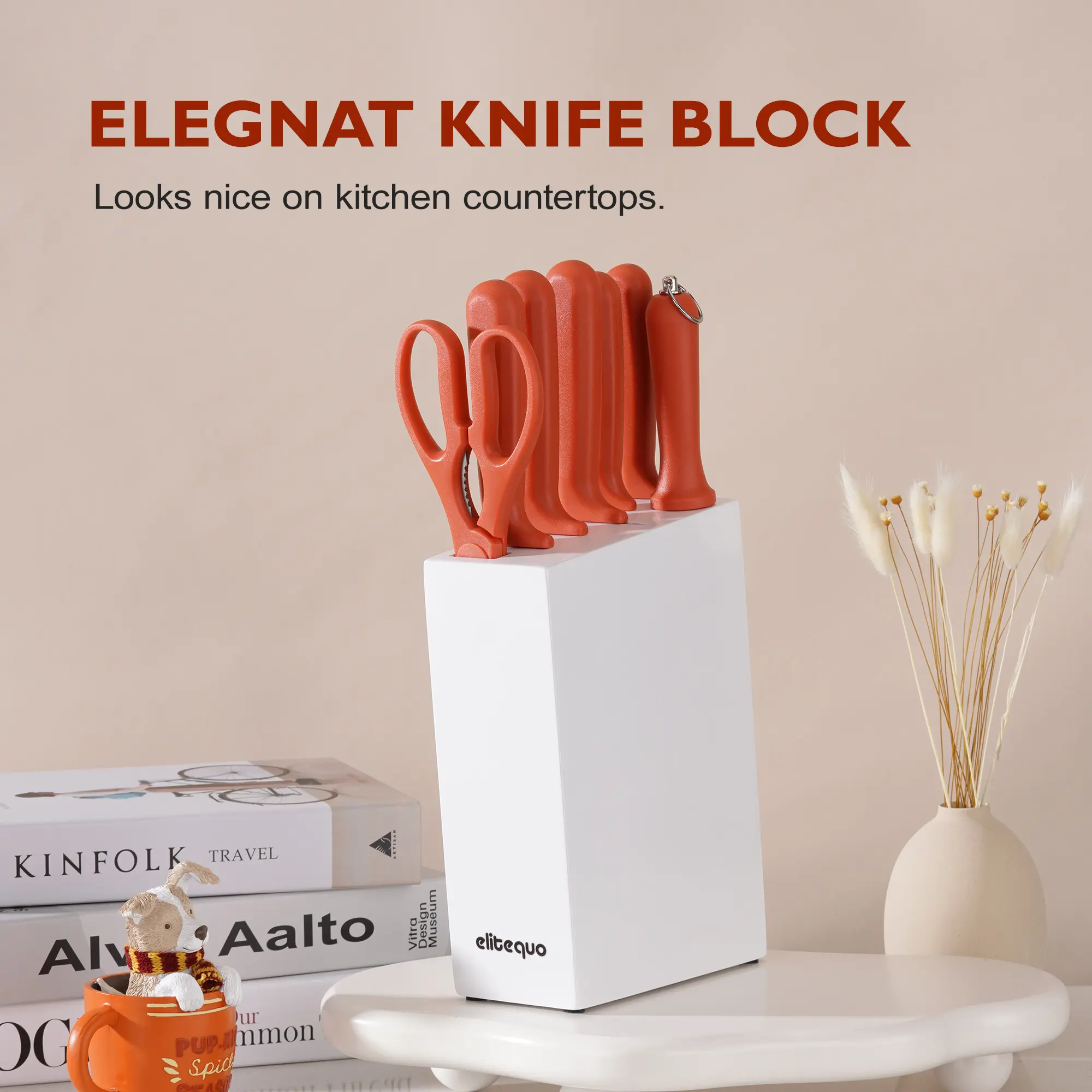 Elevate your kitchen with the ELITEQUO 8 Pieces Knife Set with Block, combining style, durability, and practicality in one elegant package.